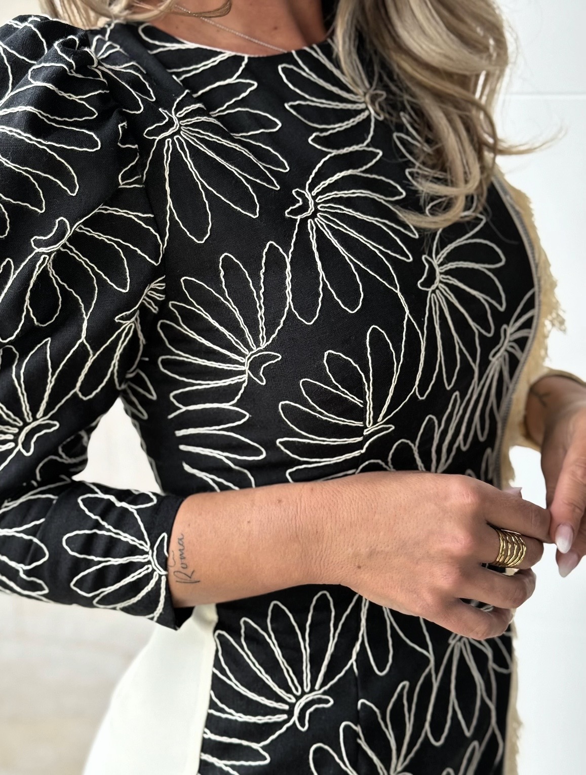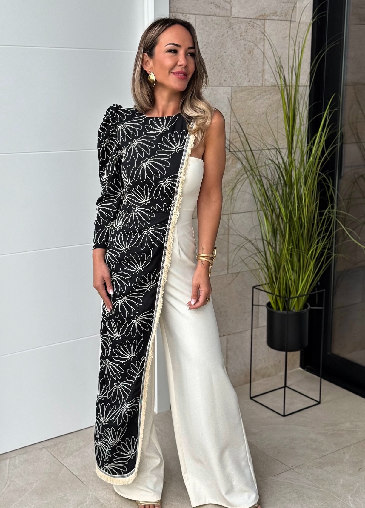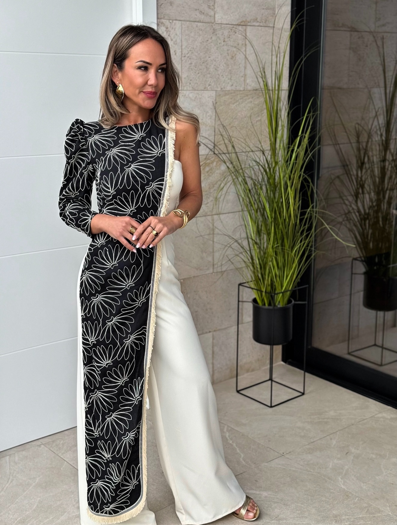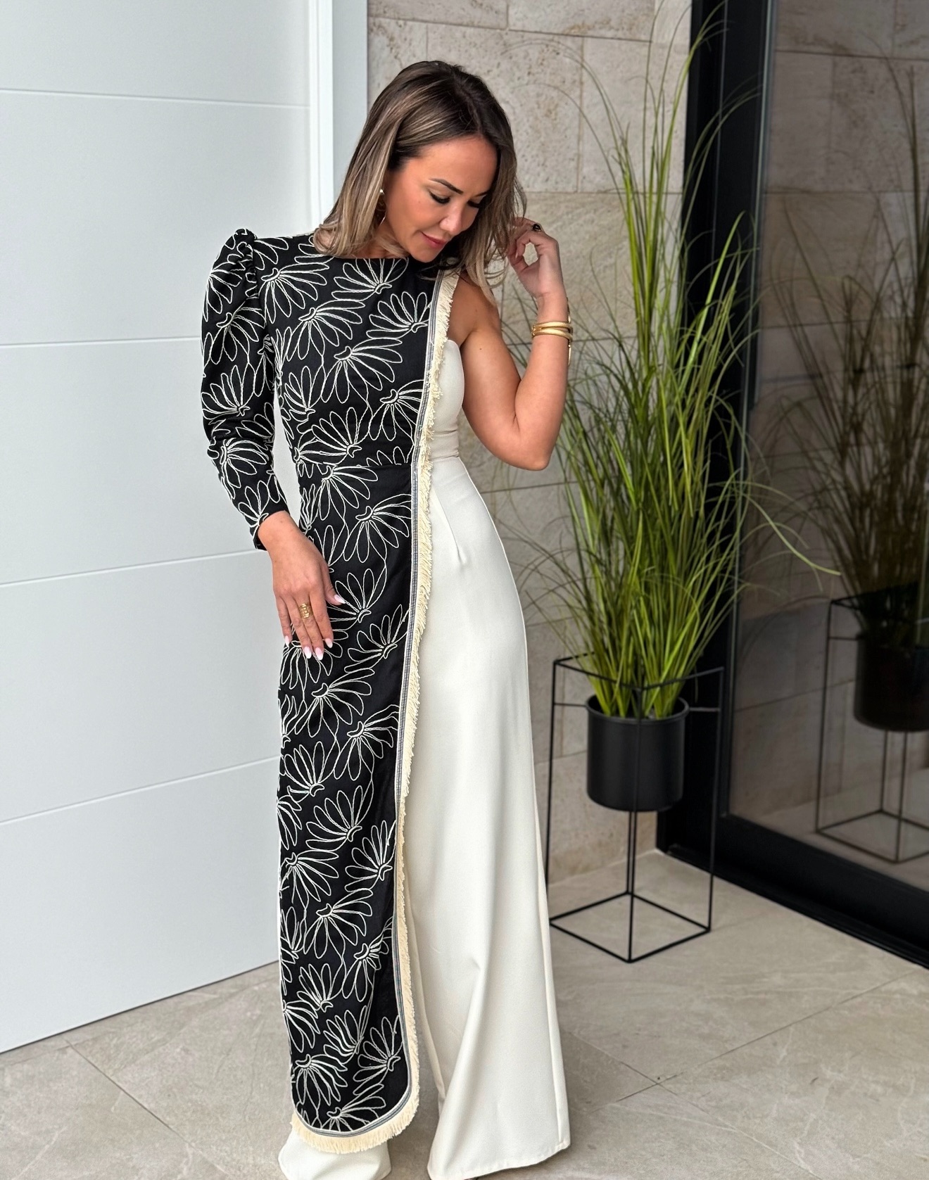 Mono largo asimétrico con una manga abullonada cremallera detrás con doble tela estampada medio largo y flequitos.