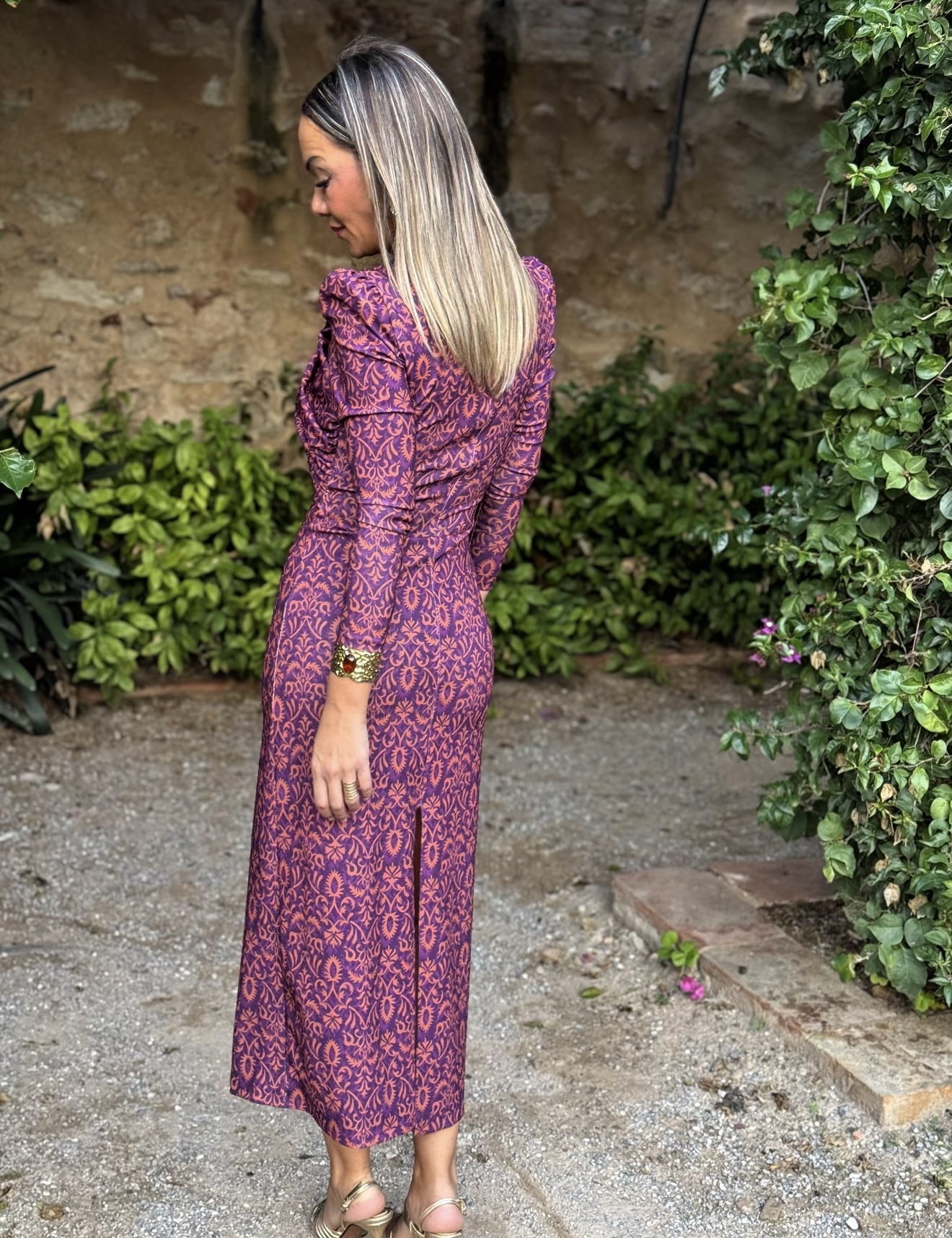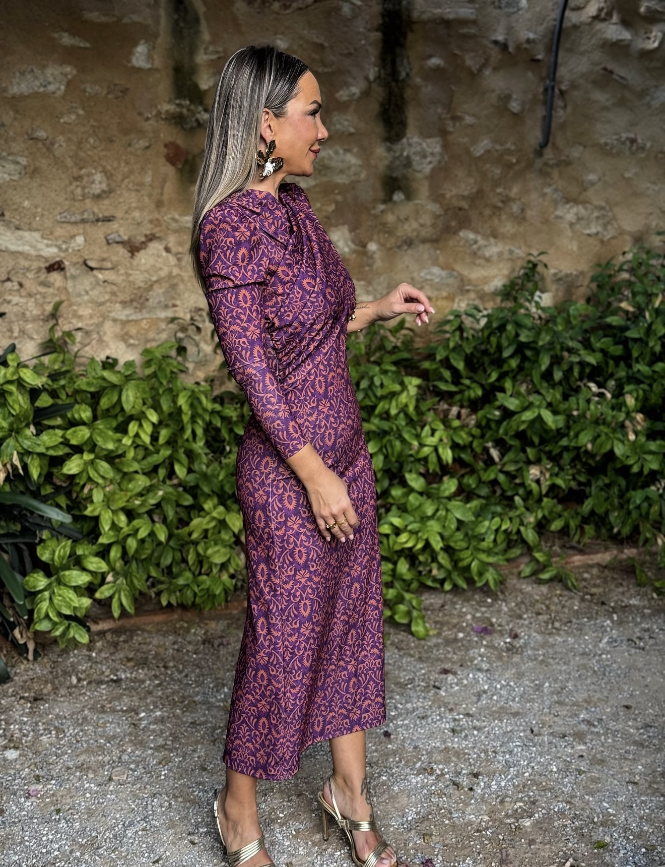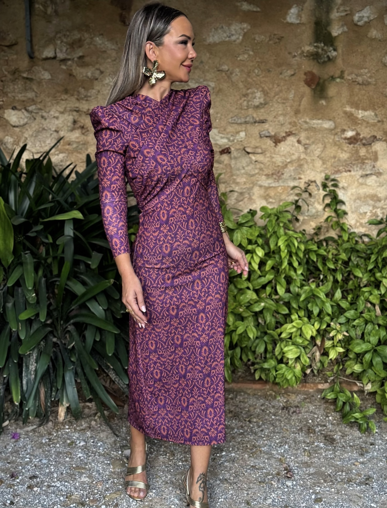 Vestido midi manga larga con corte y cremallera detrás, detalle tela drapeada con cruzado en escote.