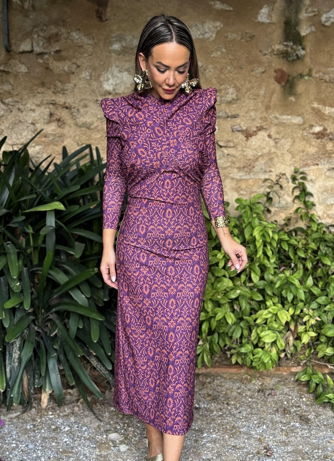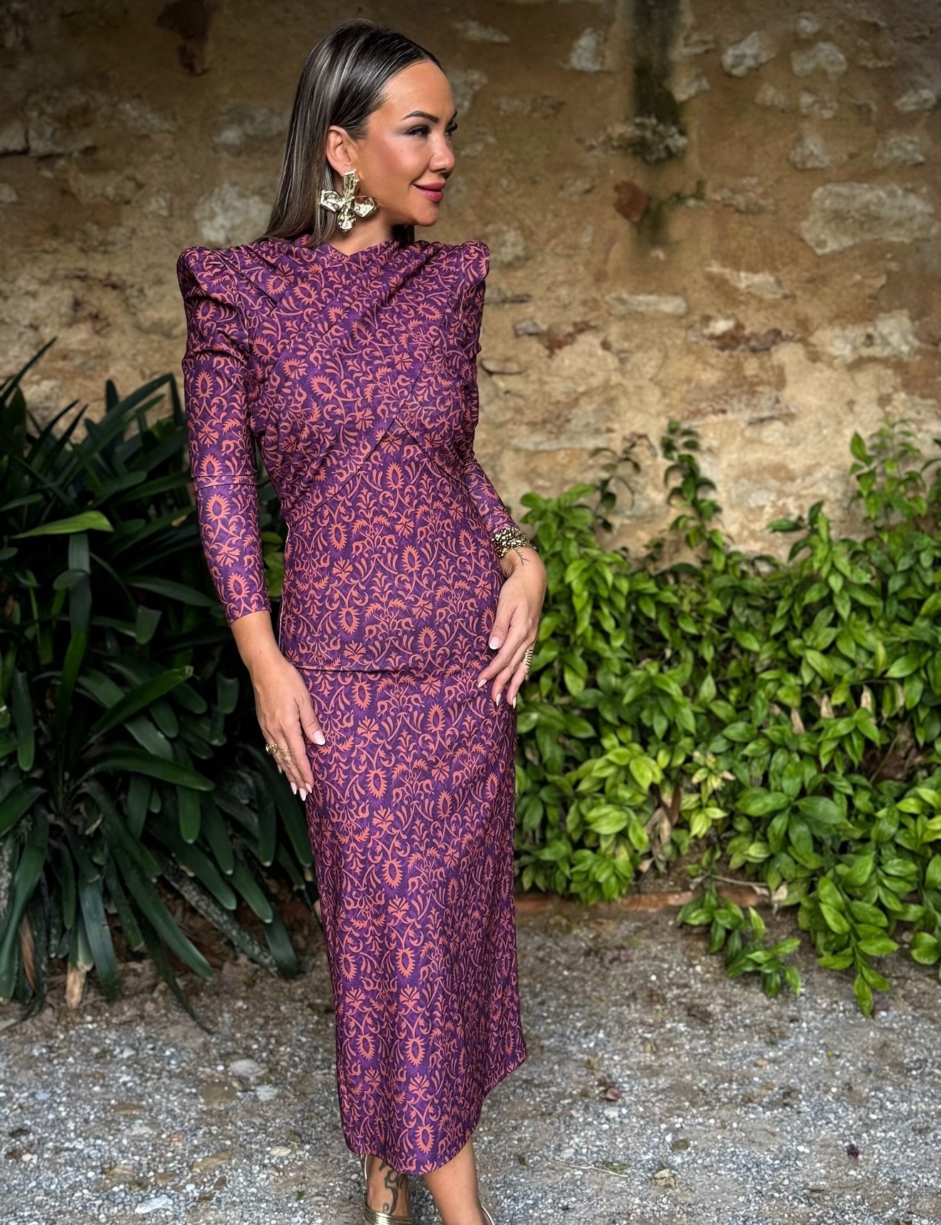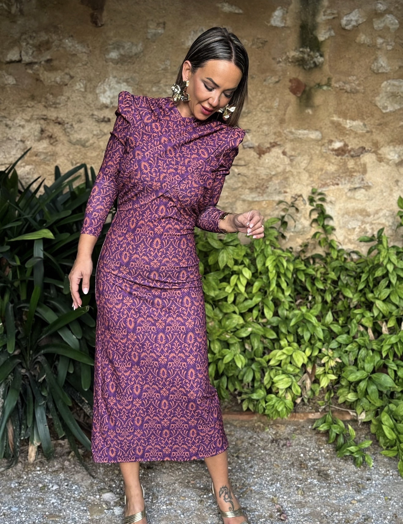 Vestido midi manga larga con corte y cremallera detrás, detalle tela drapeada con cruzado en escote.