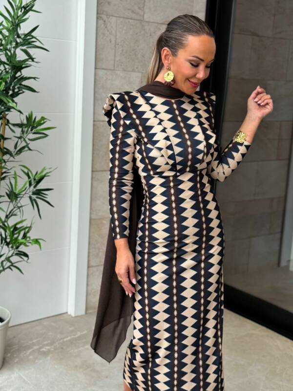 Vestido midi manga larga con corte y cremallera detrás, detalle tela drapeada con cruzado en escote.