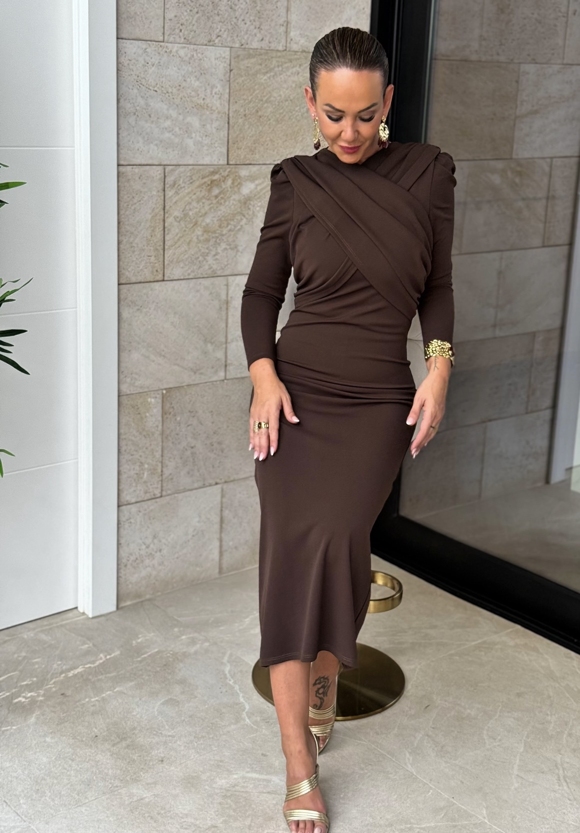 Vestido midi manga larga con corte y cremallera detrás, detalle tela drapeada con cruzado en escote.