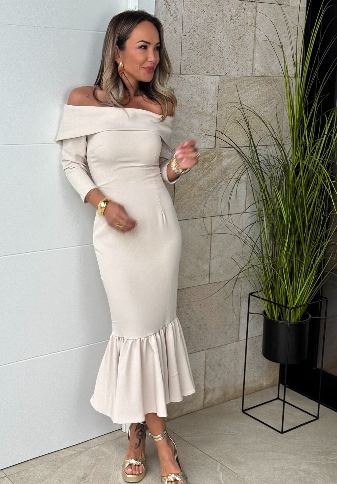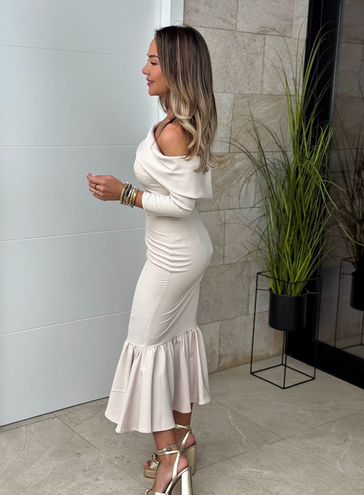 Vestido Bardot Cuello Beige