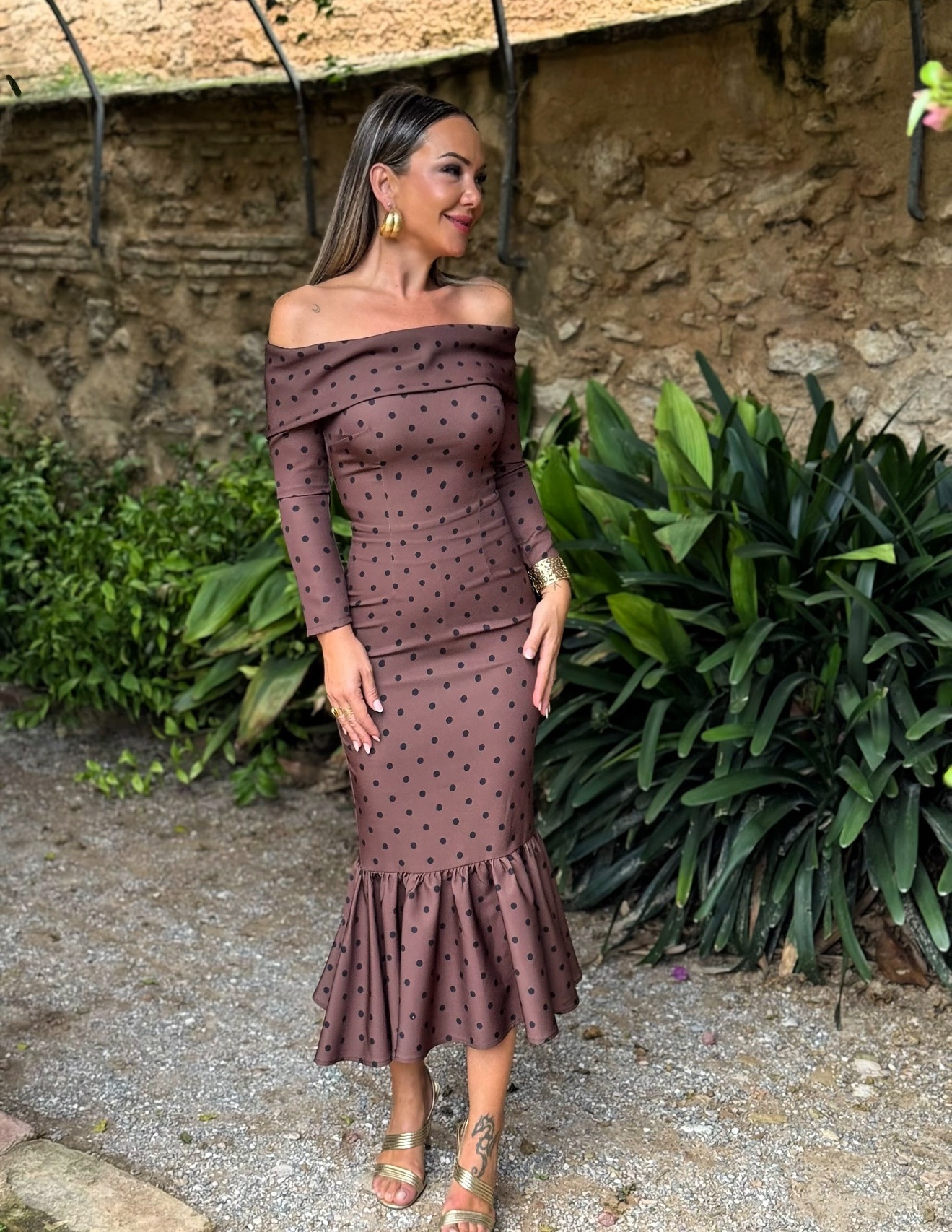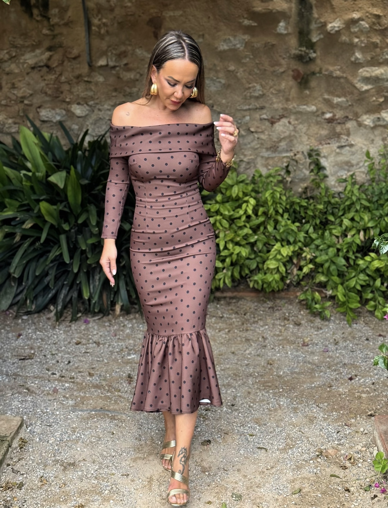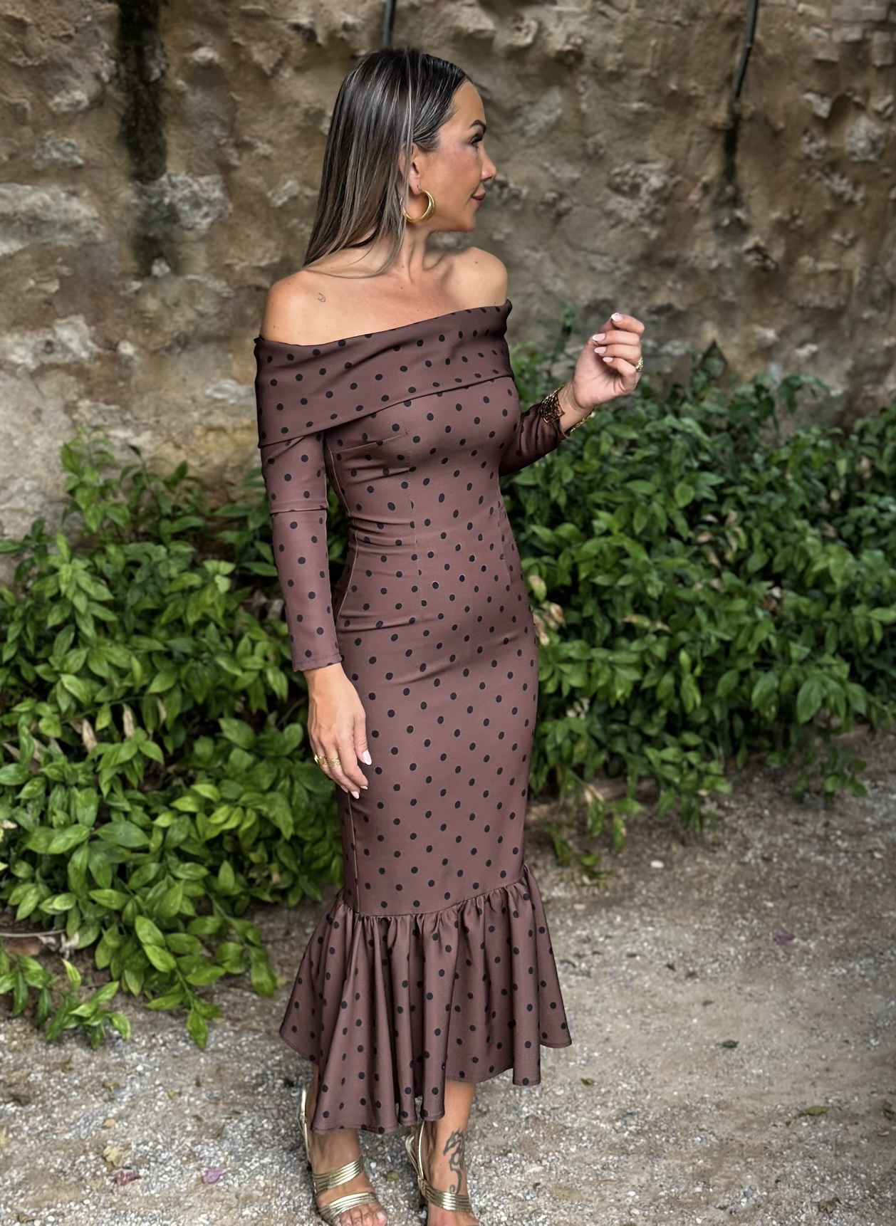 Vestido midi manga larga cuello bardot vuelto con cremallera y forro, volante baño grande.