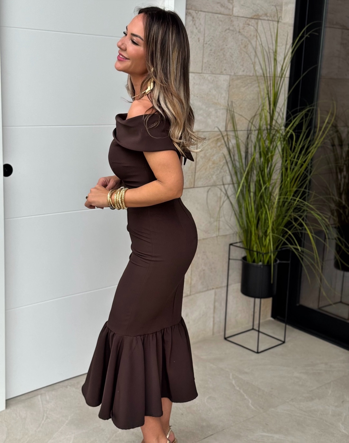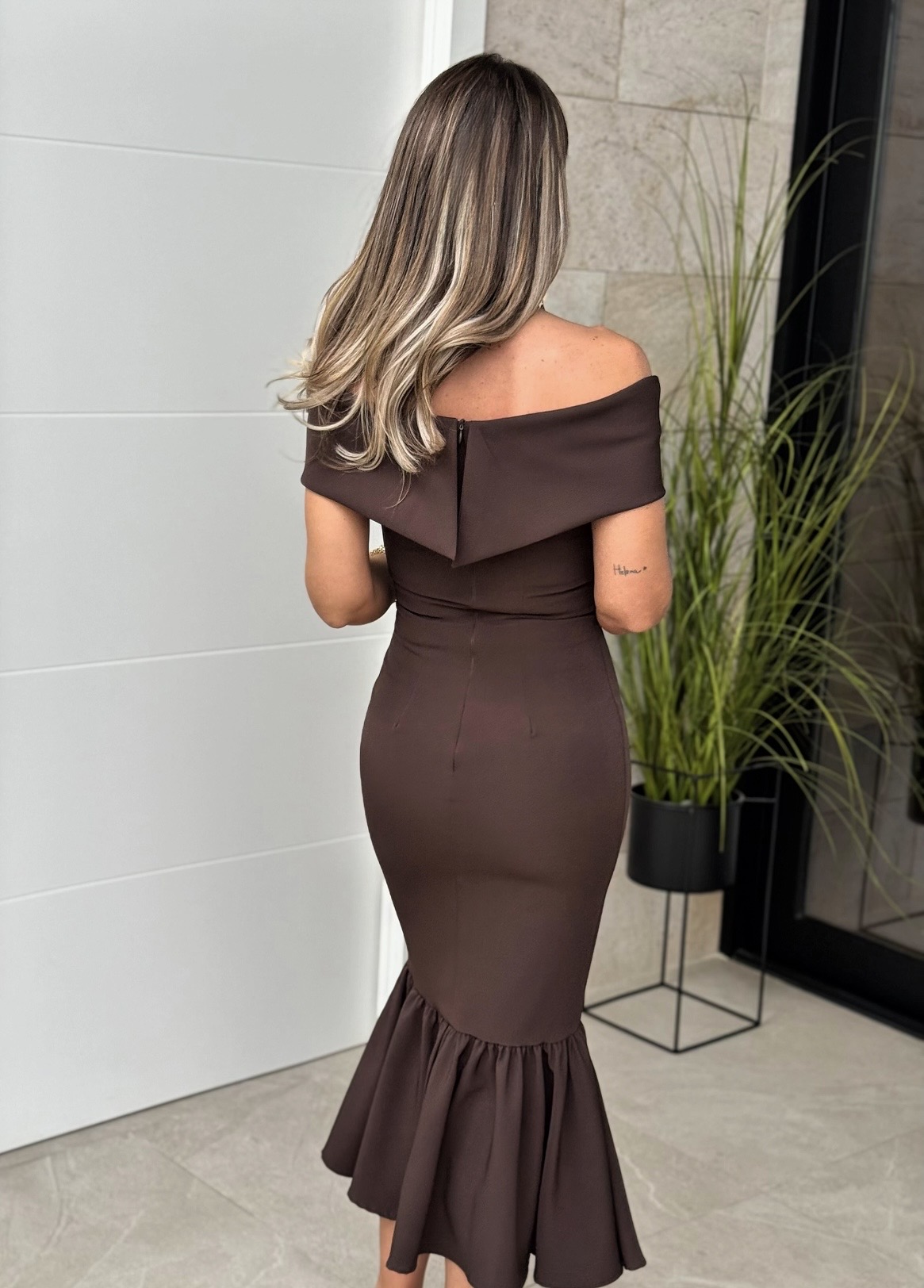 Vestido Bardot Cuello Marrón Chocolate Sin Mangas