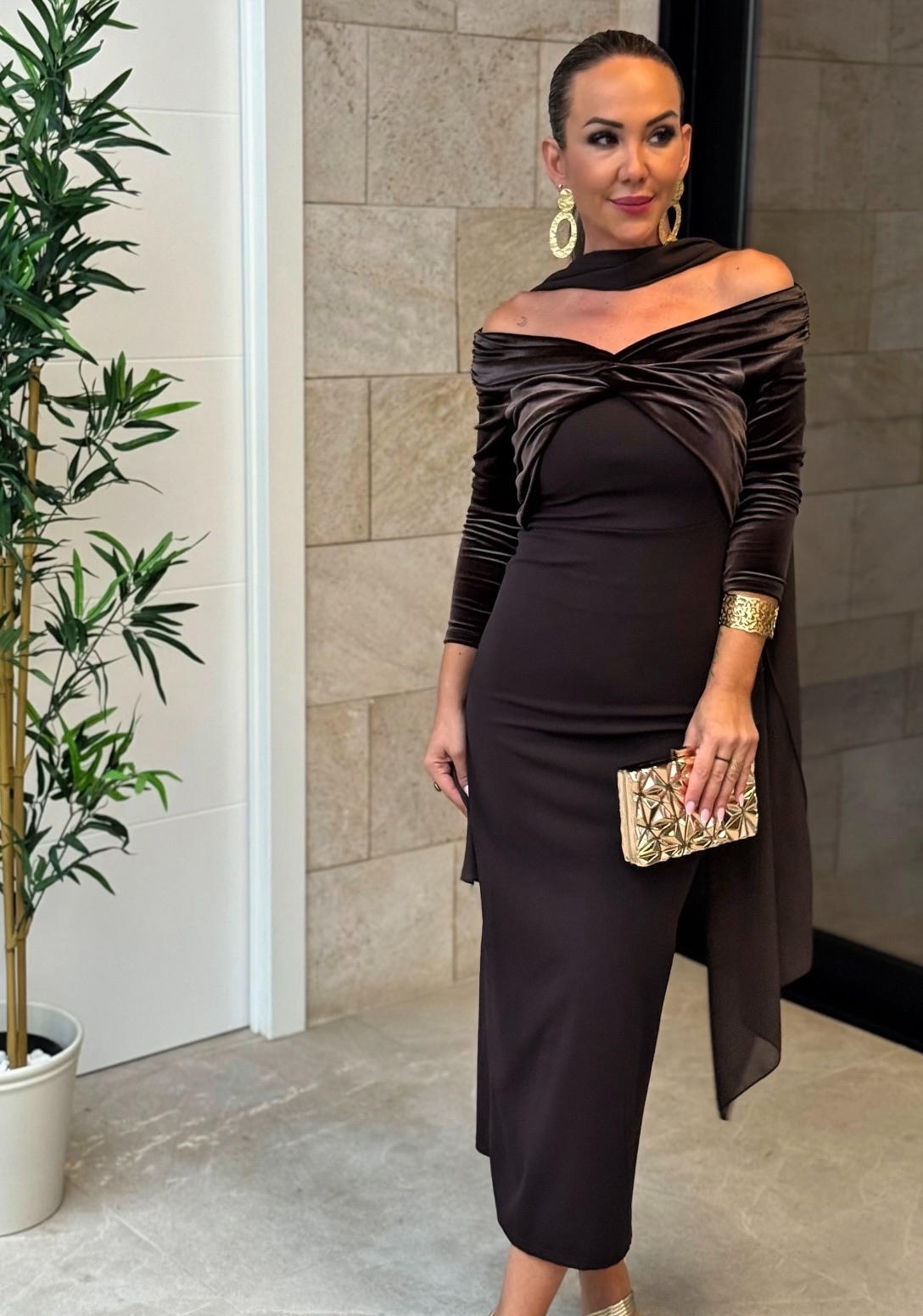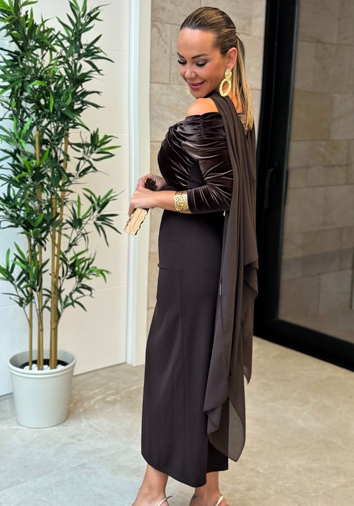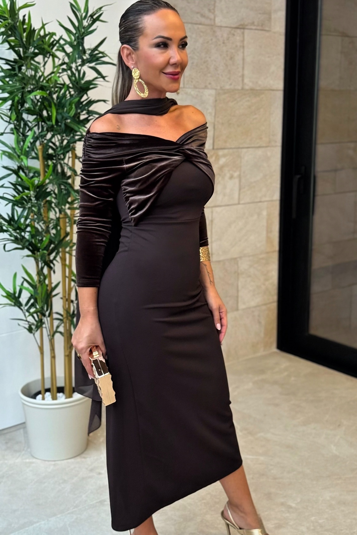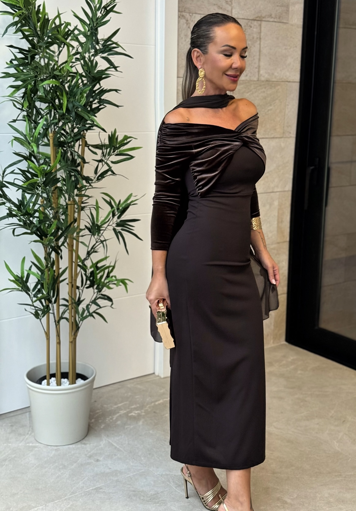 Vestido midi manga larga escote bardot con corte detrás, terciopelo en parte superior.