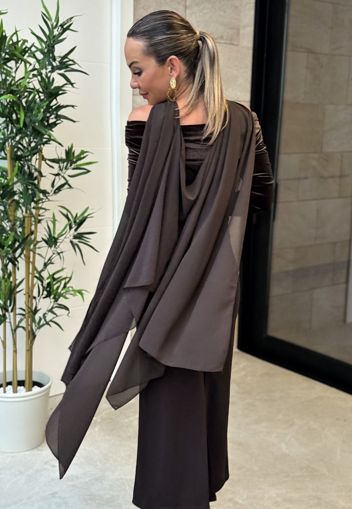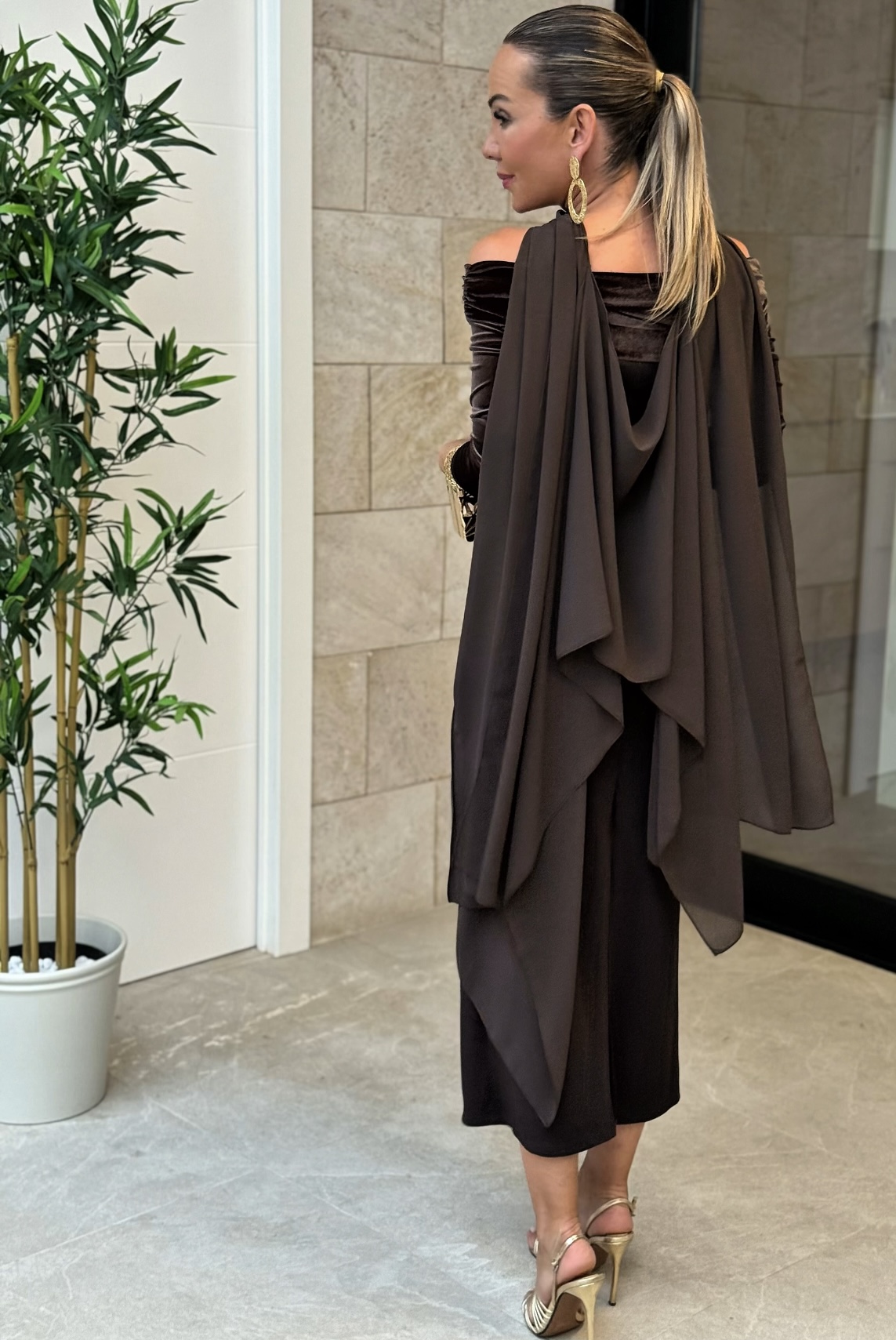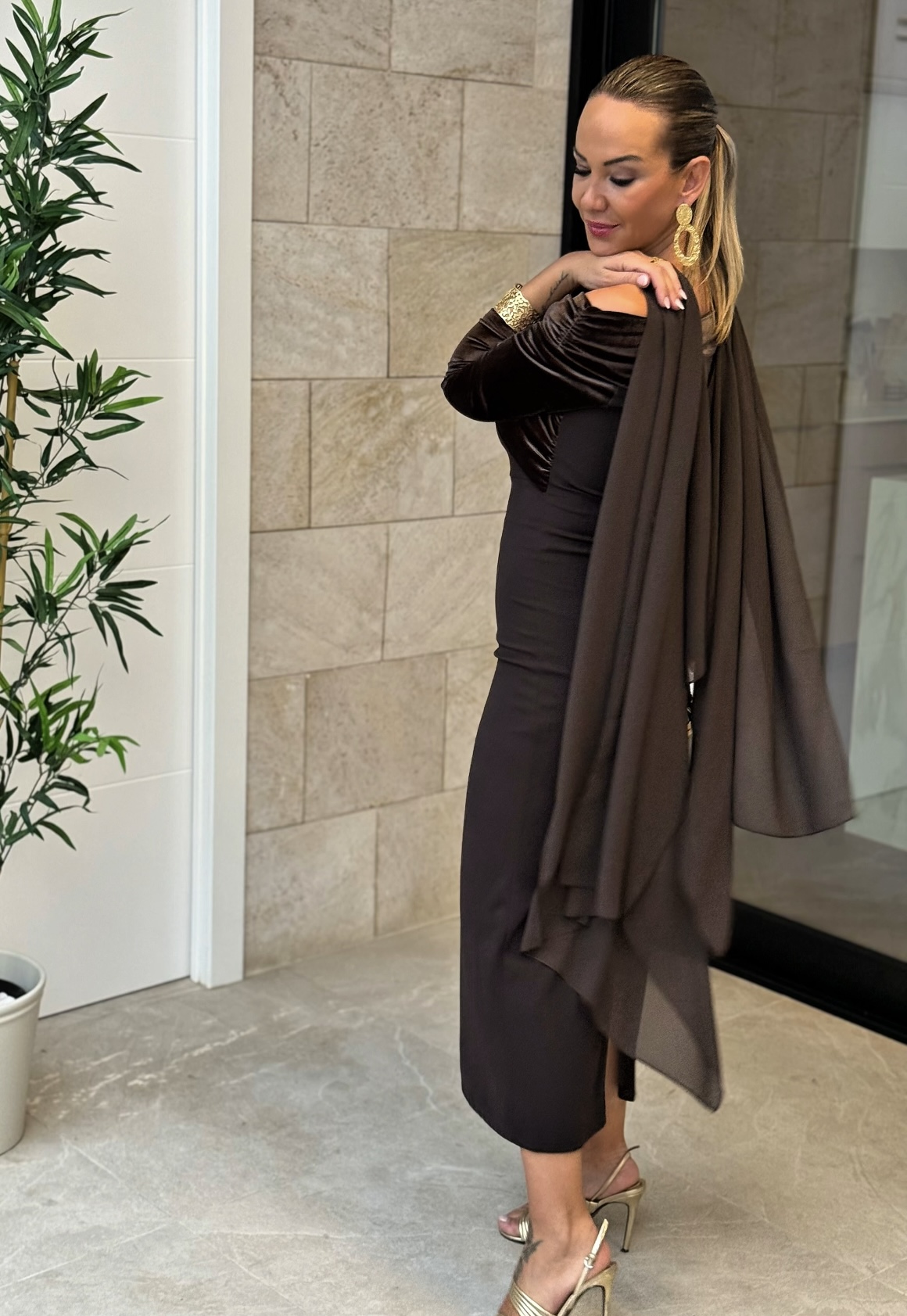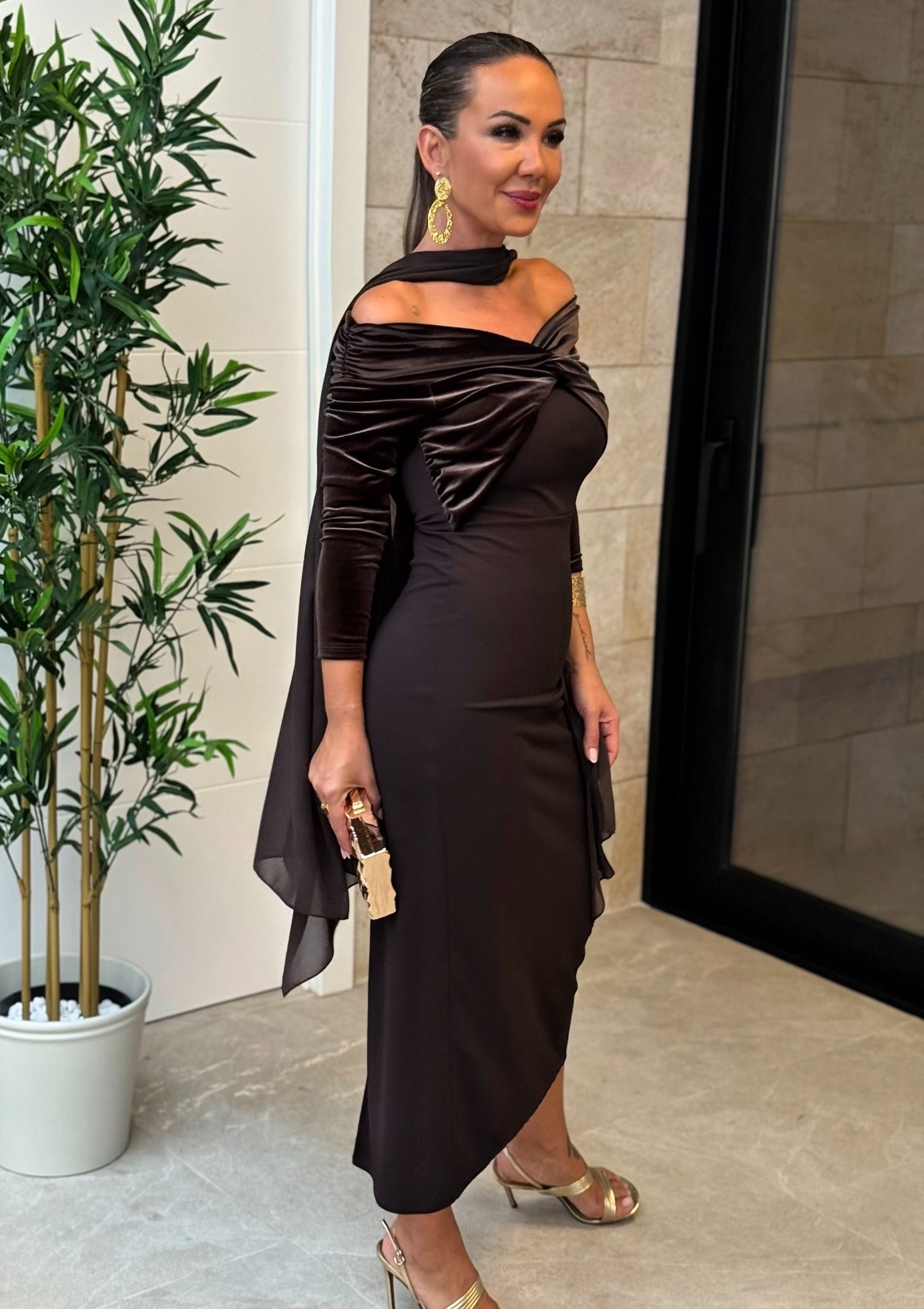 Vestido midi manga larga escote bardot con corte detrás, terciopelo en parte superior.