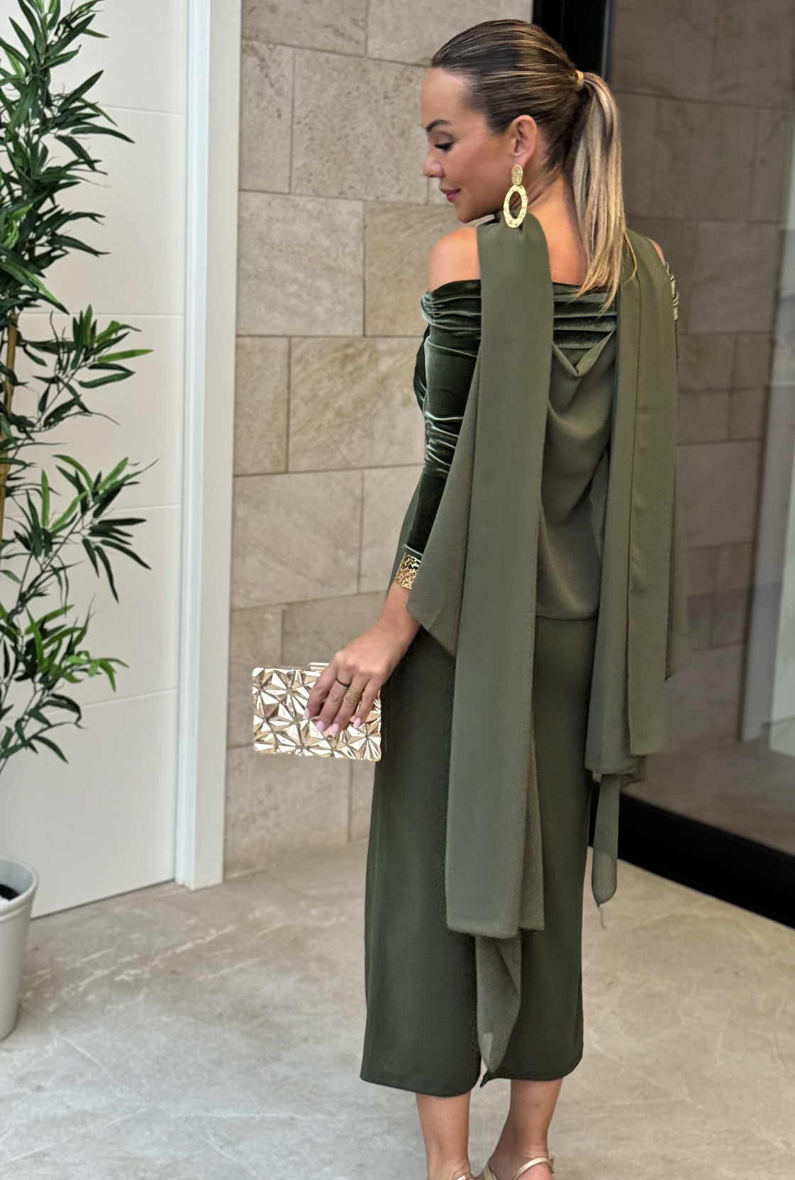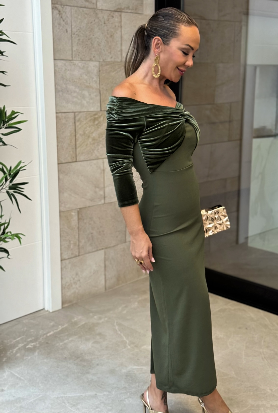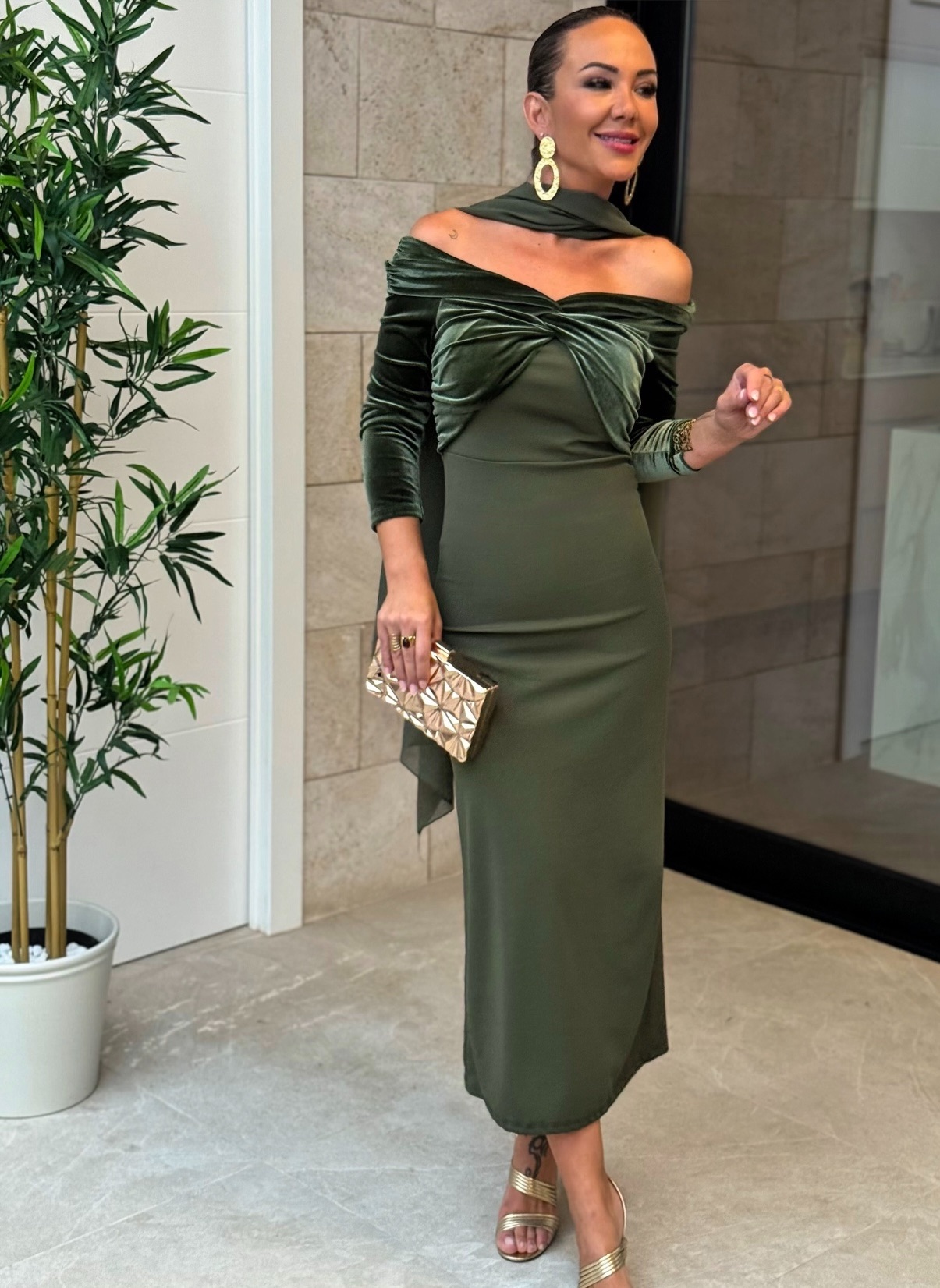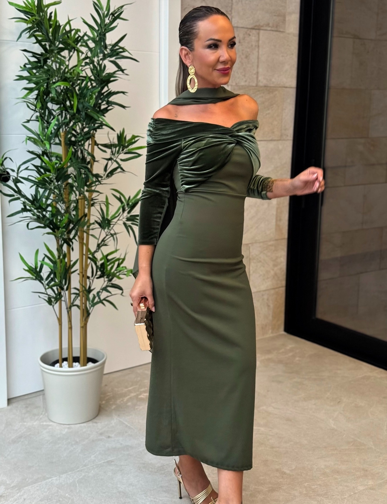 Vestido midi manga larga escote bardot con corte detrás, terciopelo en parte superior.