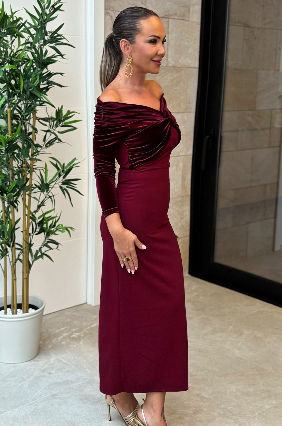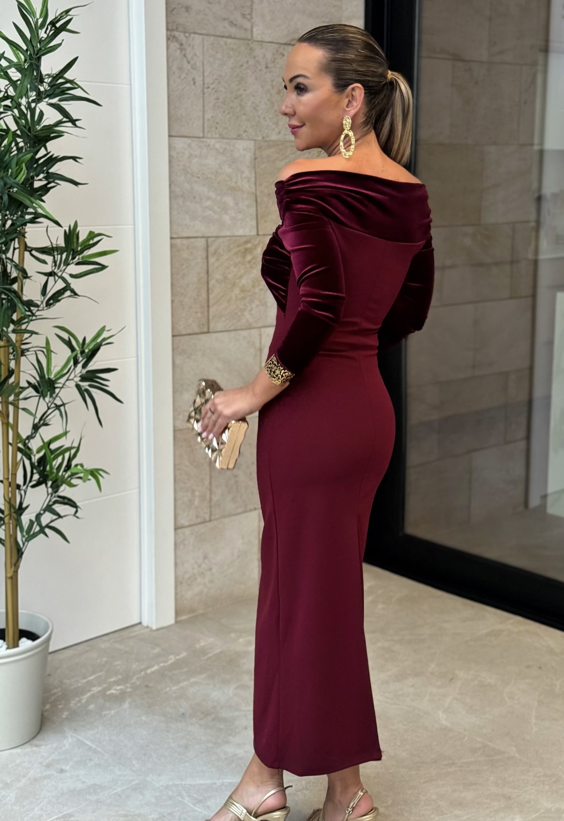 Vestido midi manga larga escote bardot con corte detrás, terciopelo en parte superior.
