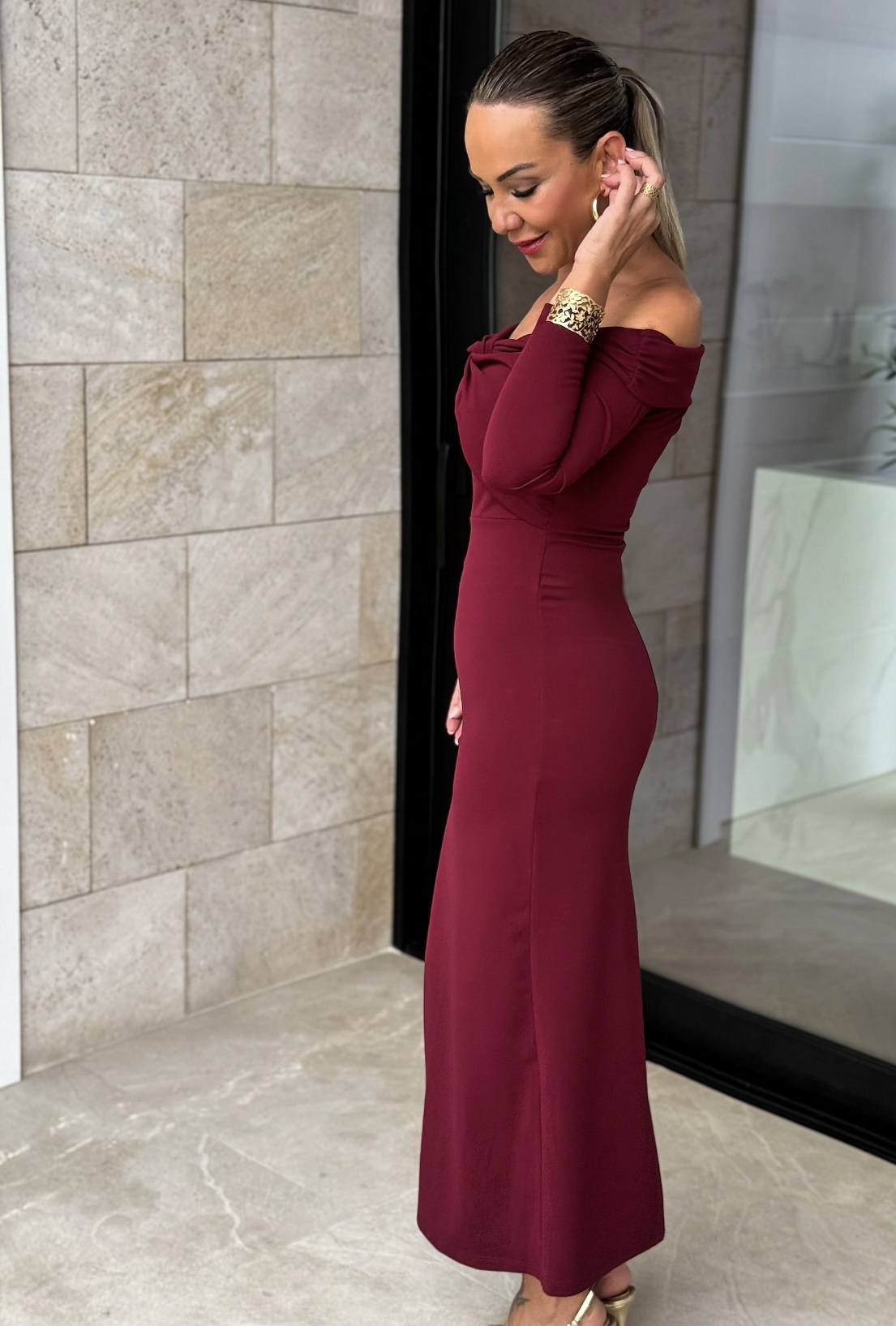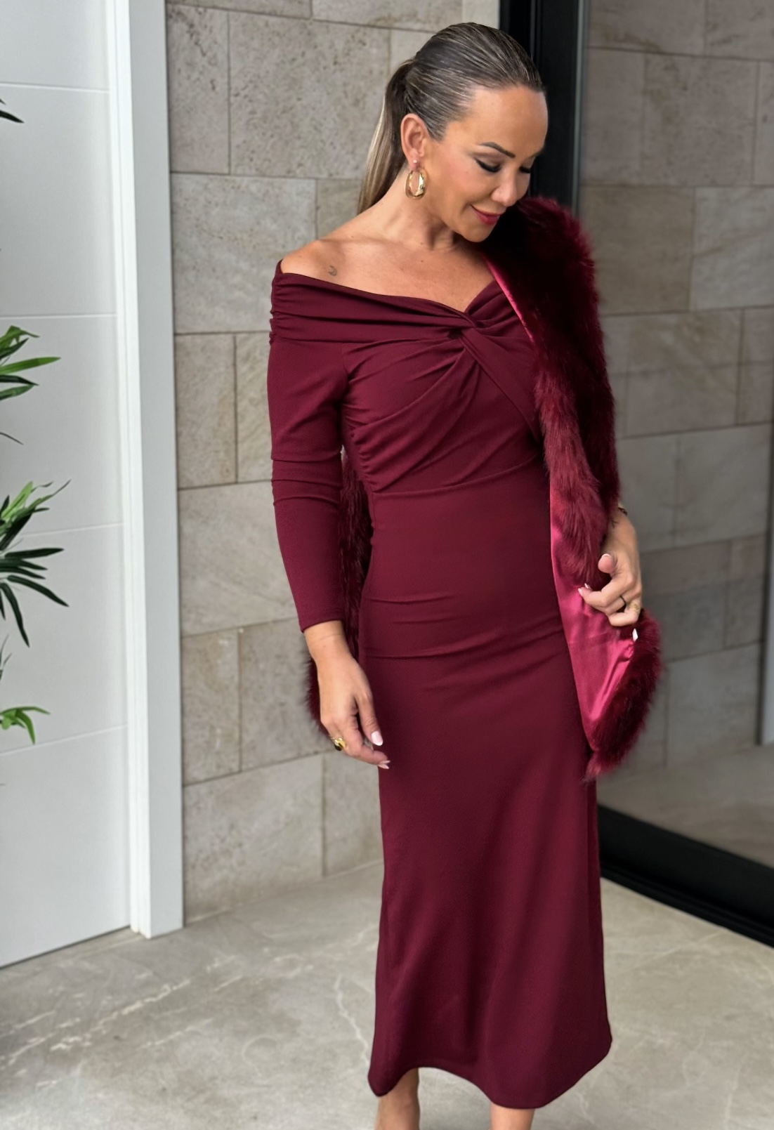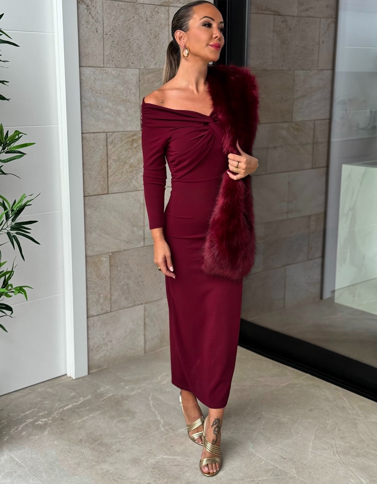 Vestido midi escote bardot con detalle nudo en el pecho, manga larga y corte detras.