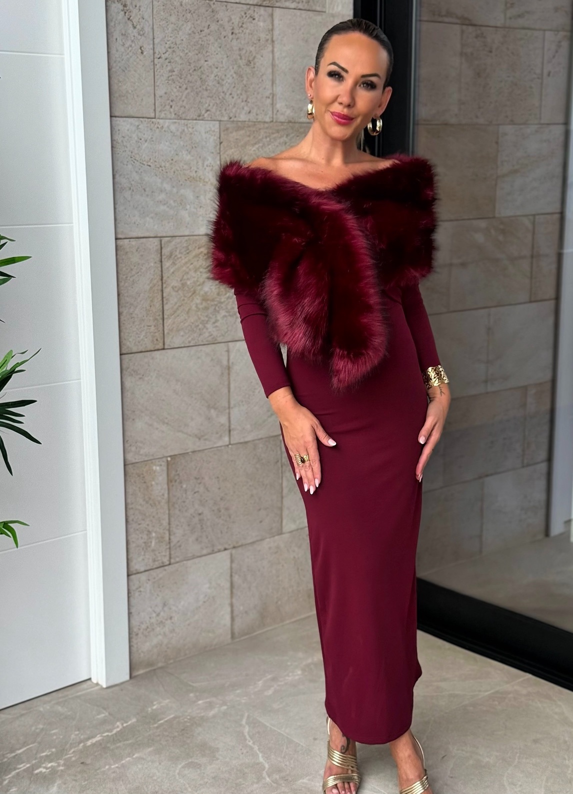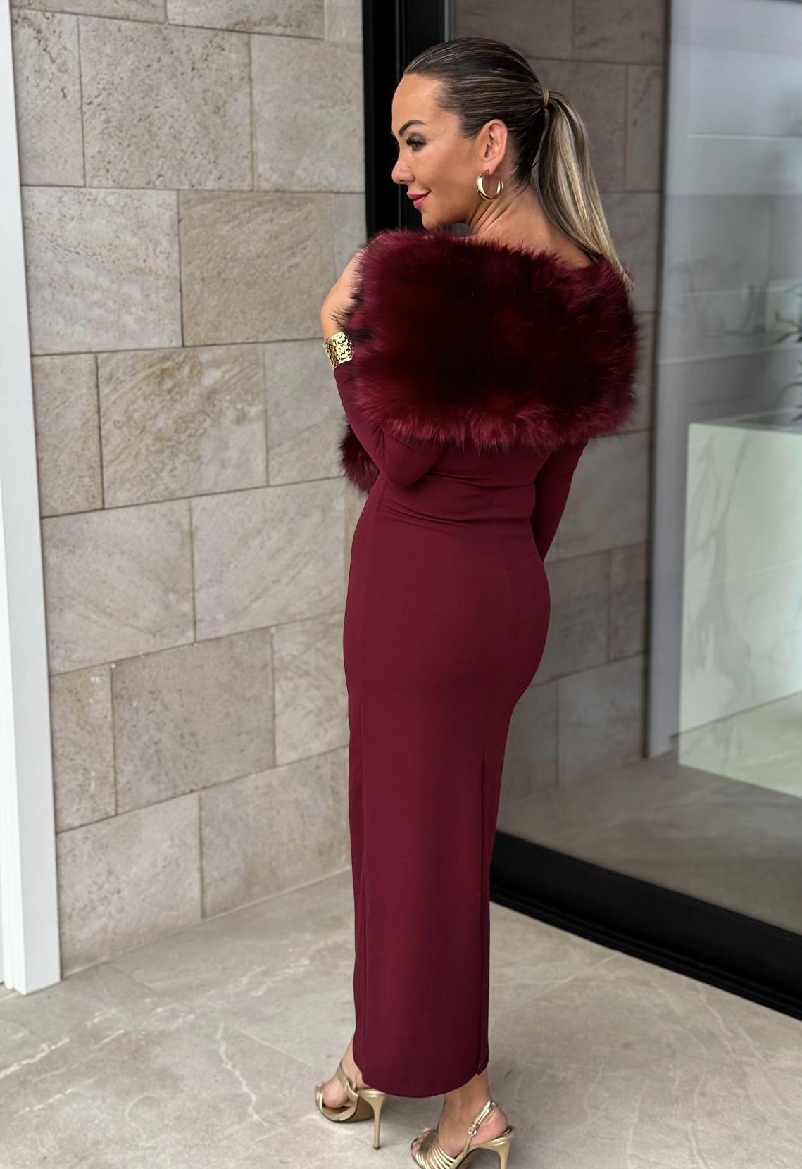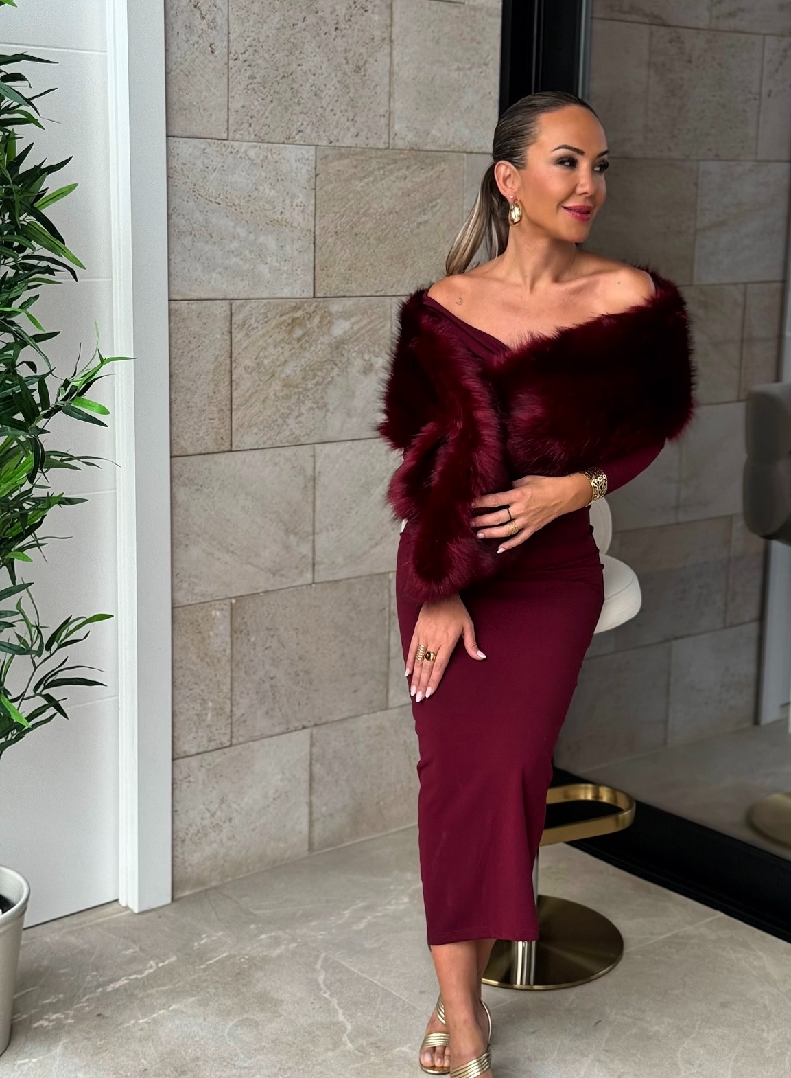 Vestido midi escote bardot con detalle nudo en el pecho, manga larga y corte detras.