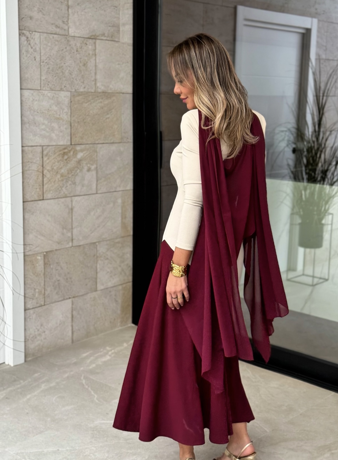 Vestido midi cuello redondo manga larga con falda capada.