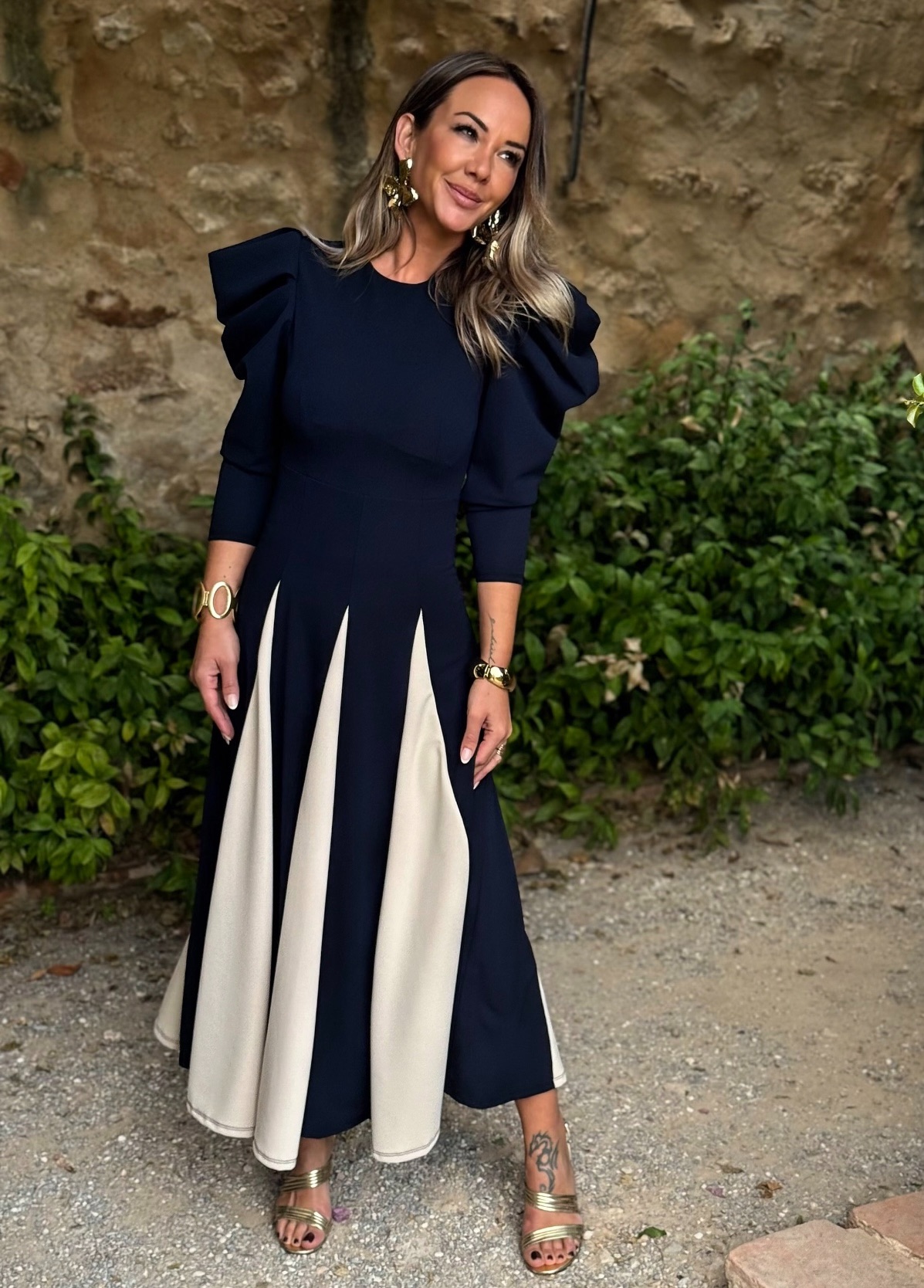 Vestido midi manga larga abullonada cuello redondo con cremallera en espalda y falda capada con detalle de godets en color beige.