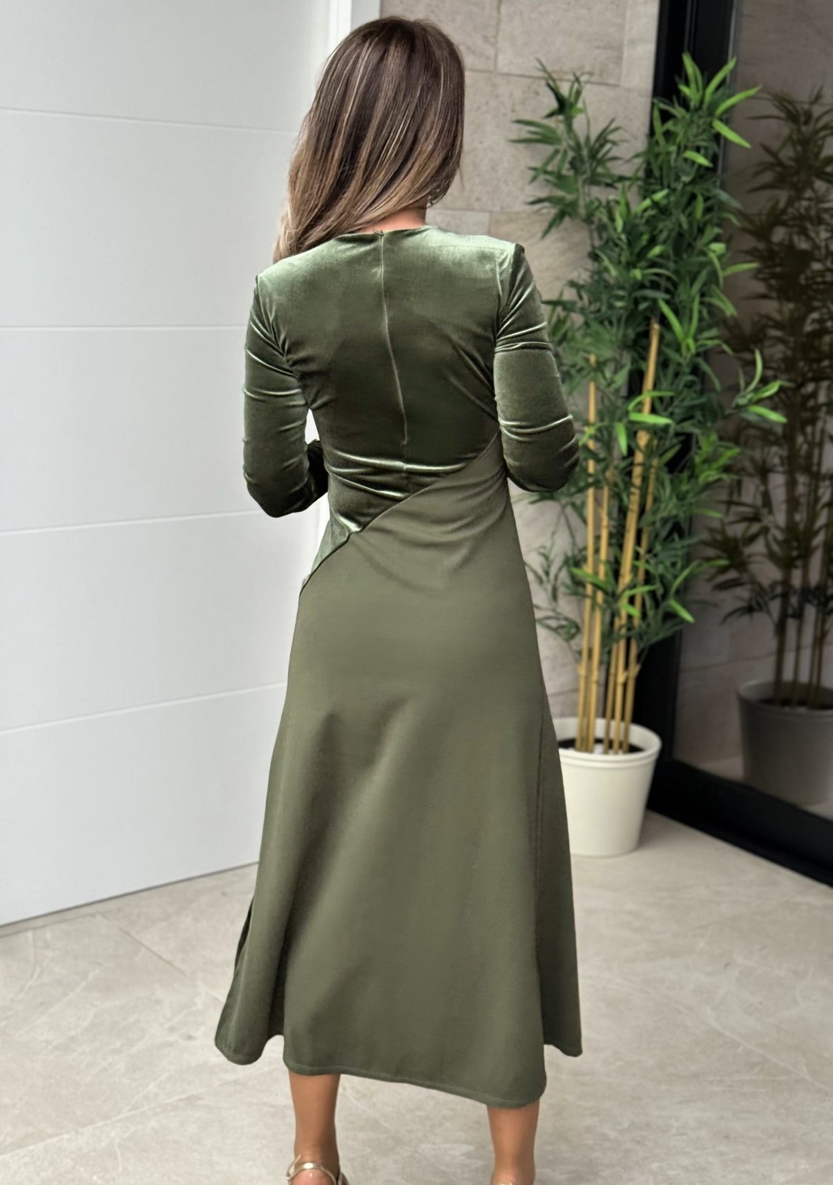 Vestido midi cuello redondo manga larga con falda capada, parte superior terciopelo y cremallera en espalda.