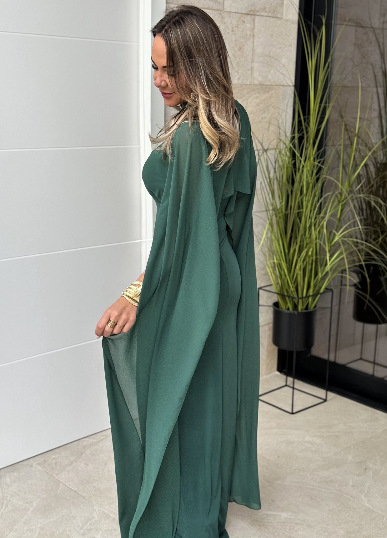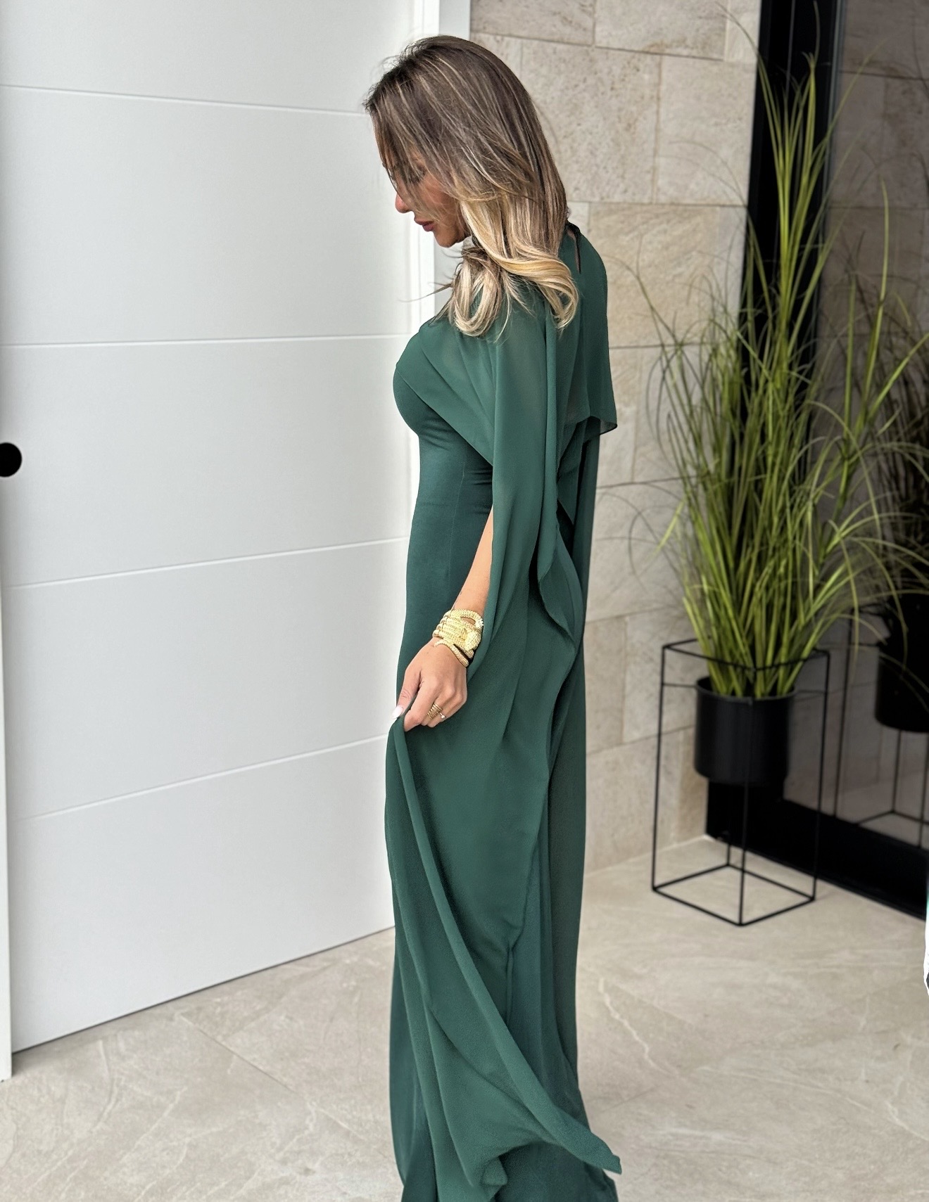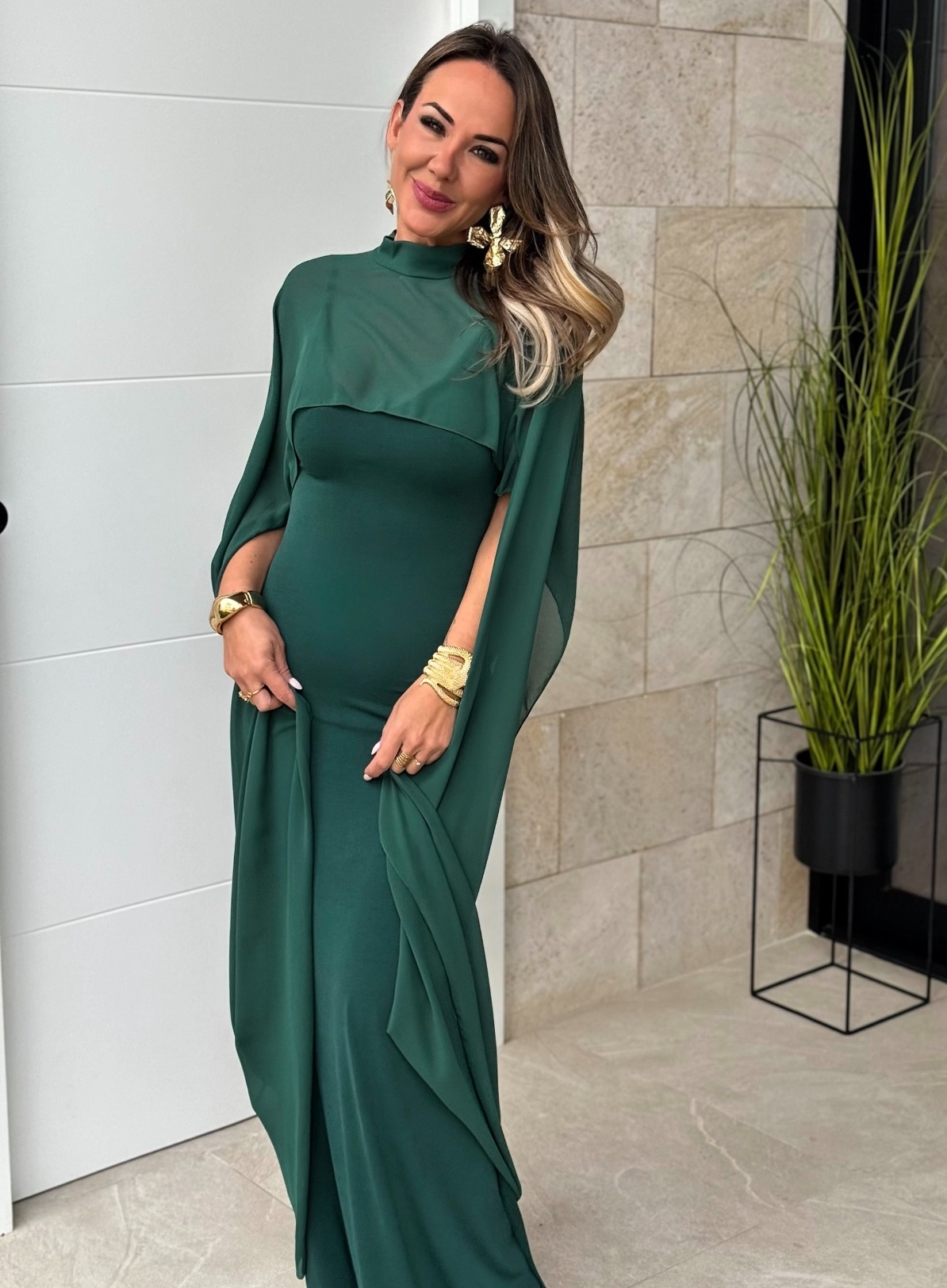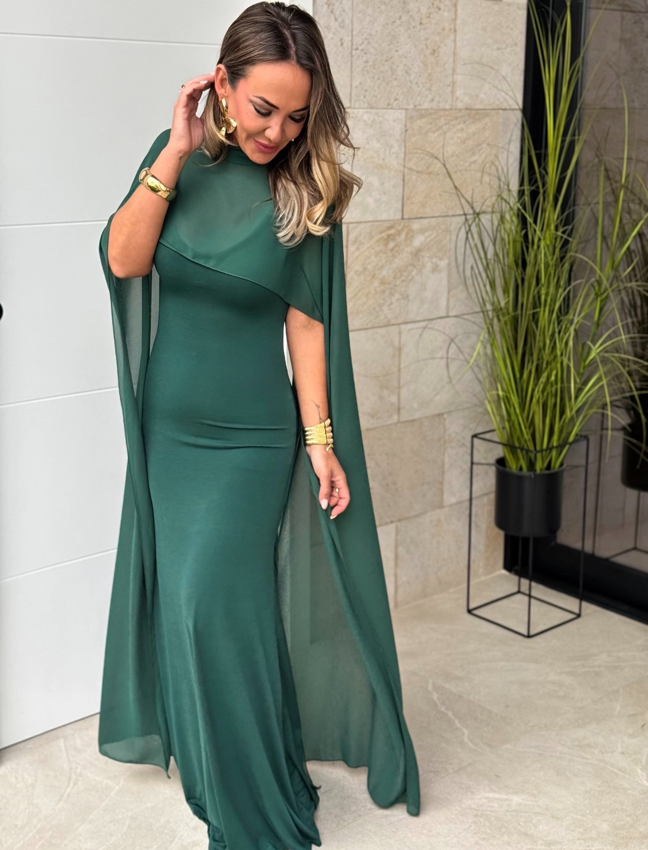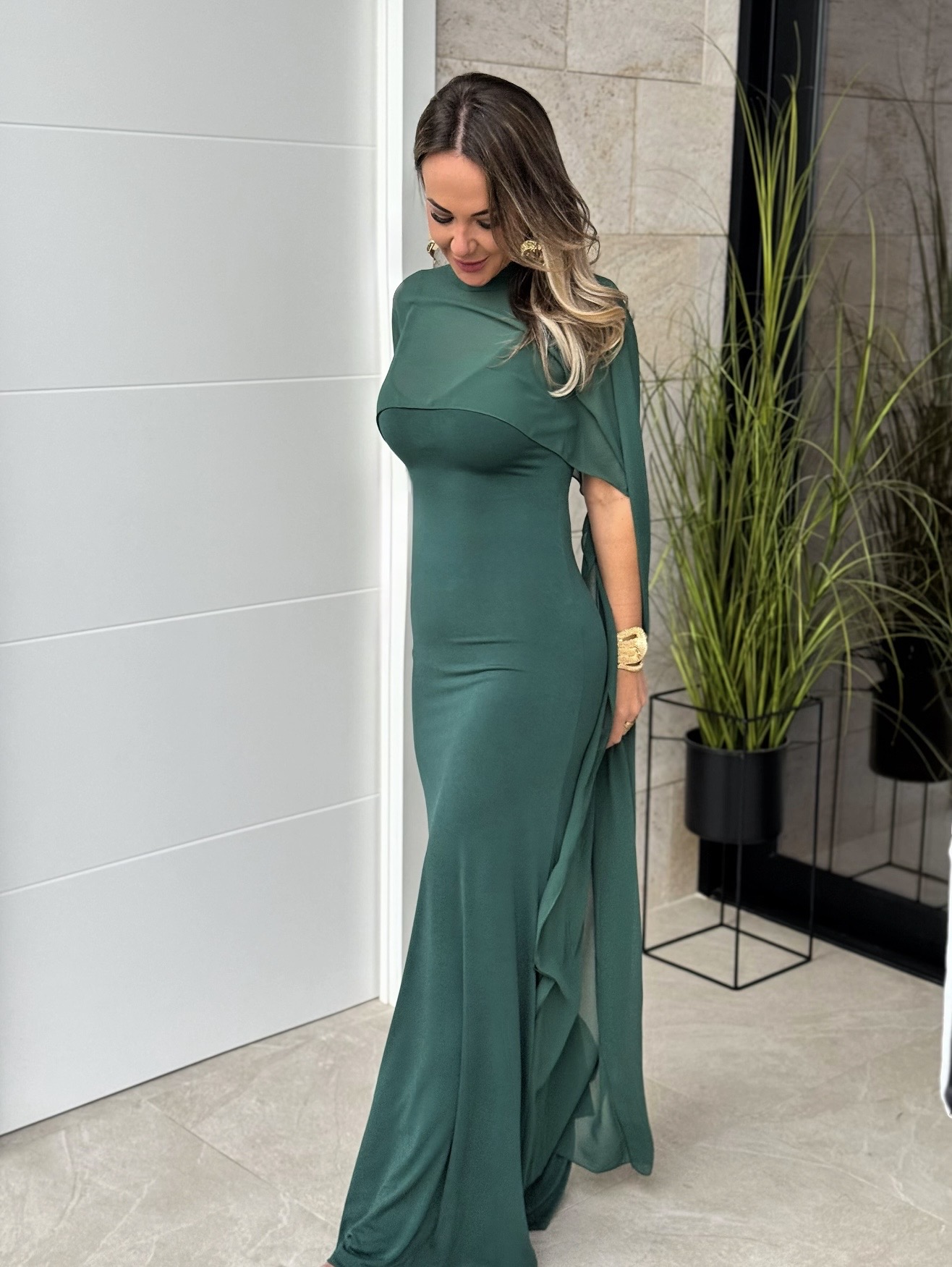 Vestido lycra largo tiente fino ajustable escote pico con capa cuello subido botón detrás.