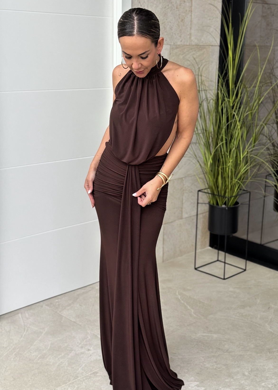 Vestido lycra largo espalda descubierta cuello halter, falda fruncida con detalle lazada en el centro.