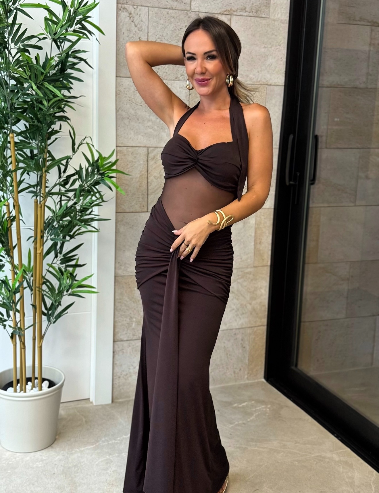 Vestido largo escote con cocos fruncido atado al cuello, detalle nudo cintura fruncido con tira de tela y gasa transparente en cintura.