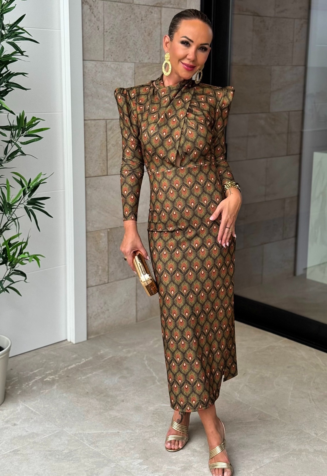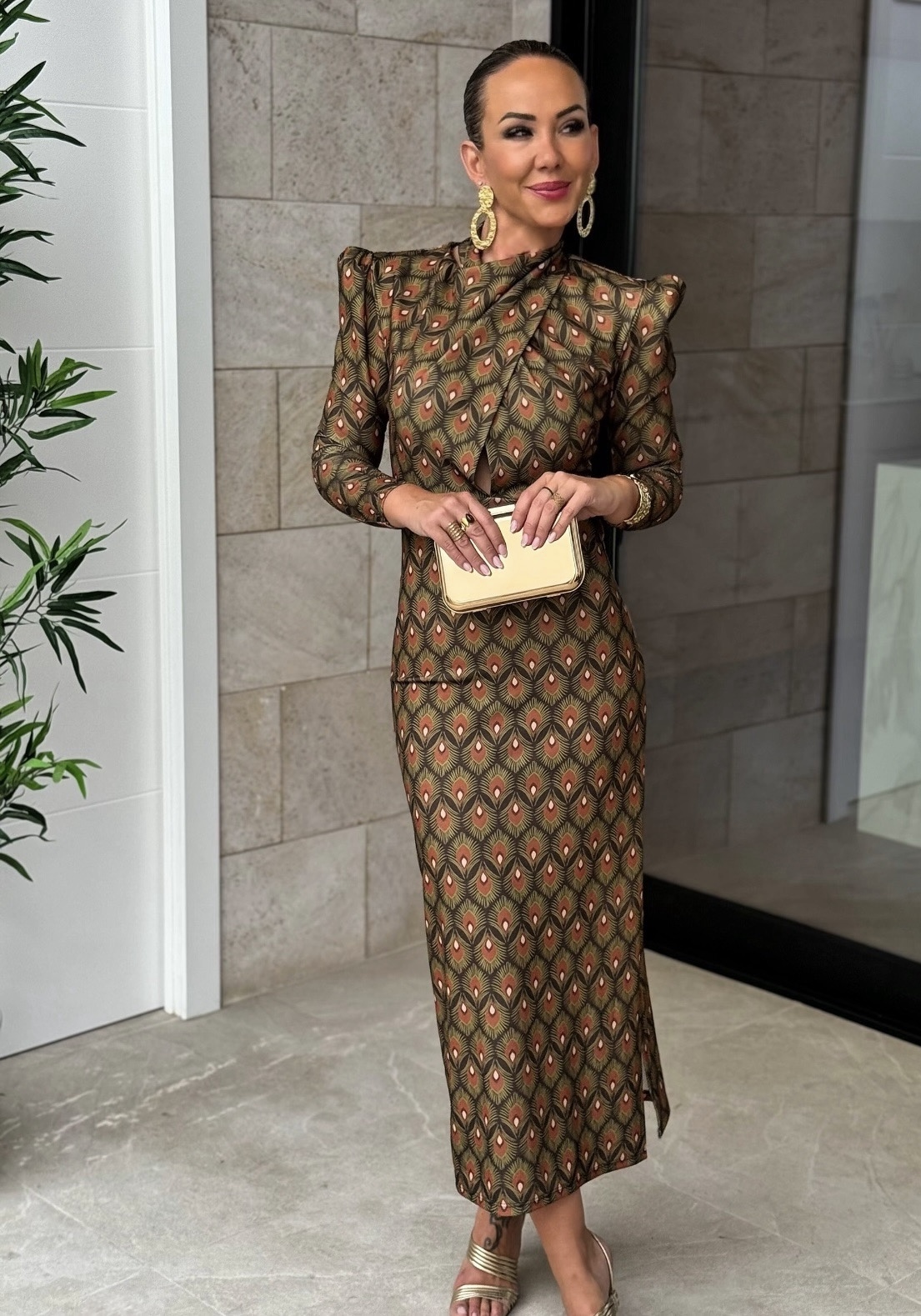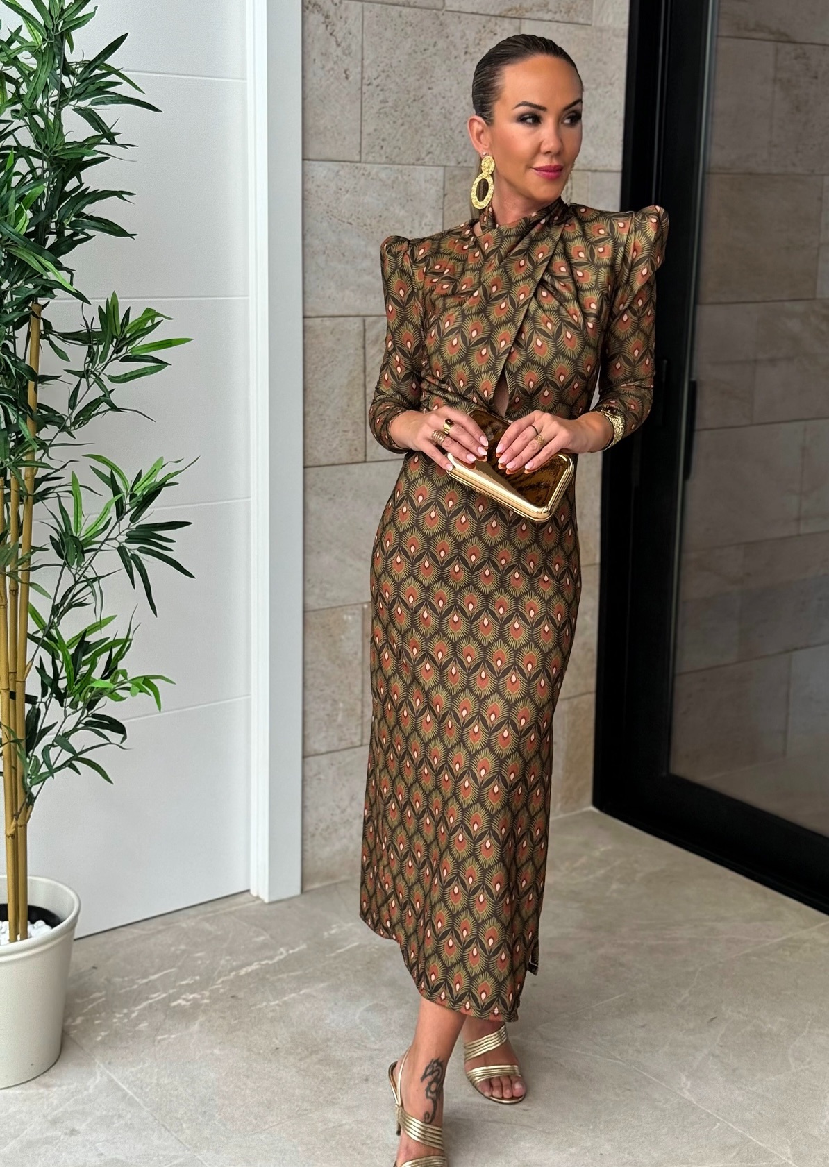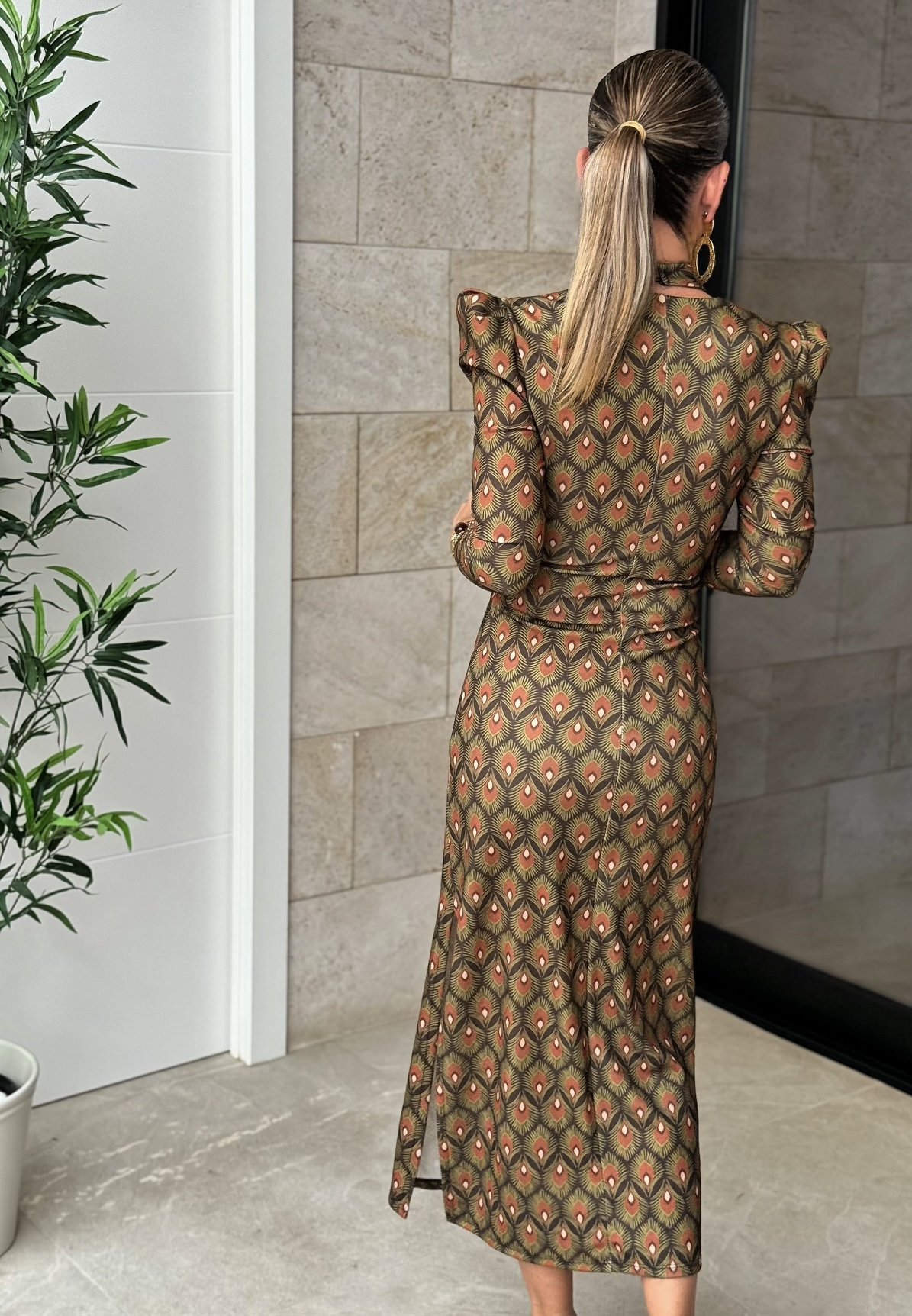 Vestido midi manga larga cruzado en escote y cuello con botones detrás.