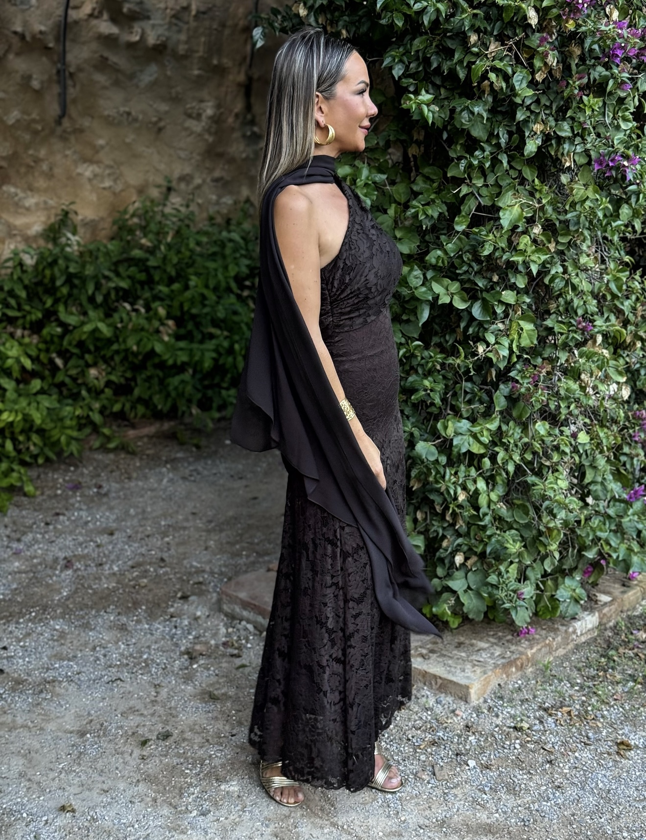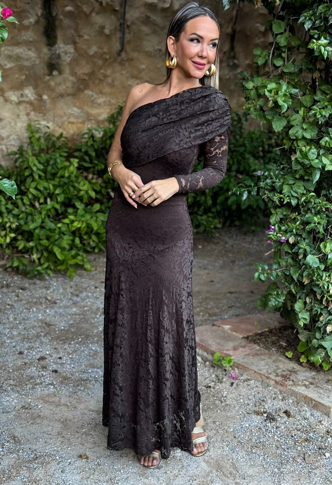 Vestido largo asimétrico encaje con forro interior, cremallera lateral.