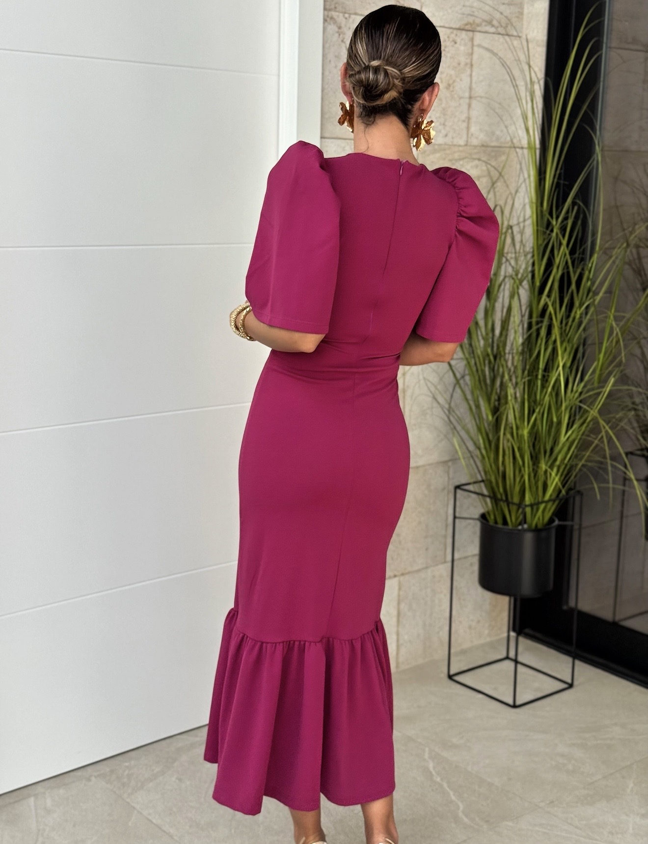 Vestido midi con manga corta farol y volante grande bajo, cremallera detras.
