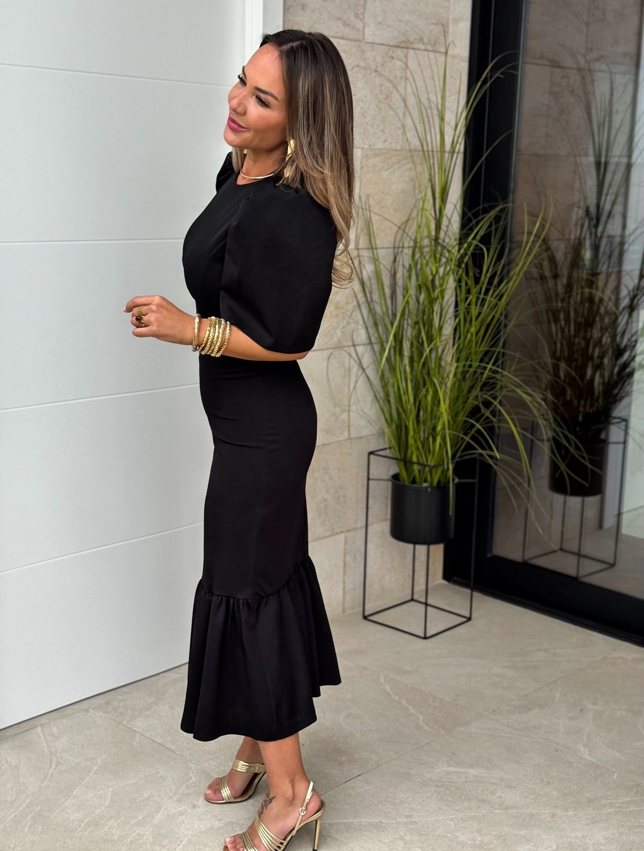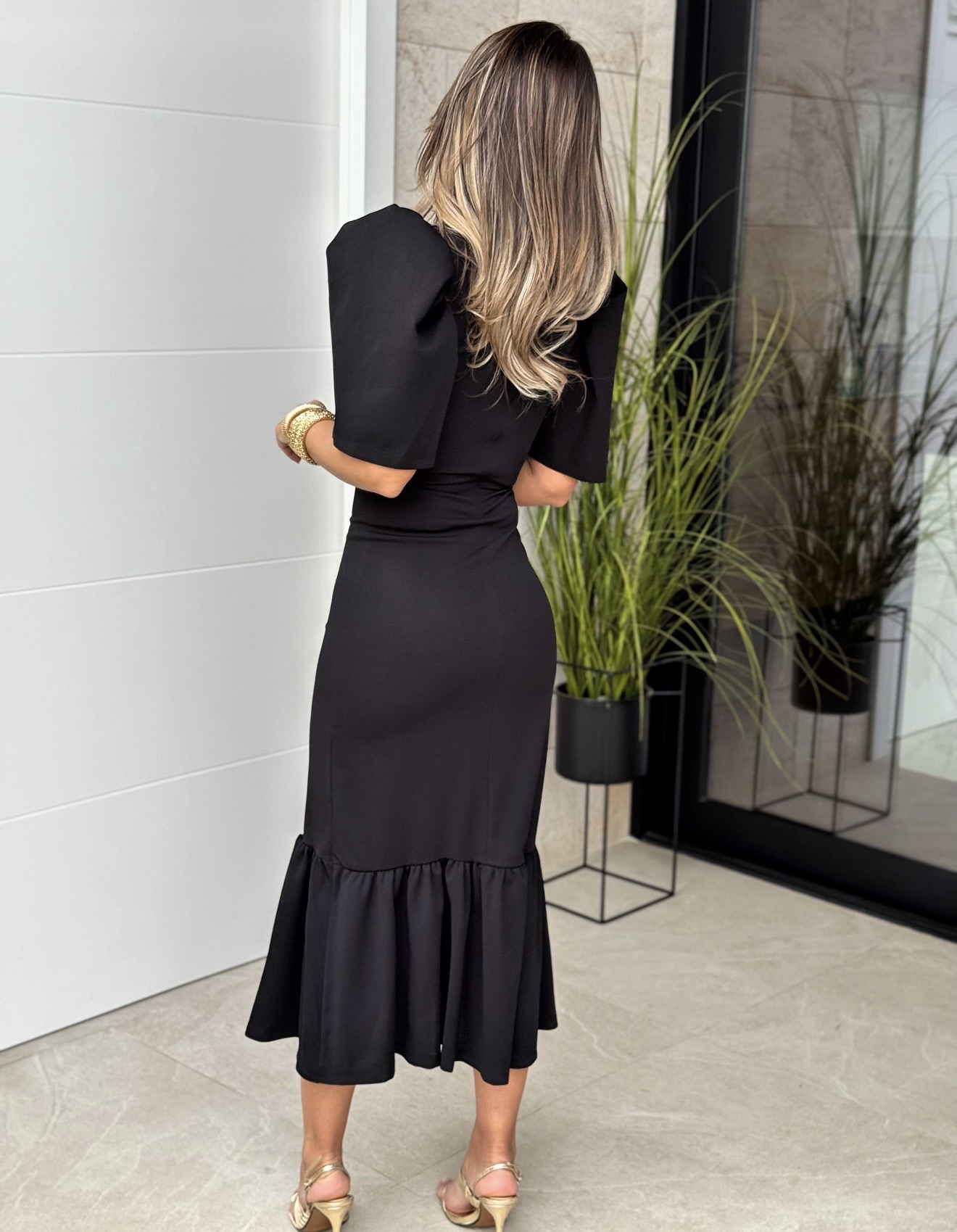 Vestido midi con manga corta farol y volante grande bajo, cremallera detras.