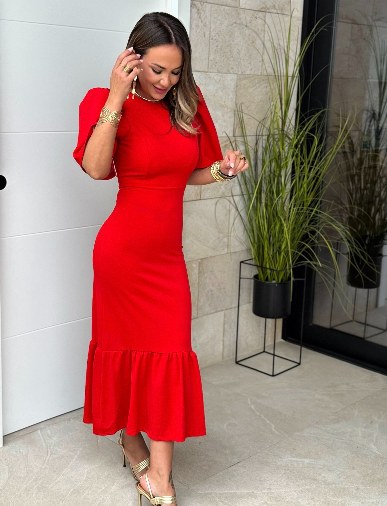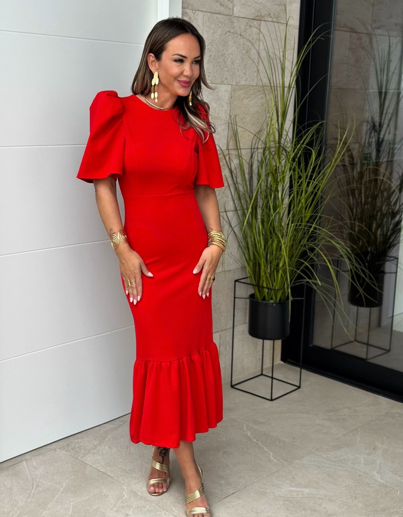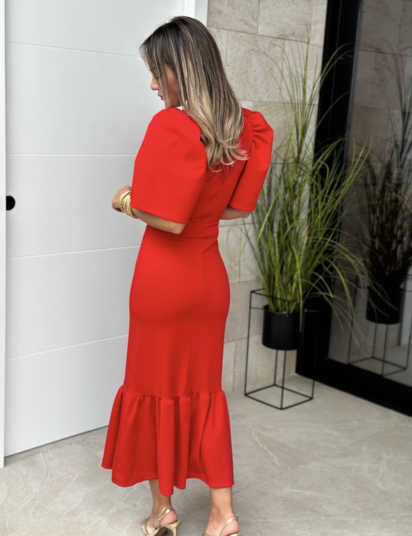 Vestido midi con manga corta farol y volante grande bajo, cremallera detras.