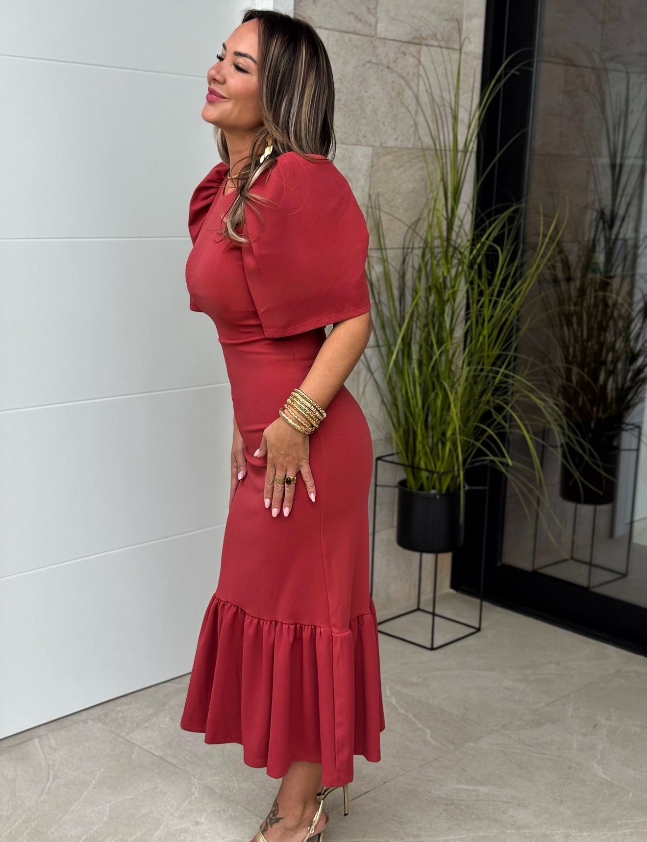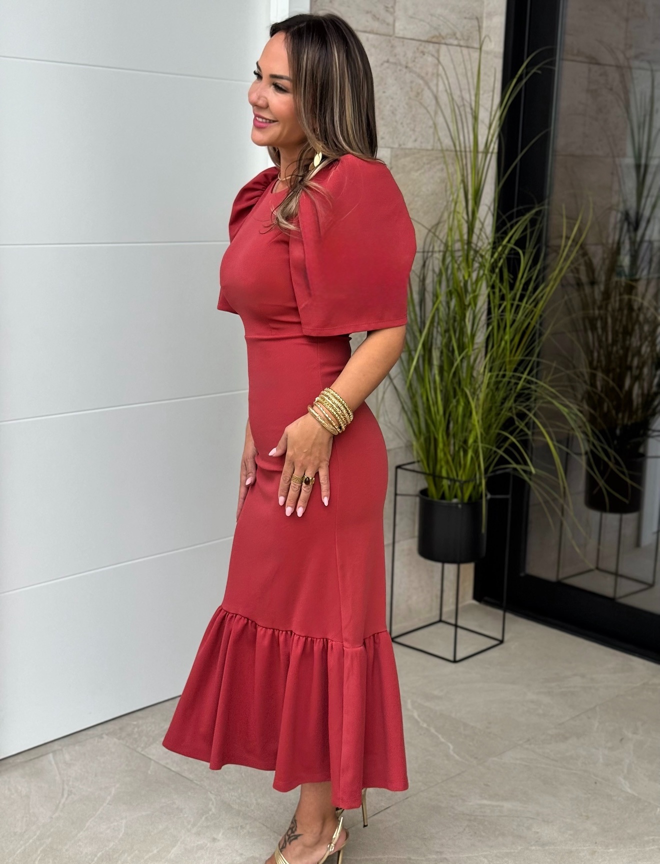 Vestido midi con manga corta farol y volante grande bajo, cremallera detras.