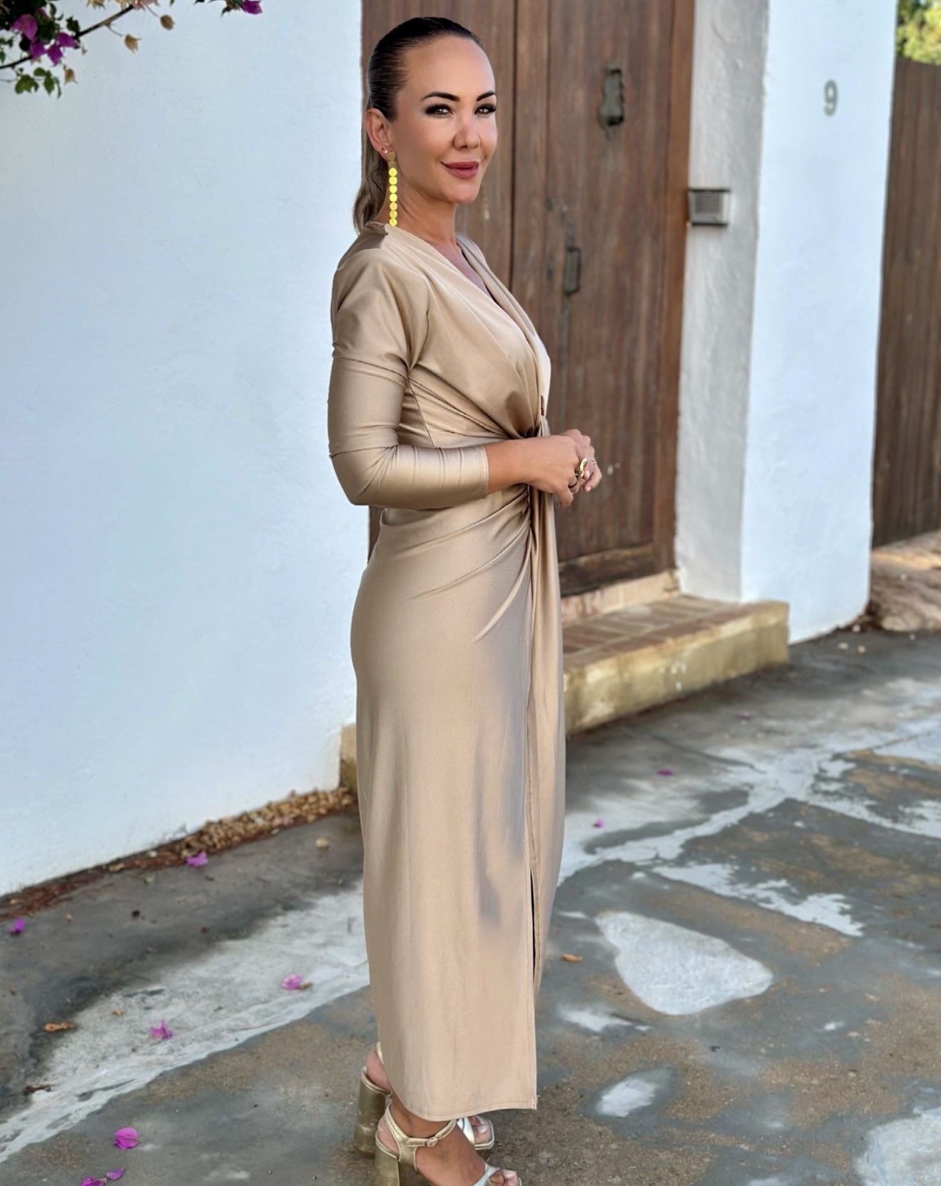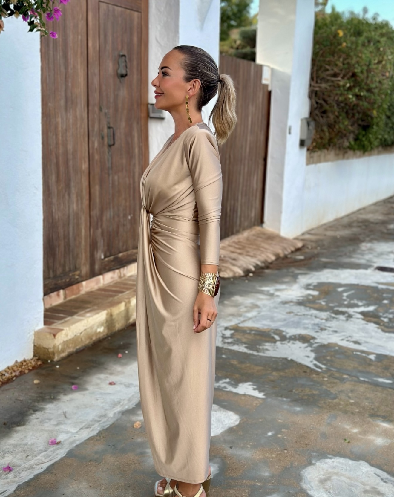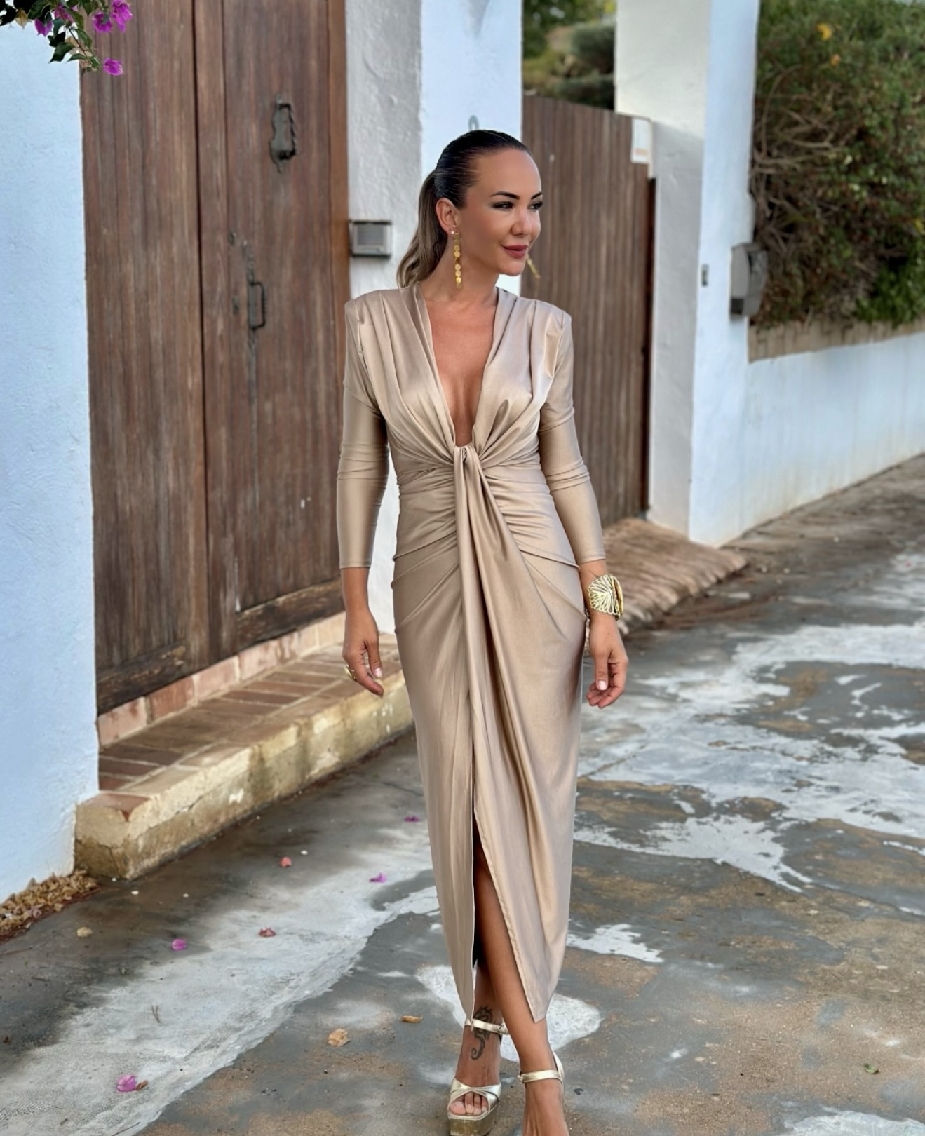 Vestido manga larga nylon satinado con escote profundo, detalle nudo en escote y corte delantero lateral.