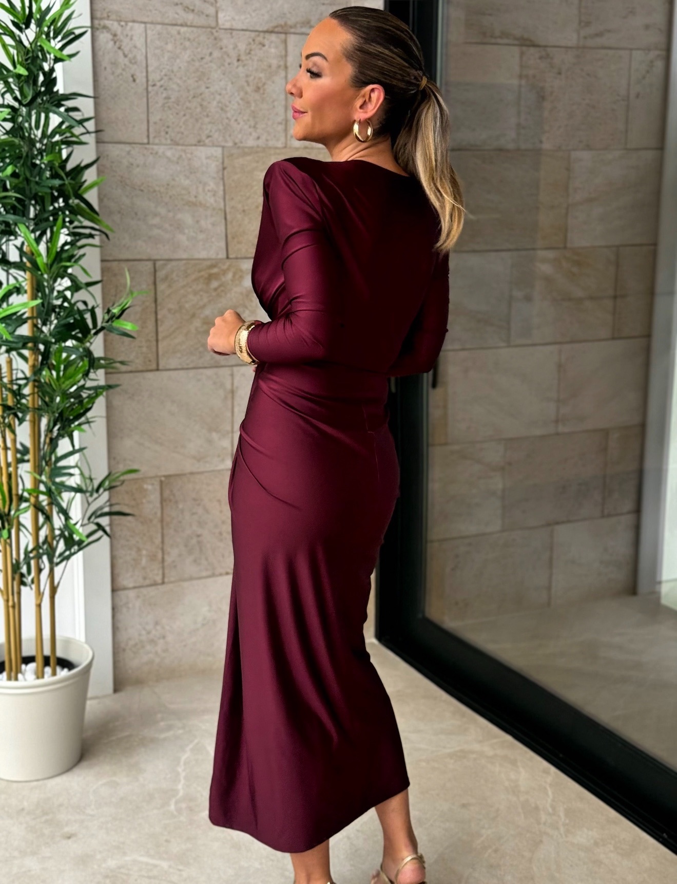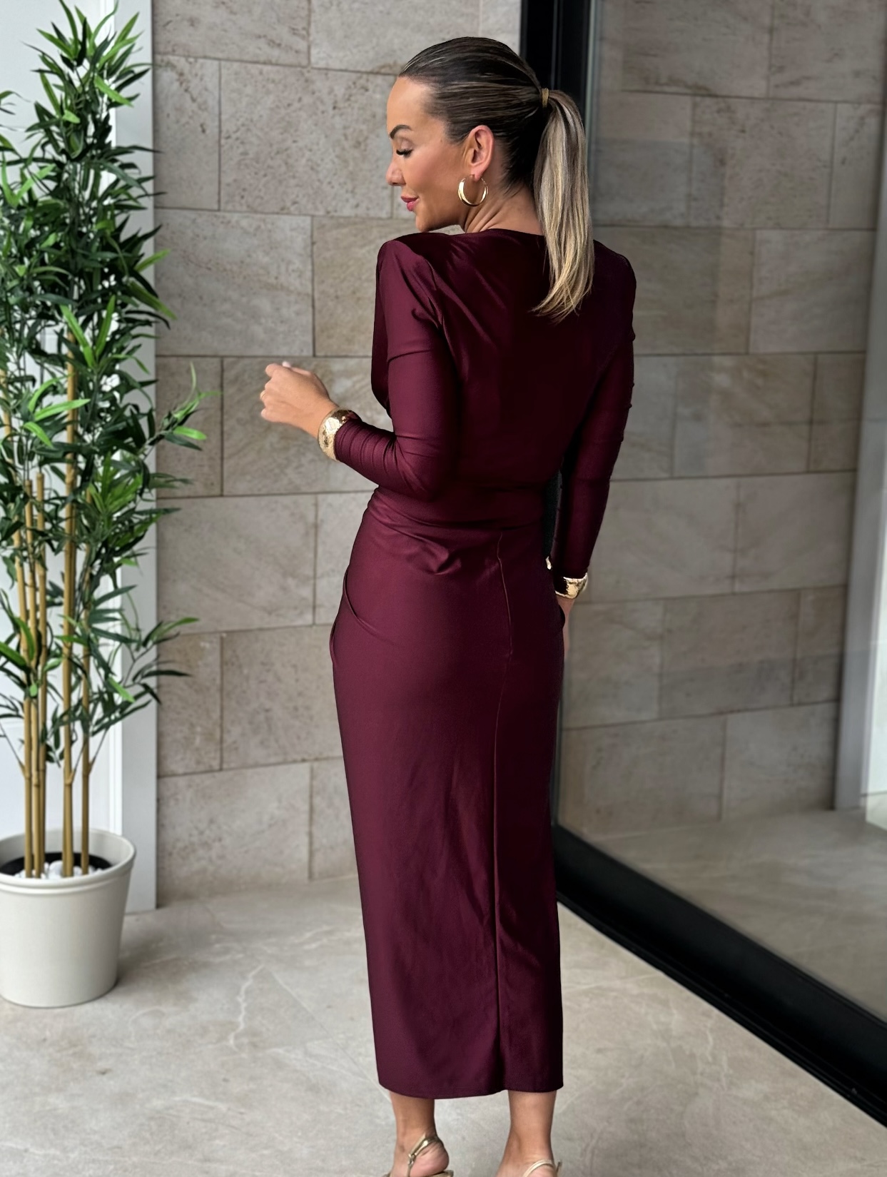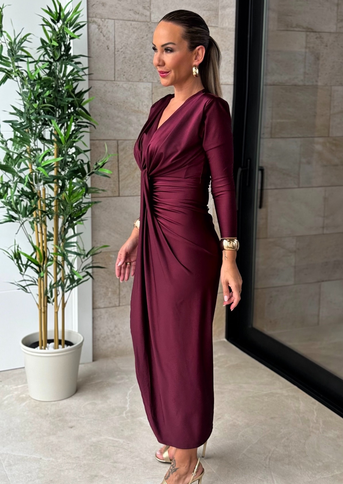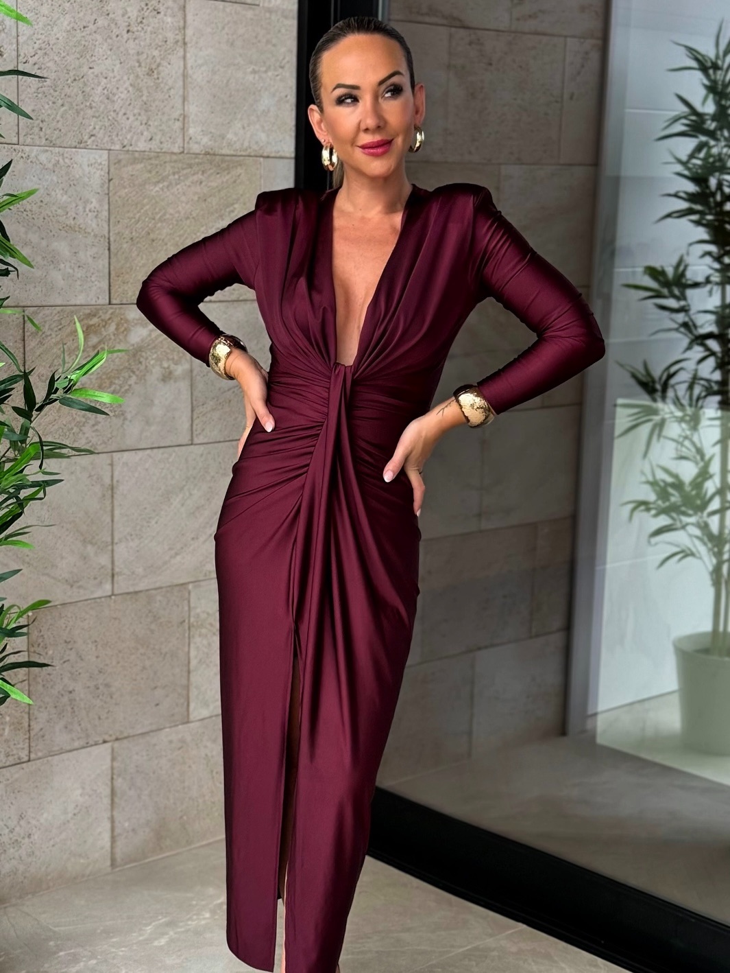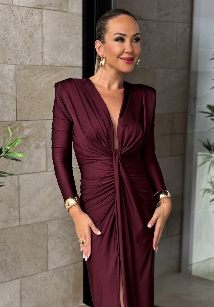 Vestido manga larga nylon satinado con escote profundo, detalle nudo en escote y corte delantero lateral.