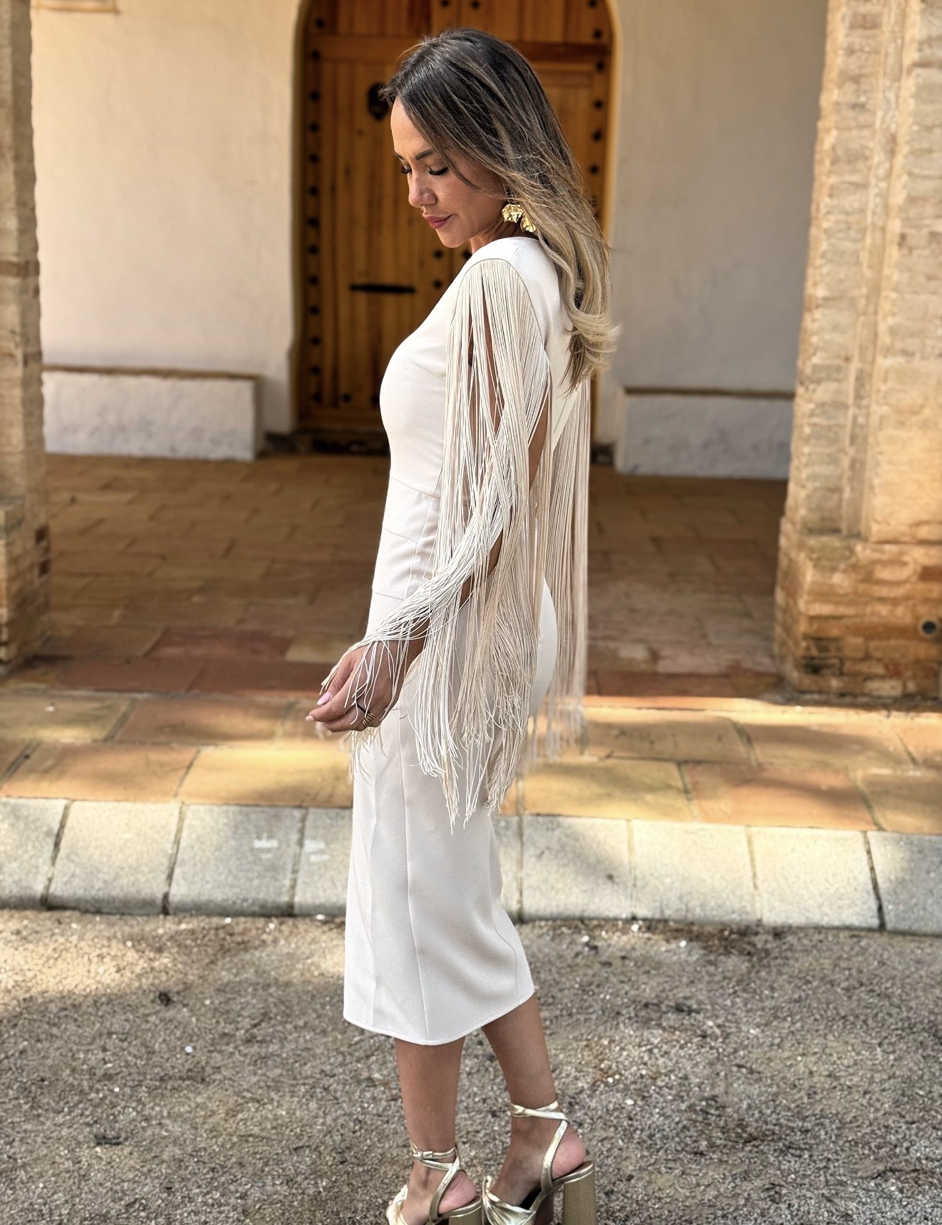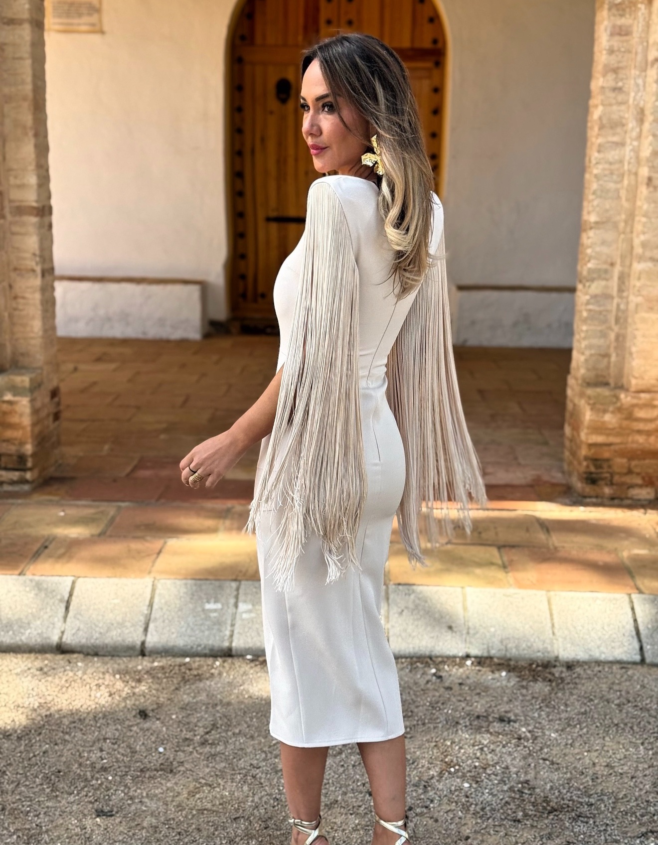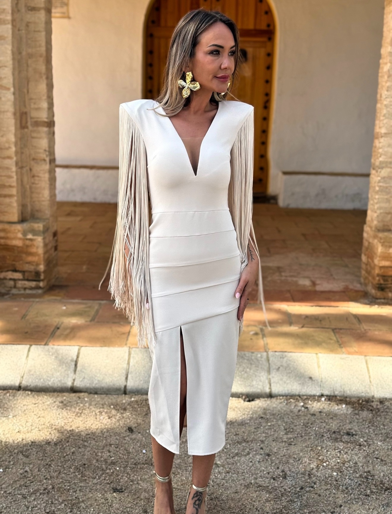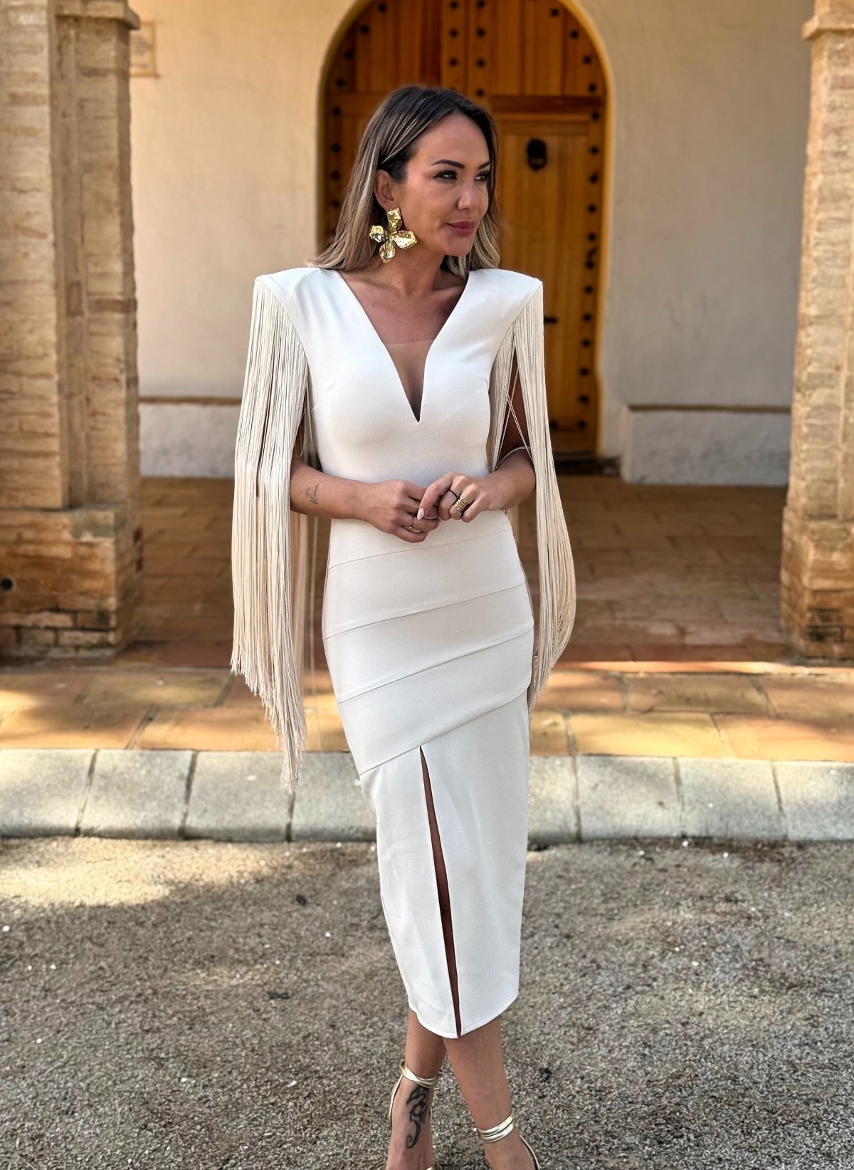 Vestido midi escote profundo en v con tul sin mangas con hombreras y detalle flecos largos, corte delantero lateral.