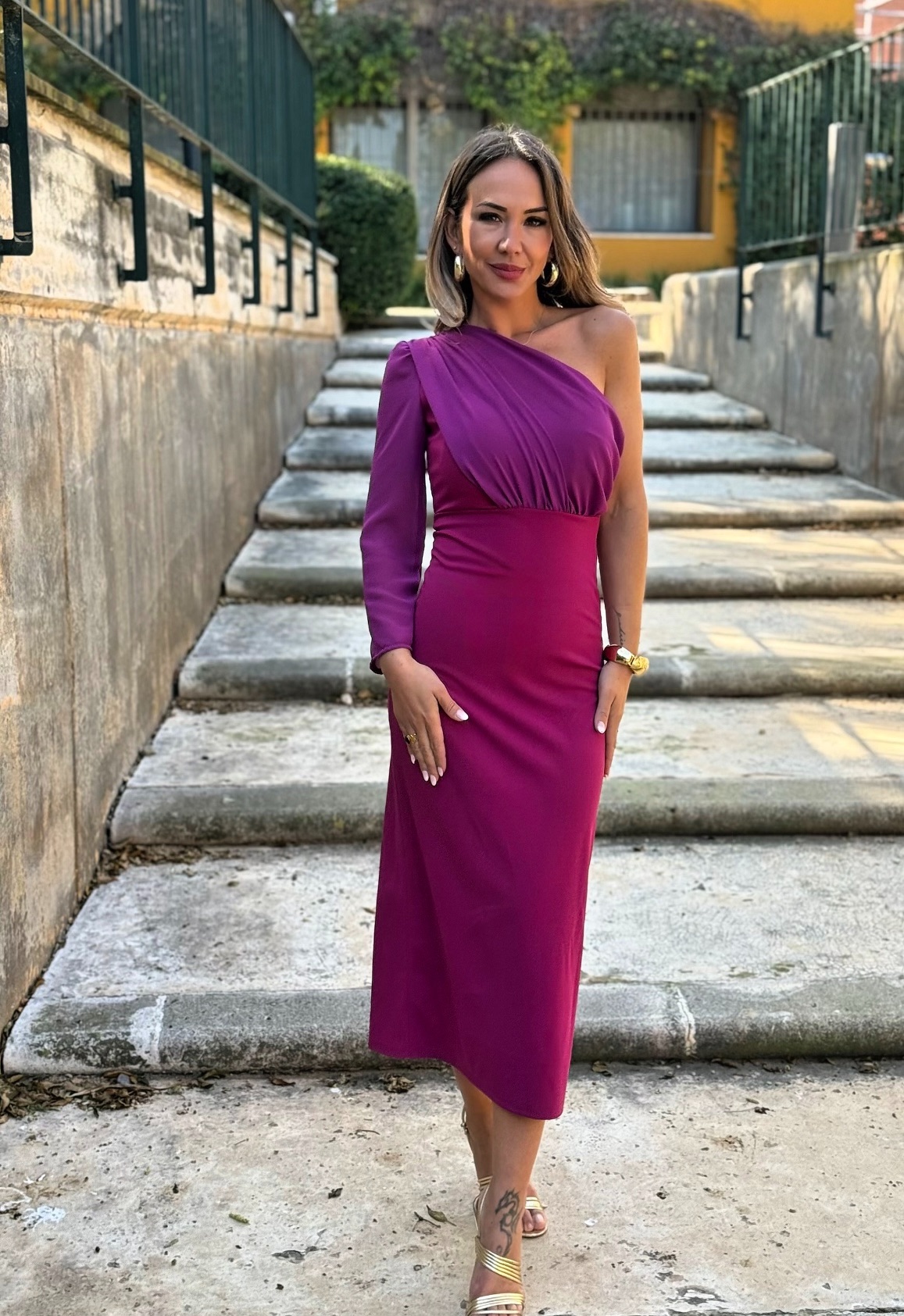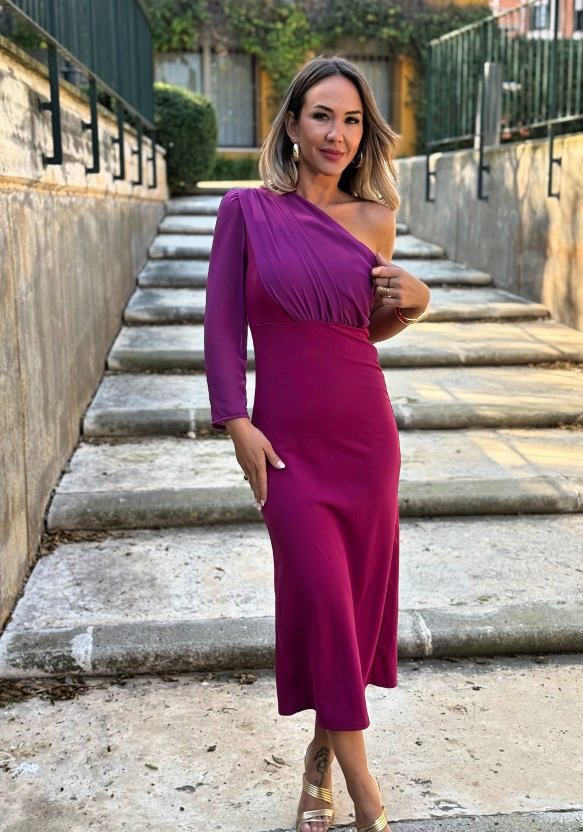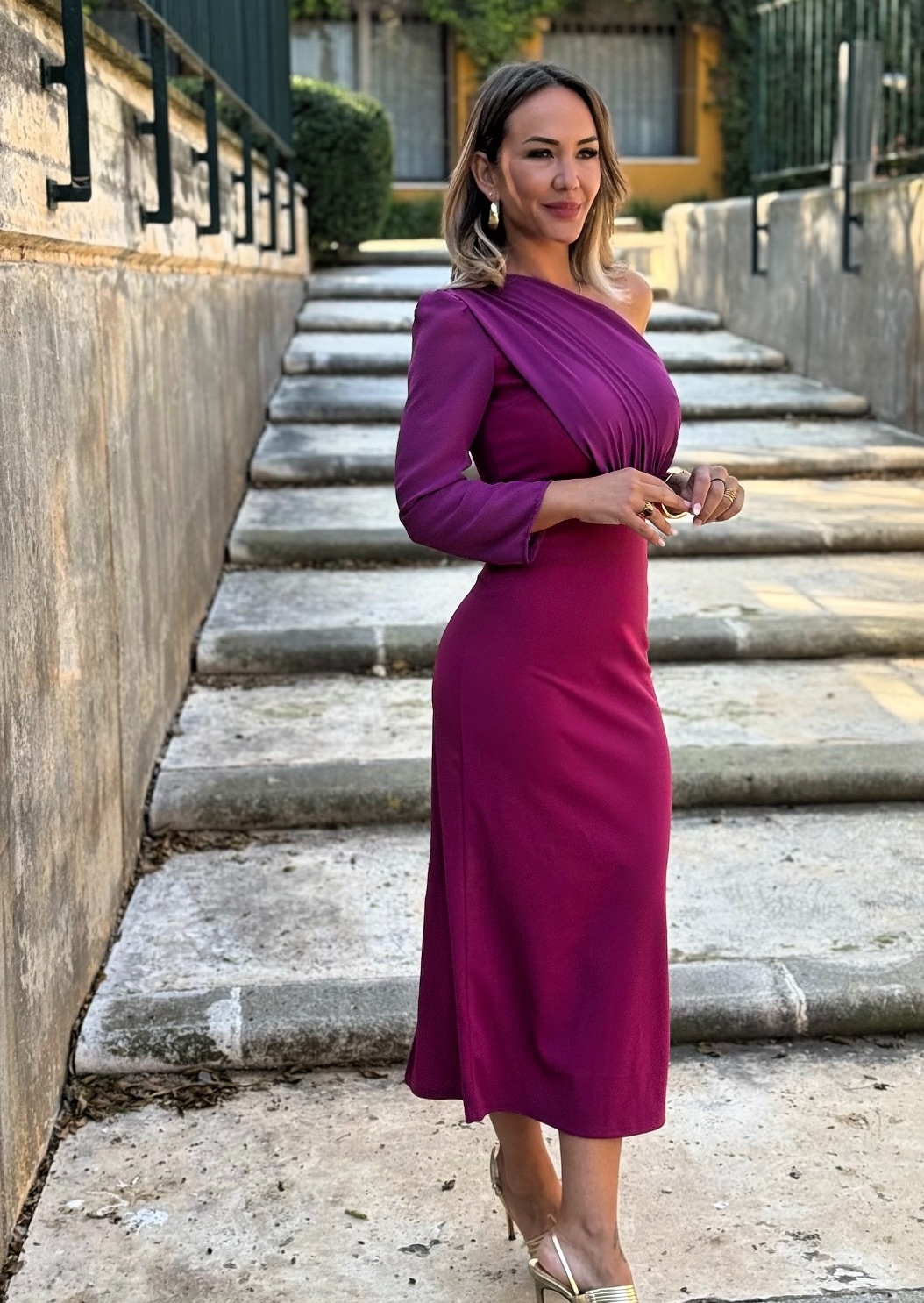 Vestido midi asimétrica drapeado con gasa en parte superior y manga, corte detrás, cremallera lateral.
