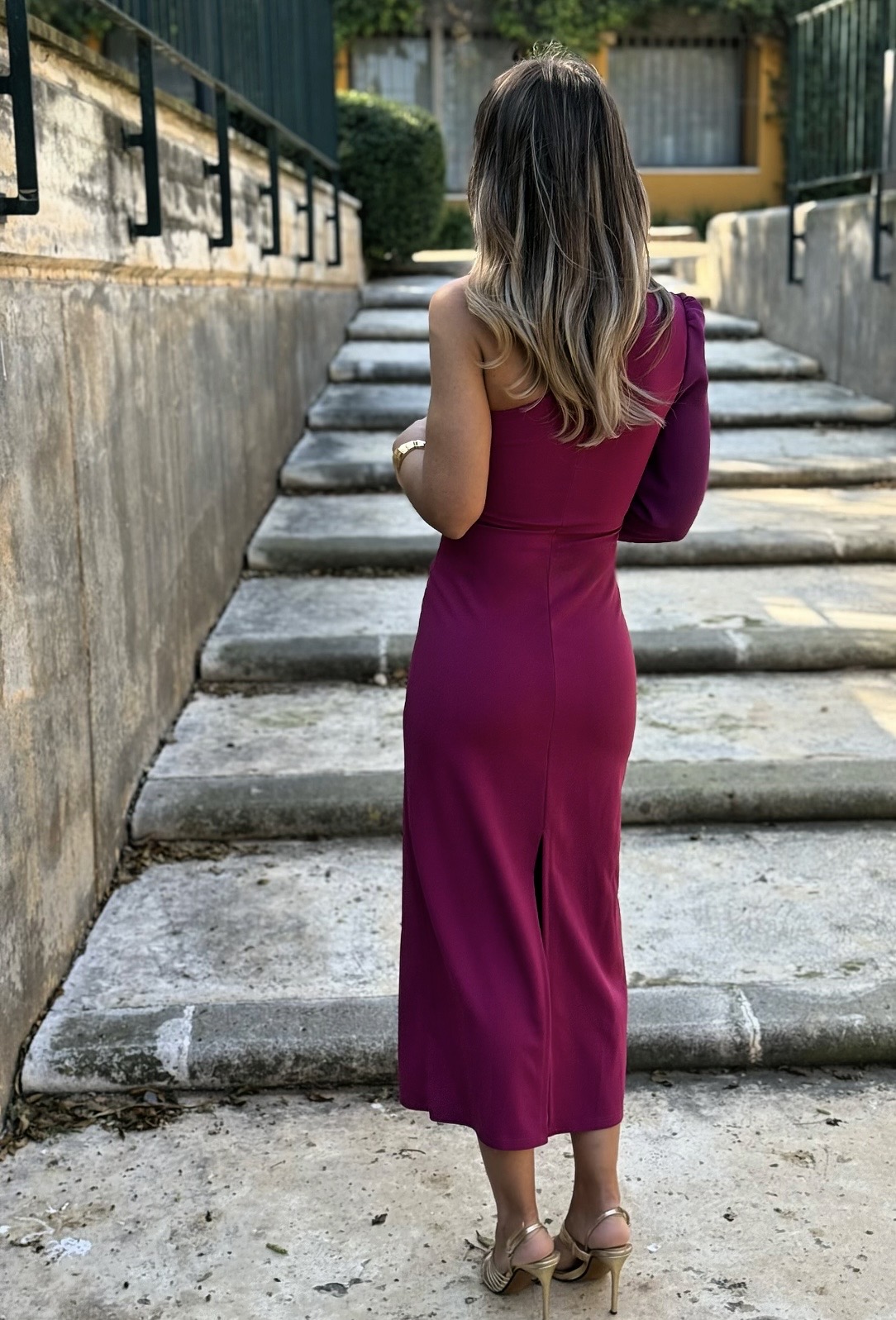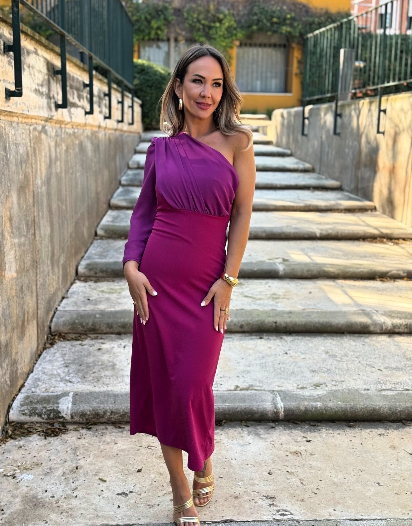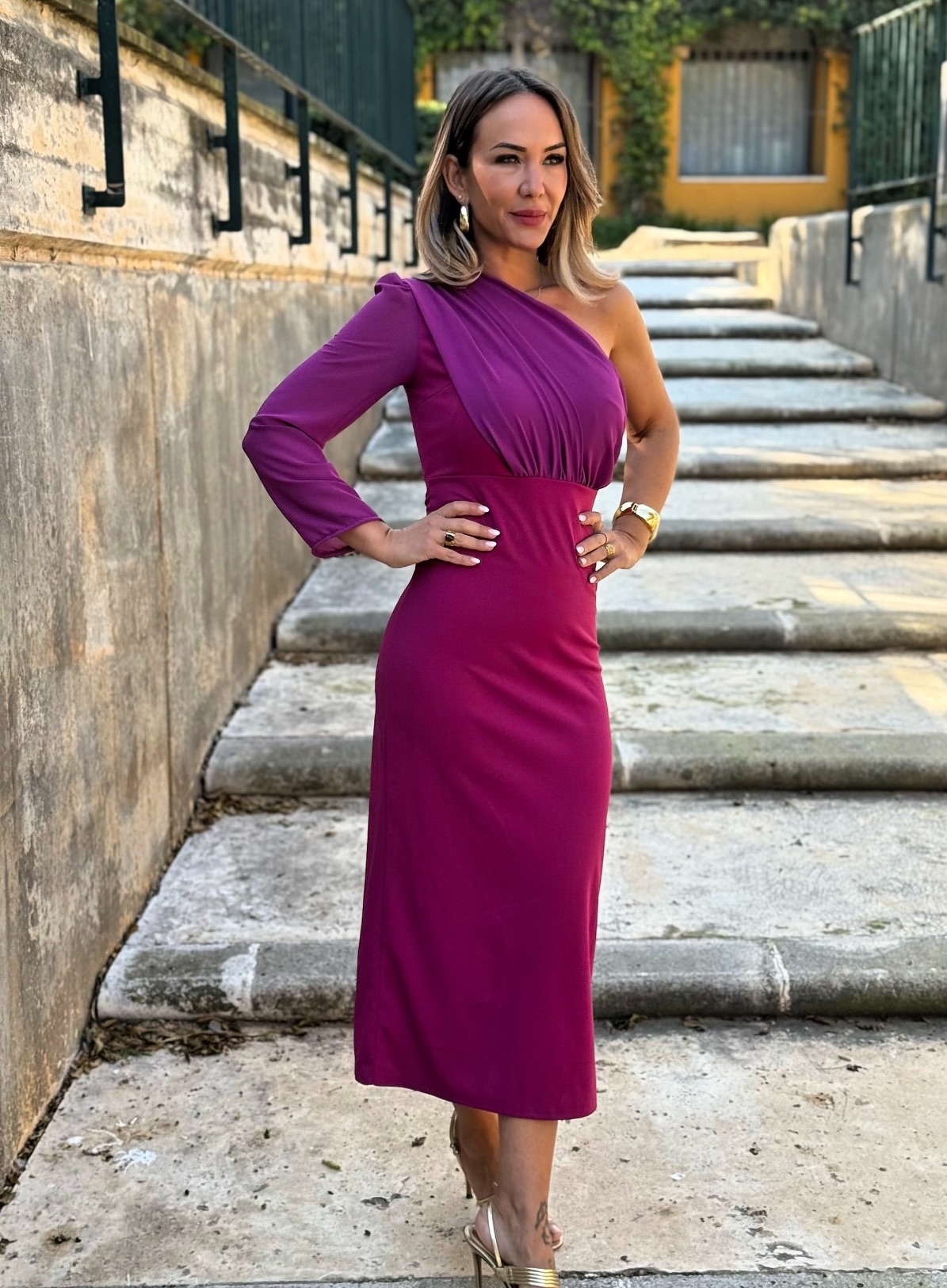 Vestido midi asimétrica drapeado con gasa en parte superior y manga, corte detrás, cremallera lateral.