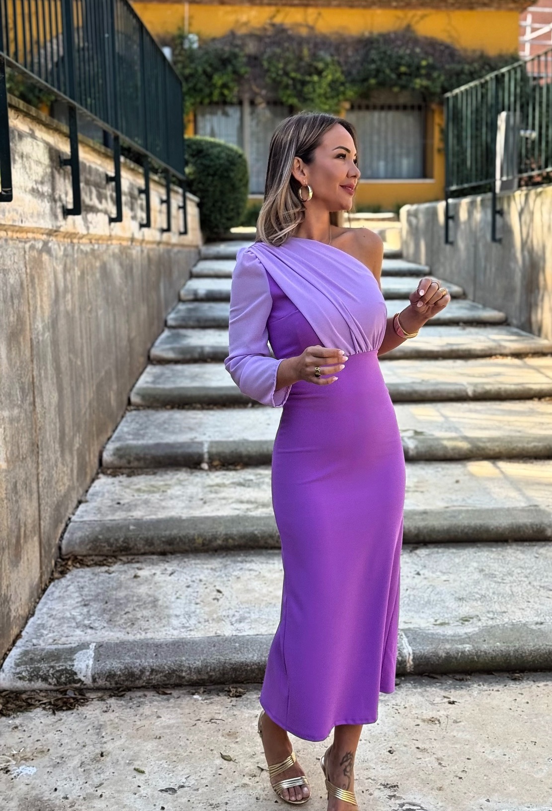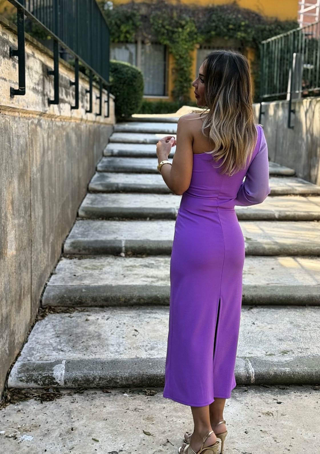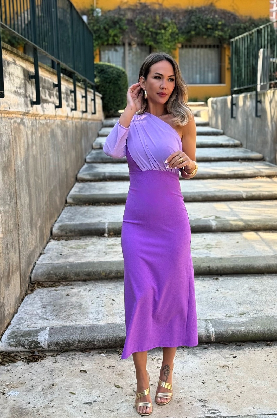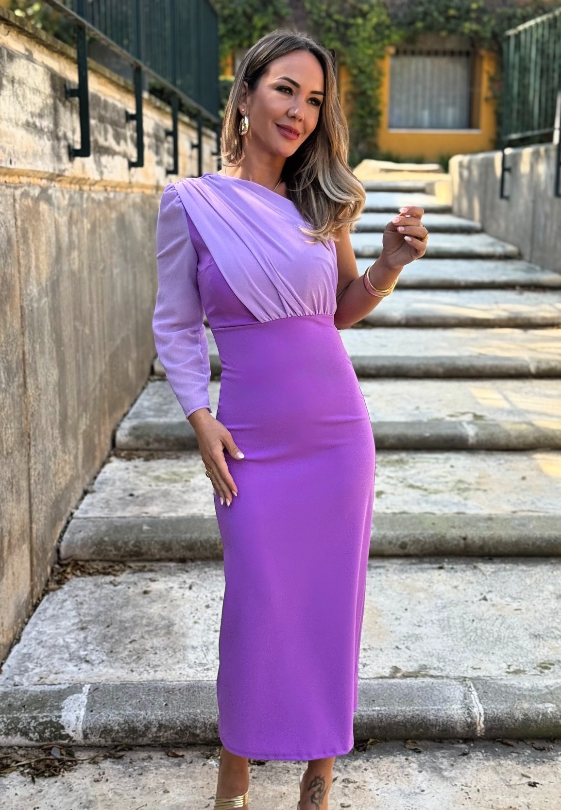 Vestido midi asimétrica drapeado con gasa en parte superior y manga, corte detrás, cremallera lateral.