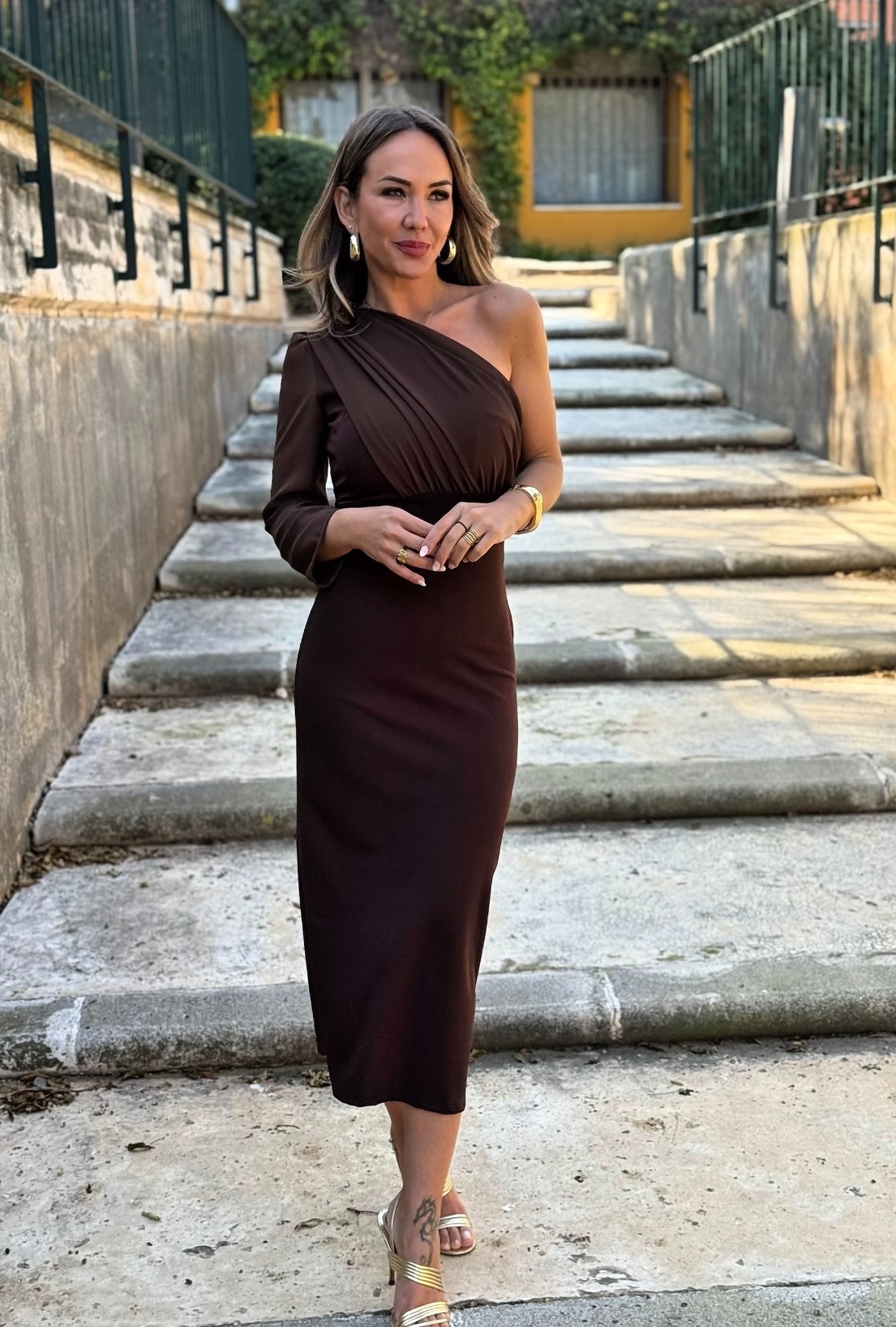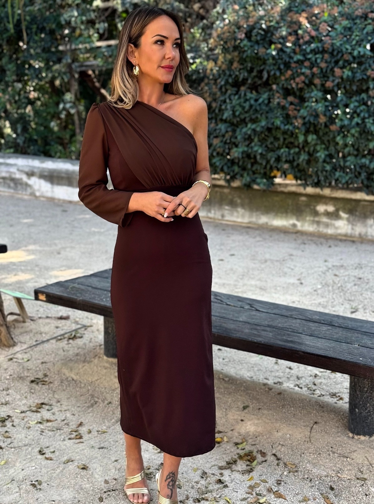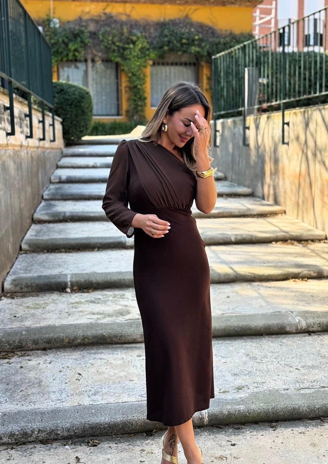 Vestido midi asimétrica drapeado con gasa en parte superior y manga, corte detrás, cremallera lateral.