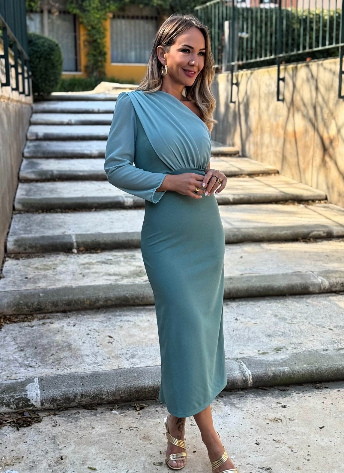 Vestido midi asimétrica drapeado con gasa en parte superior y manga, corte detrás, cremallera lateral.