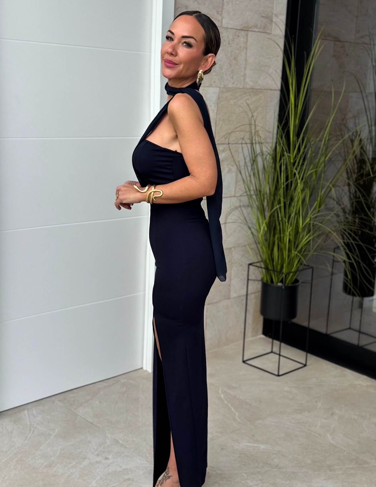 Vestido midi palabra de honor, corte lateral central, cremallera en espalda y detalle fular gasa en cuello.