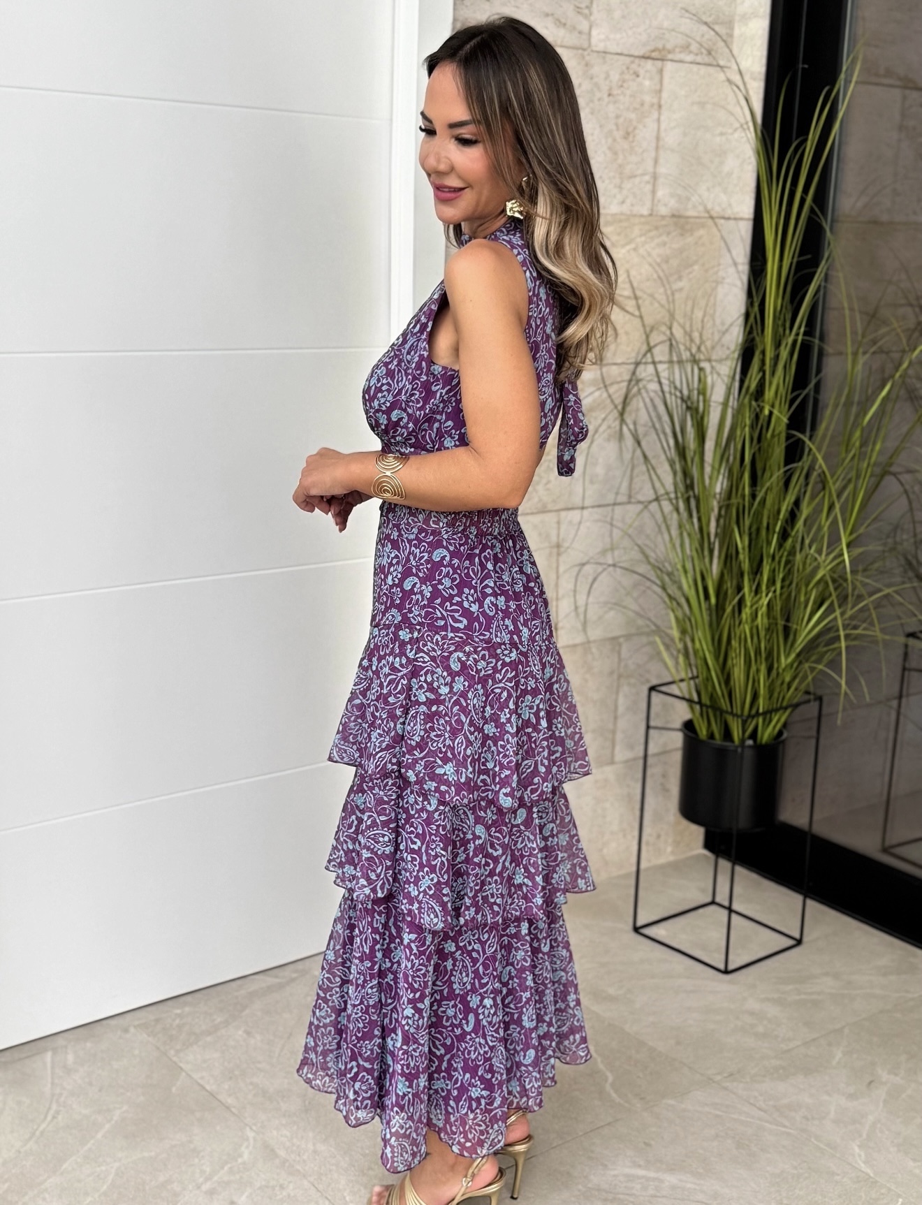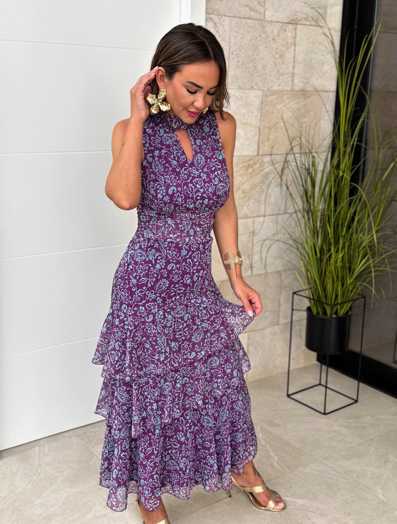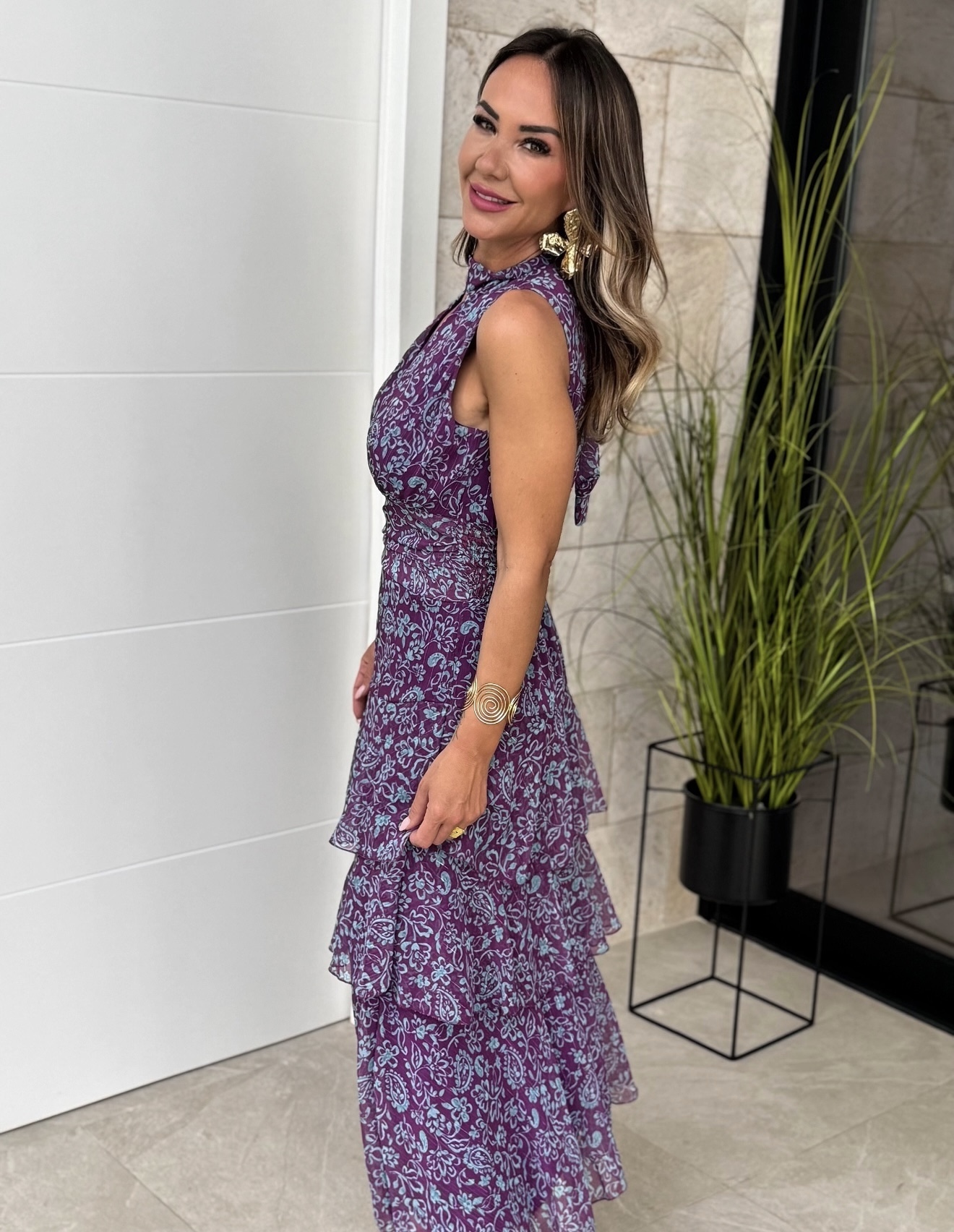 Vestido cuello subido con cut out en pecho y lazada en espalda, engomado en cintura y volantes grandes.