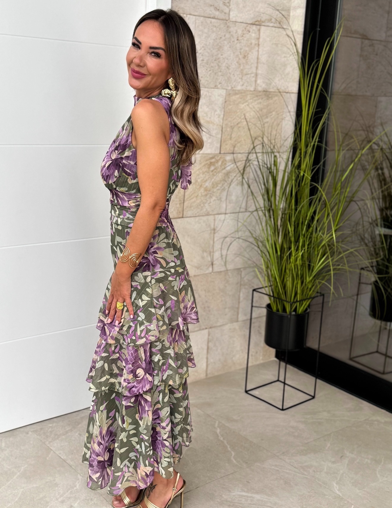 Vestido Gasa Volantes Estampado Verde