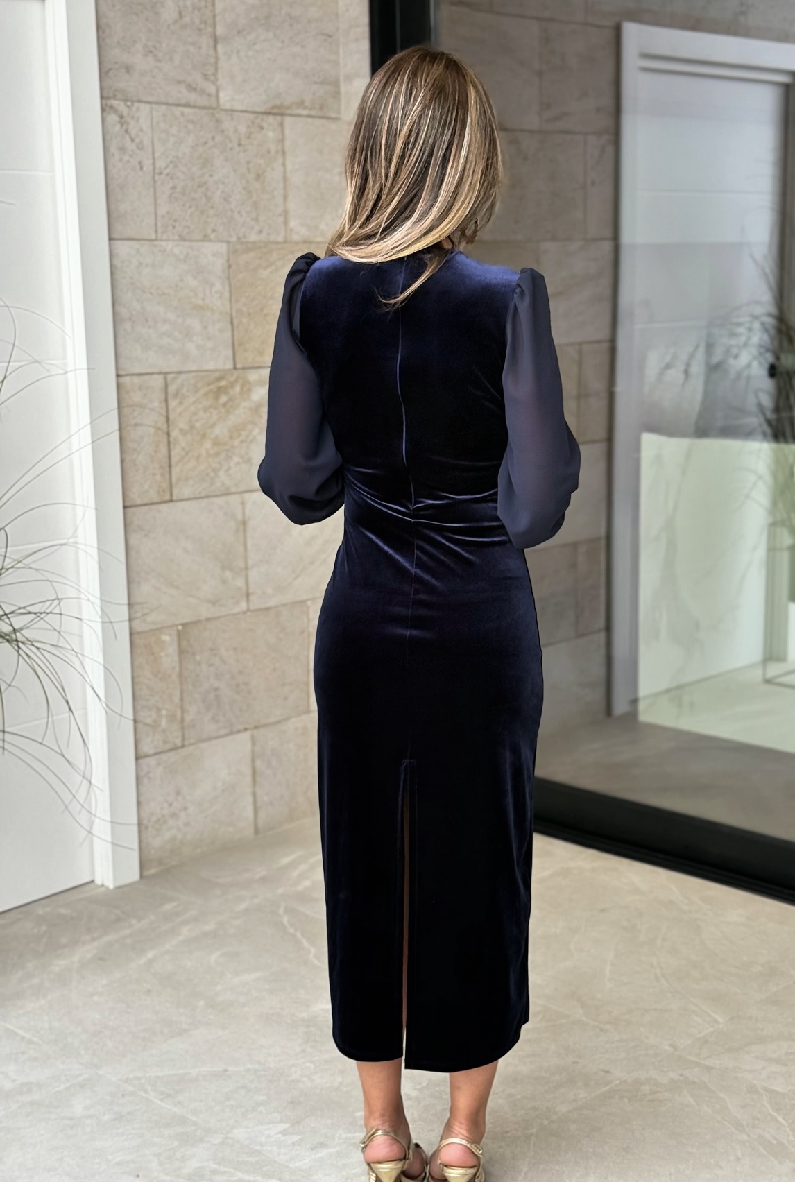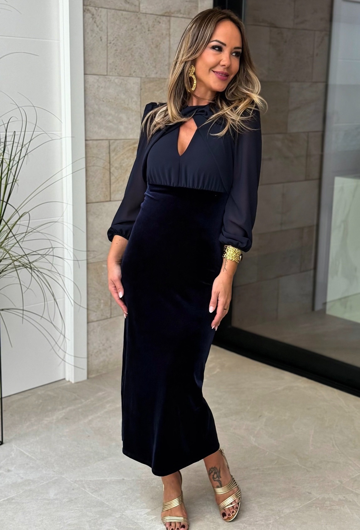 Vestido midi mangas gasa cut out en pecho y falda de terciopelo, cremallera y corte detrás.