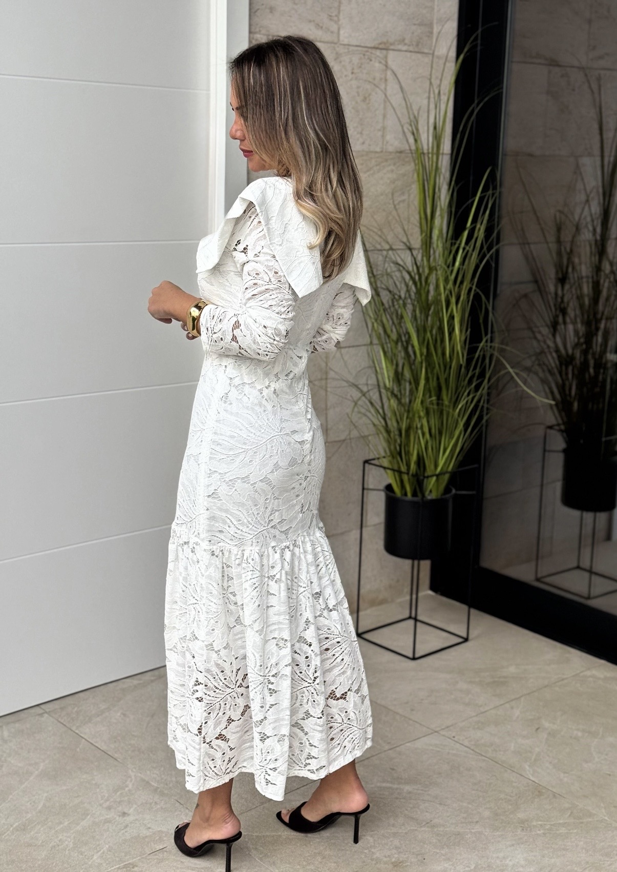 Vestido midi calado con manga larga y solapas en hombros, cremallera detrás y forro.