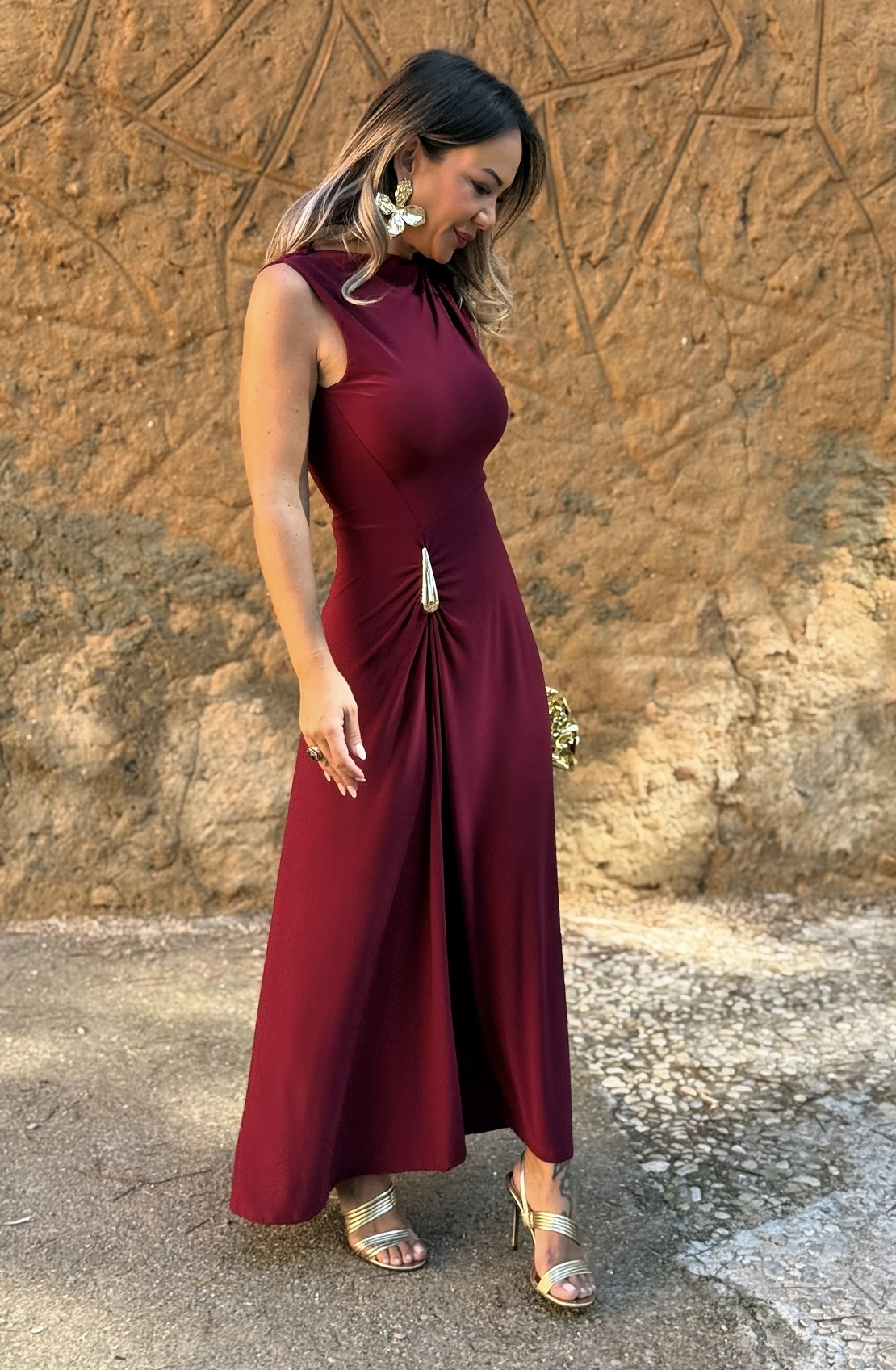 Vestido largo sin mangas falda capada con detalle gotas doradas en hombro y cintura.