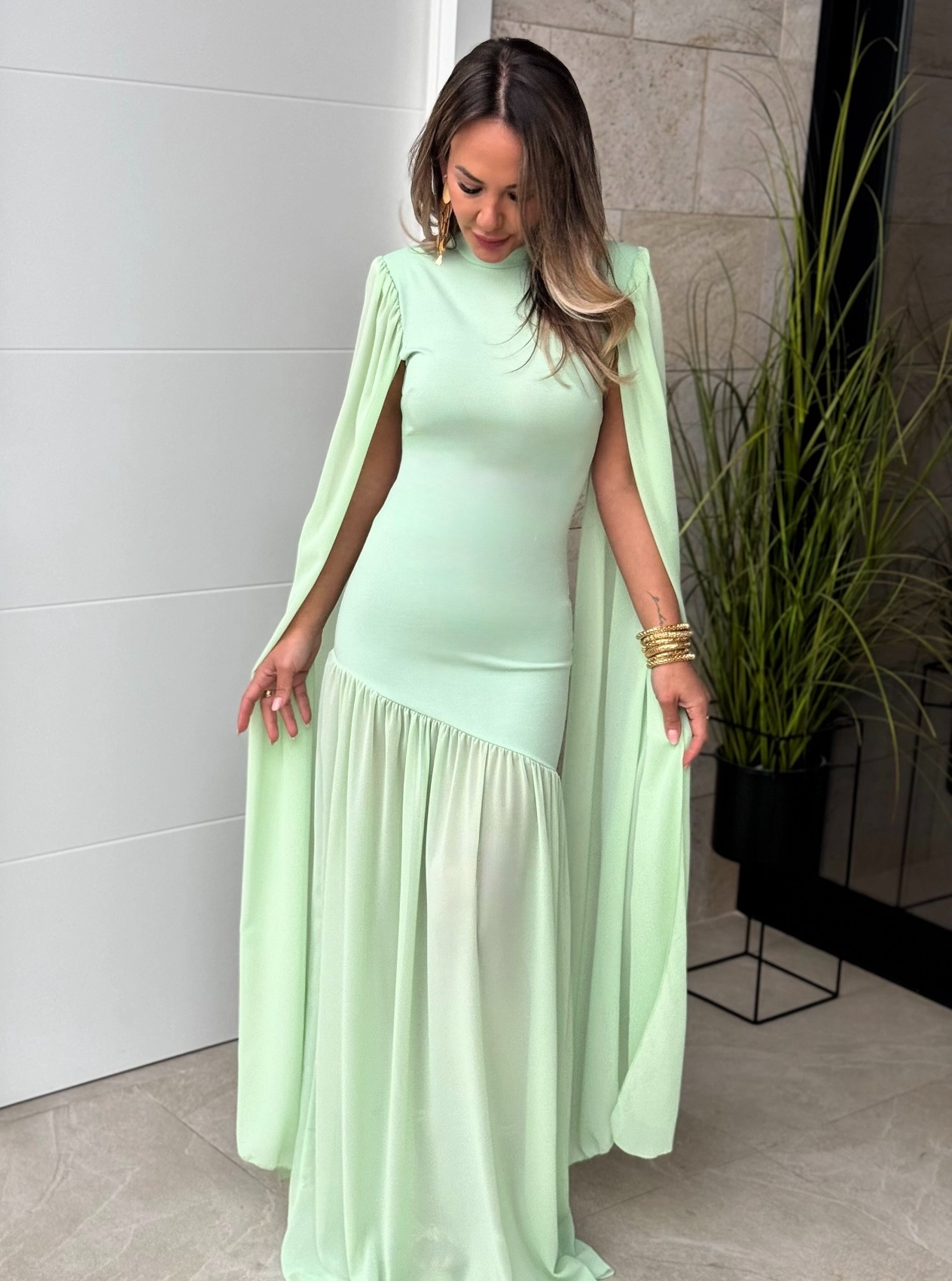 Vestido largo entallado mangas largas abiertas y falda de gasa transparente, cremallera en espalda.