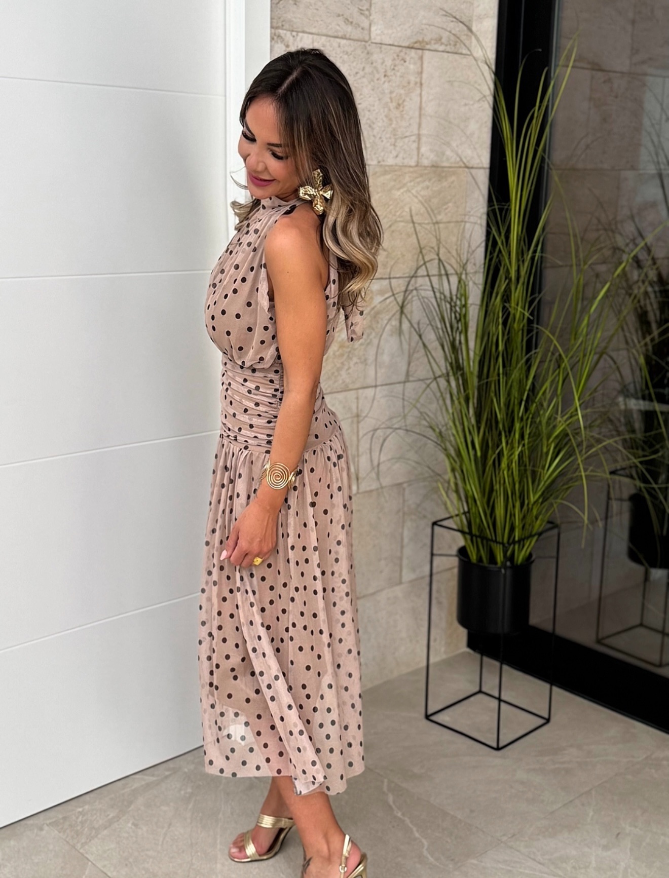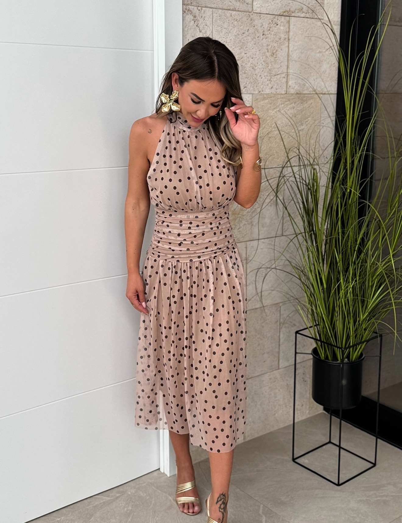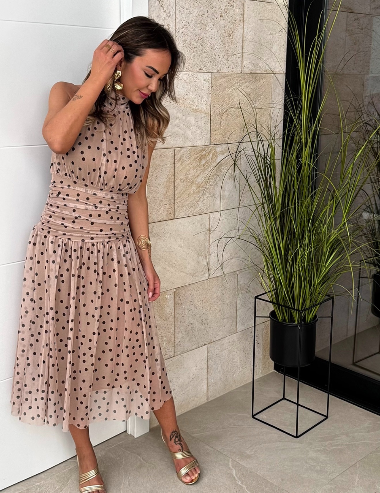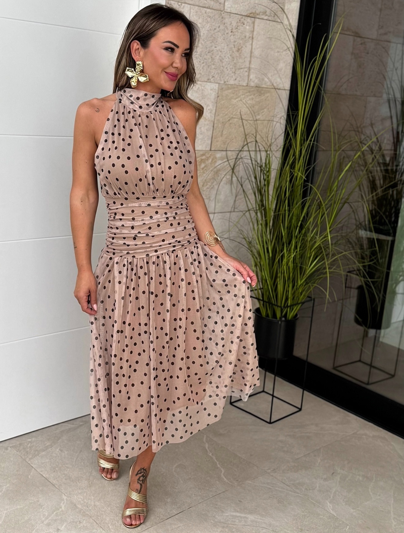 Vestido midi cuello halter lazada en espalda con fruncido en cintura, gasa con forro bajo.