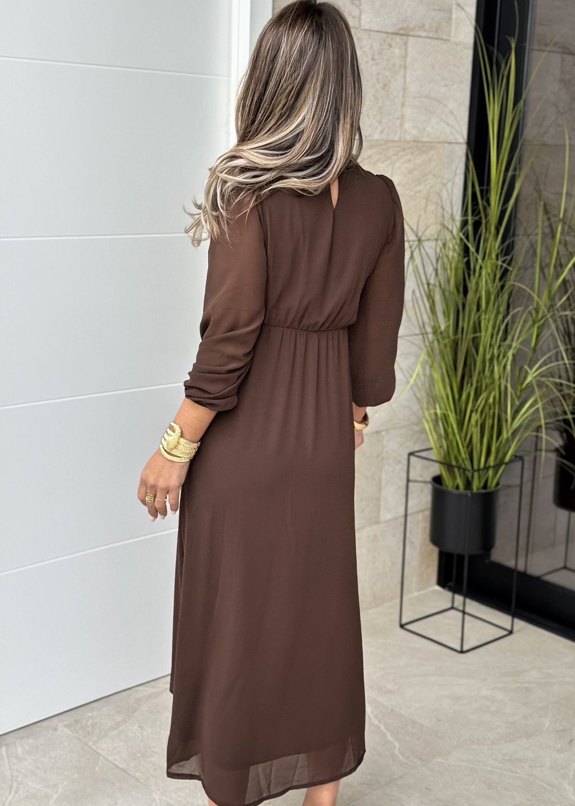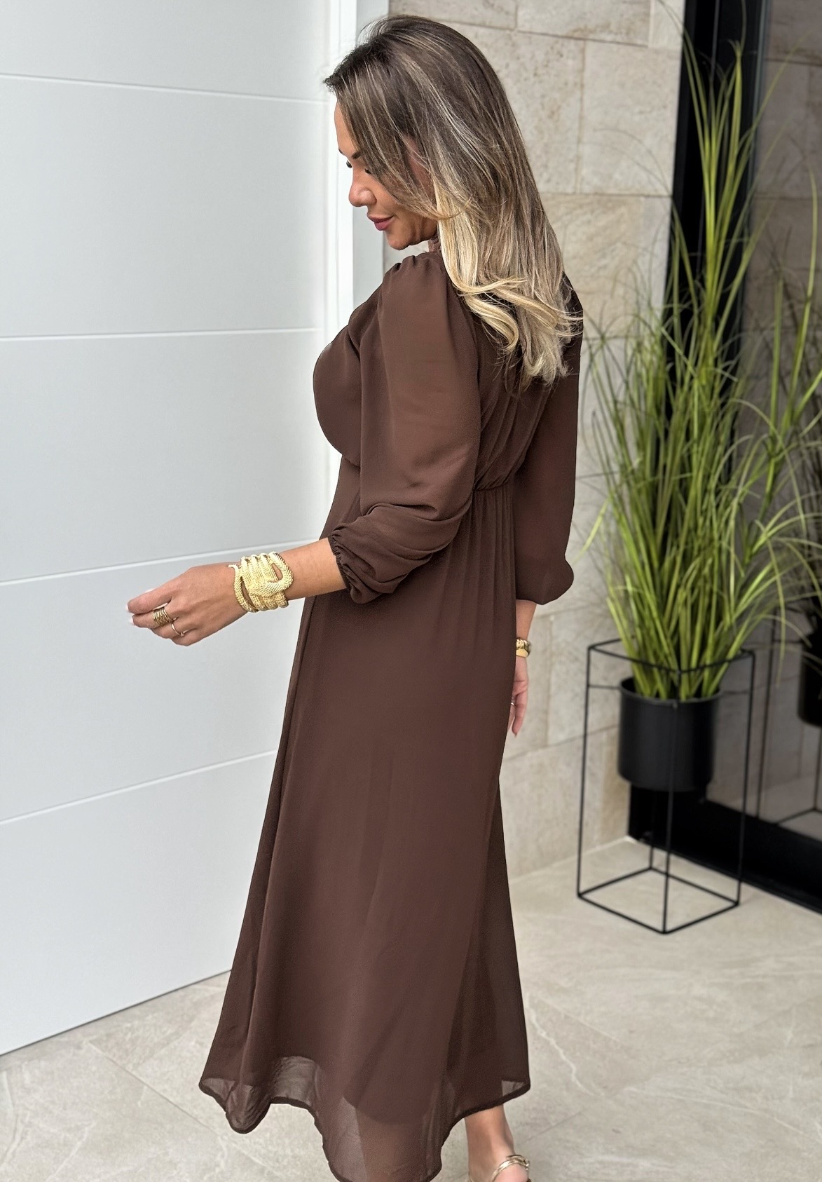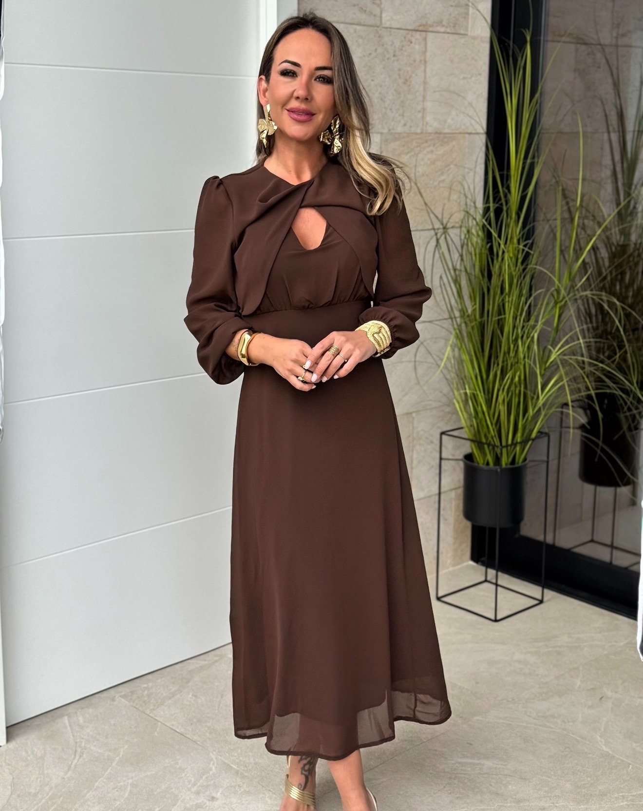 Vestido largo manga larga cuello redondo detalle cut out en pecho y goma en cintura, tejido fino gasa con forro bajo.
