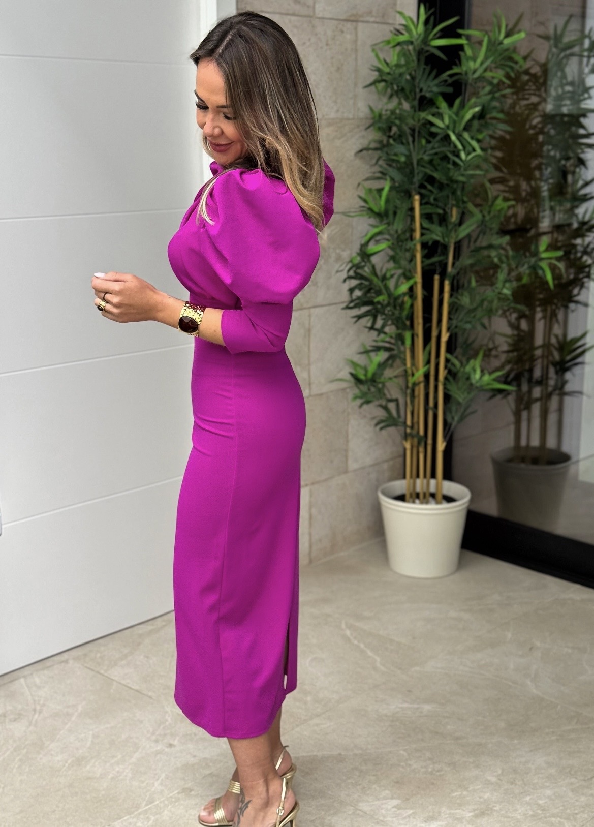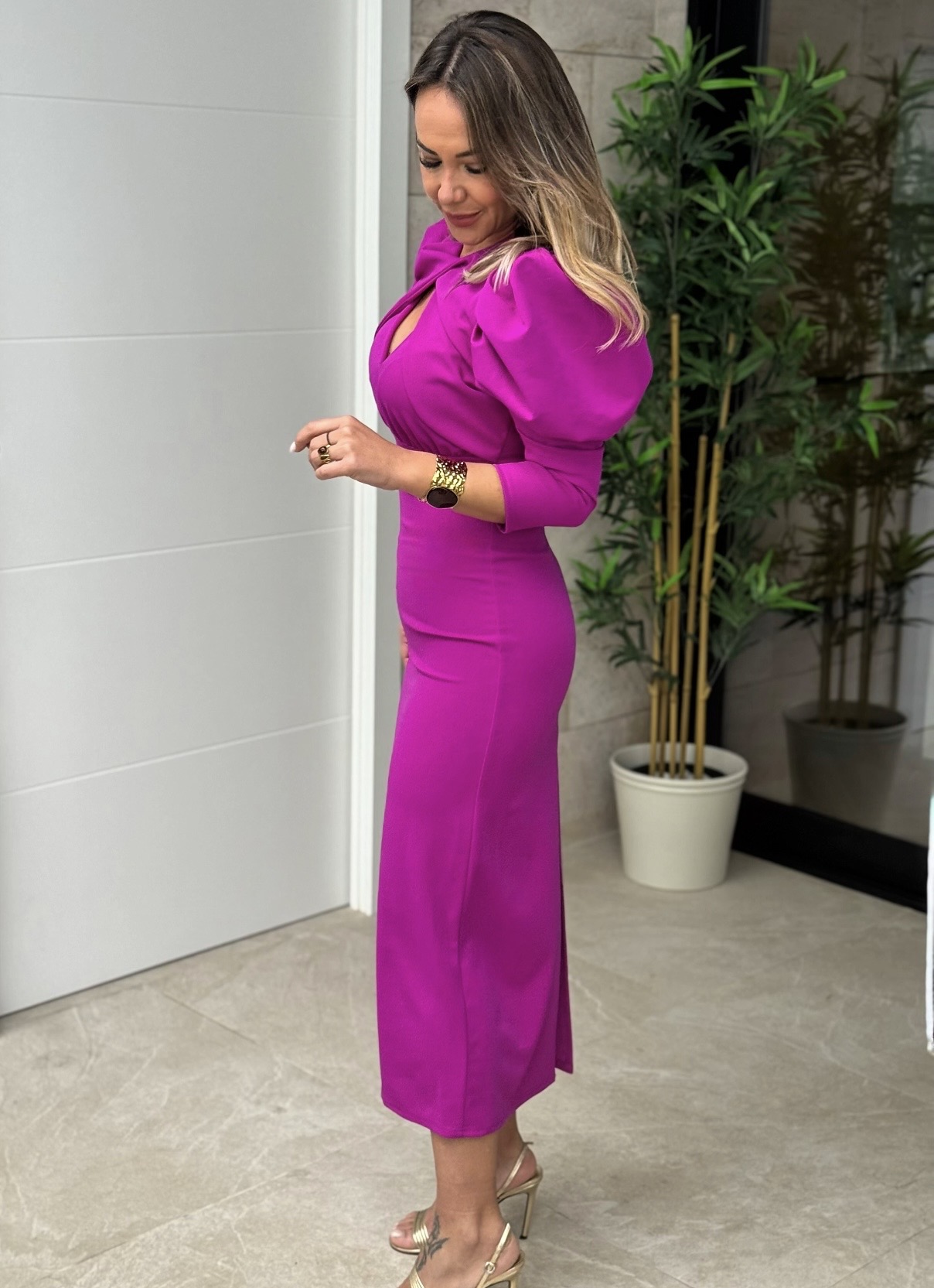 Vestido midi manga larga abullonada, detalle abertura pecho, cremallera y corte detrás.