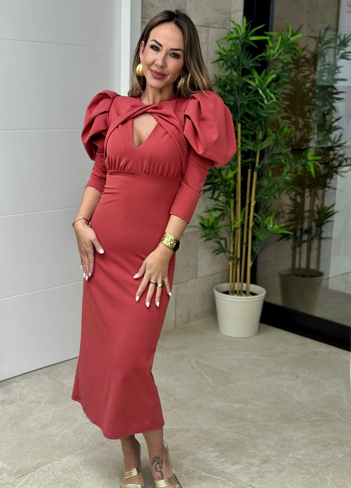 Vestido midi manga larga abullonada, detalle abertura pecho, cremallera y corte detrás.
