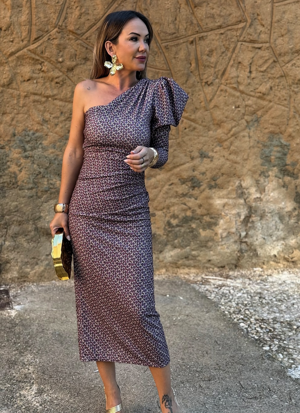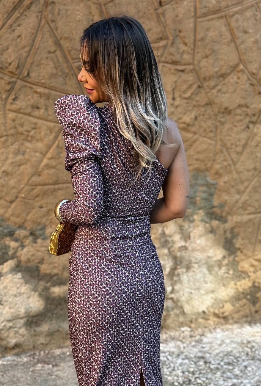 Vestido midi asimetrico una manga abullonada, cremallera lateral y corte detras.