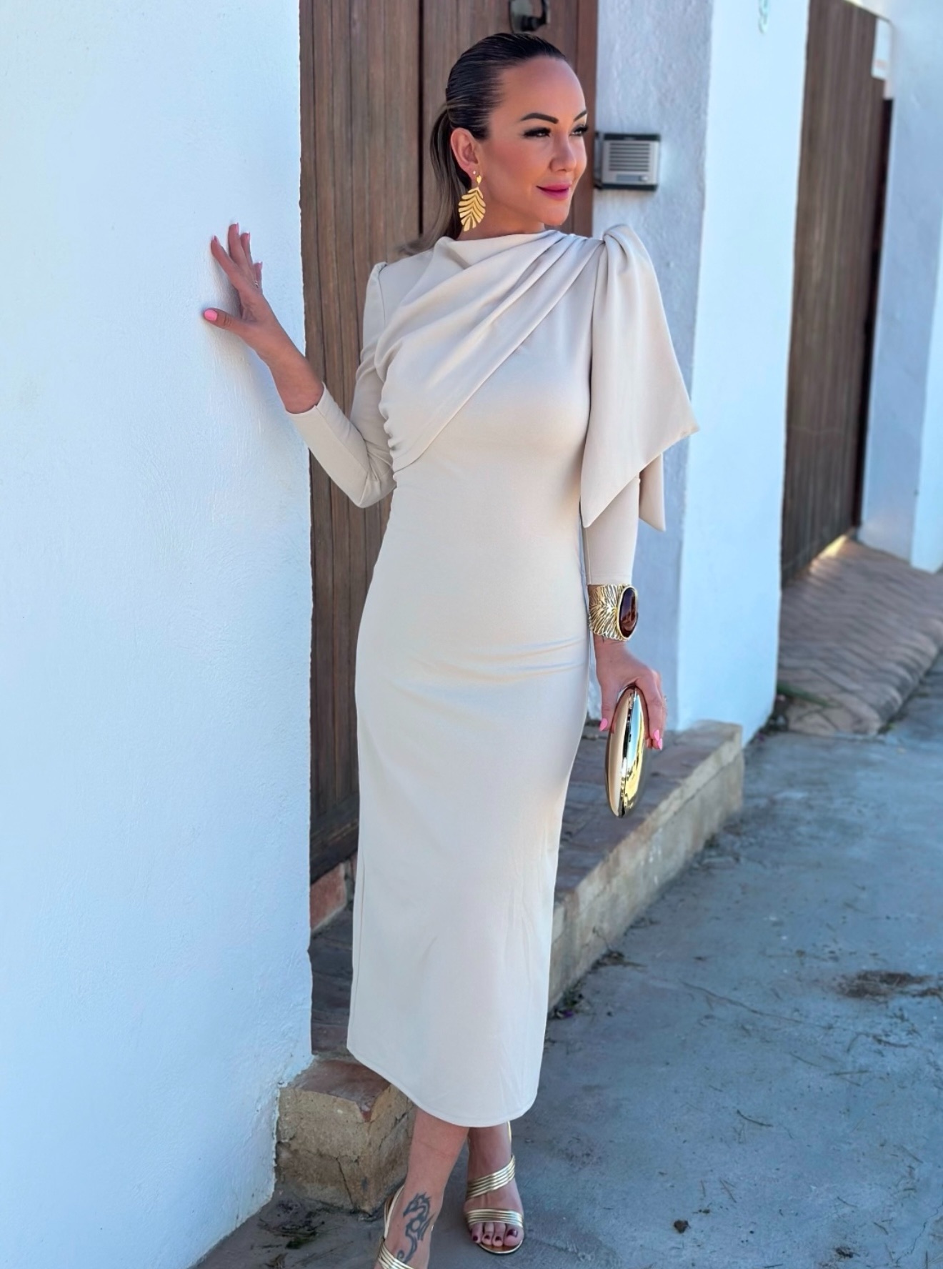 Vestido midi manga larga cuello redondo con corte y cremallera detrás, detalle lazada en hombro.