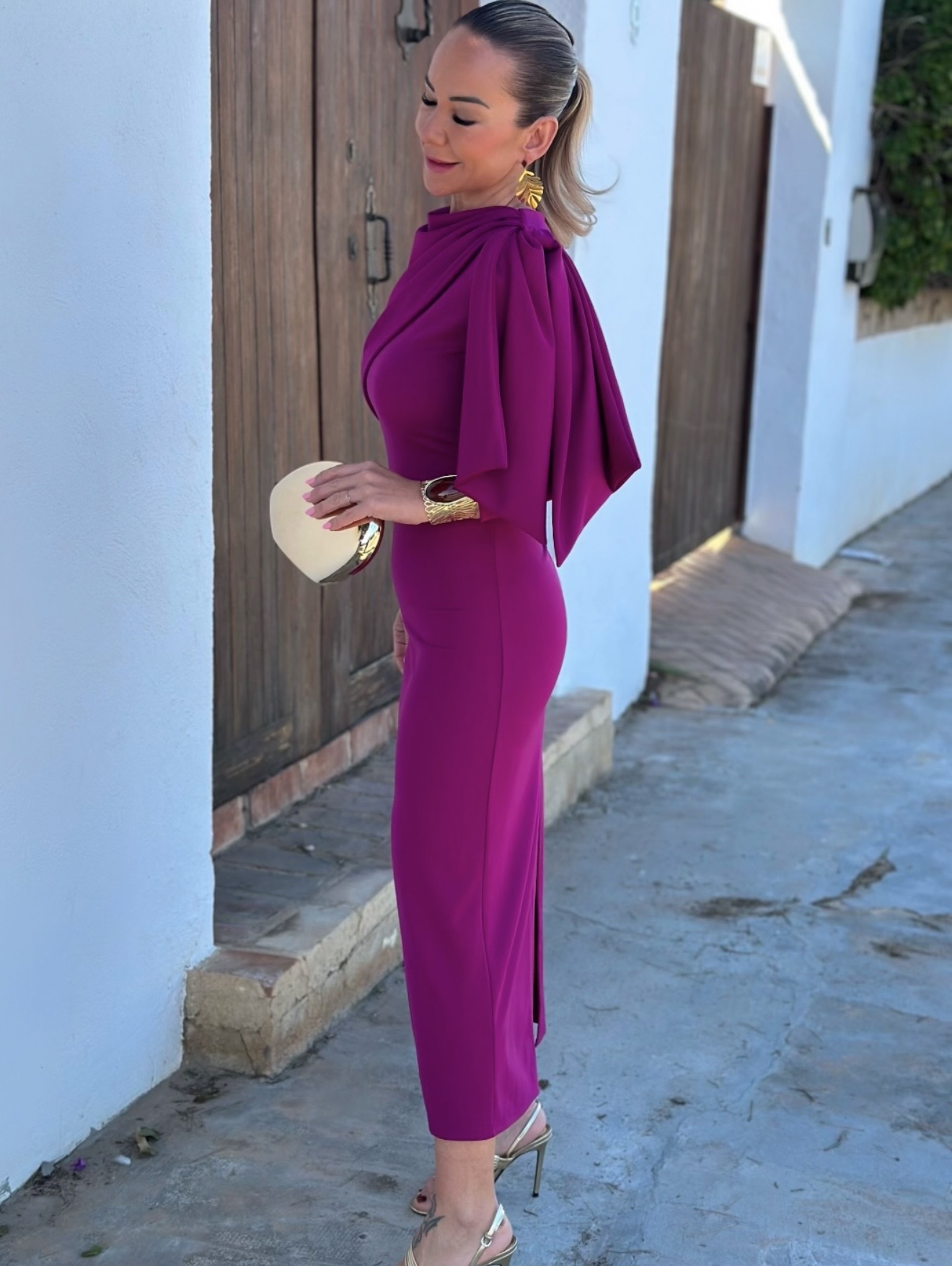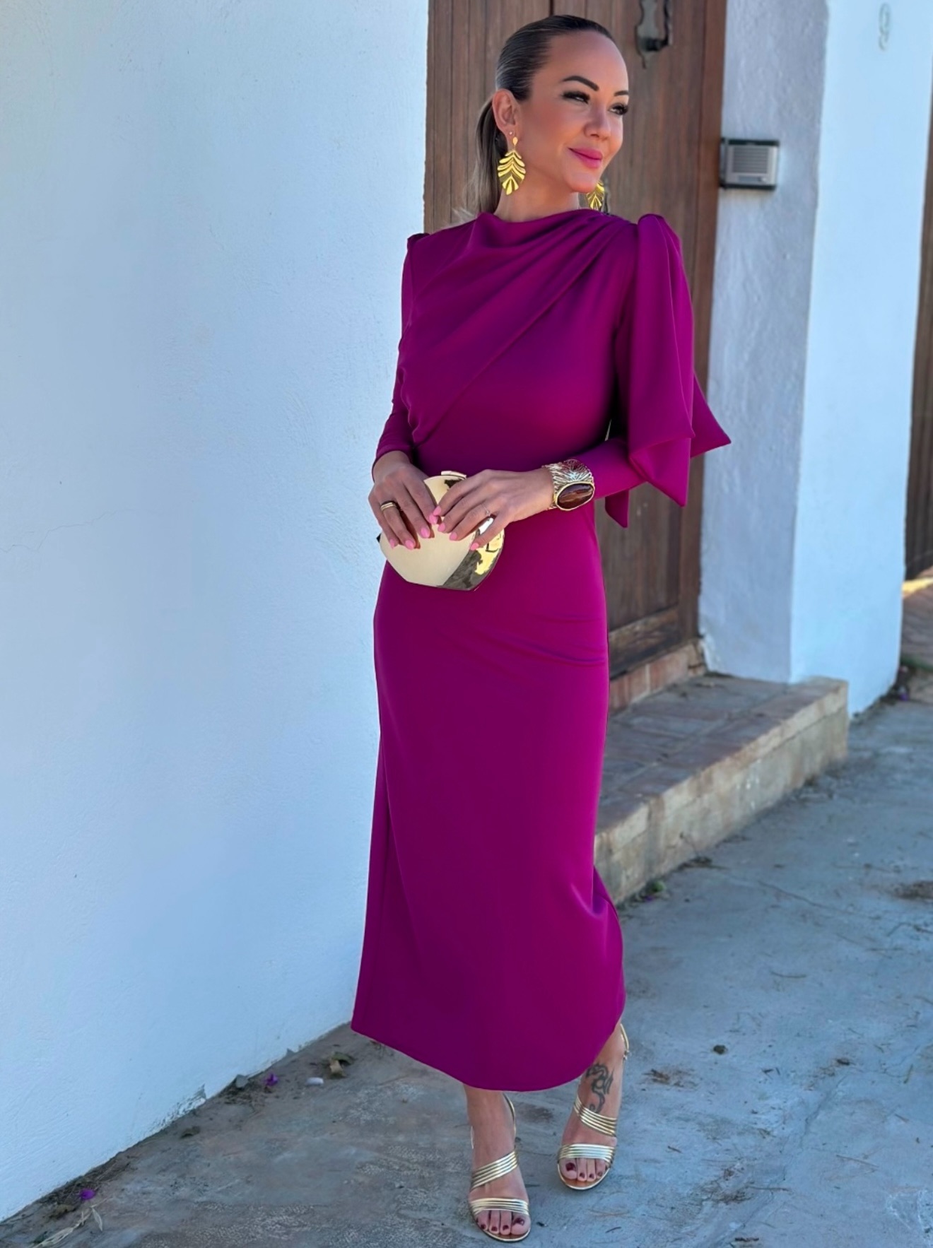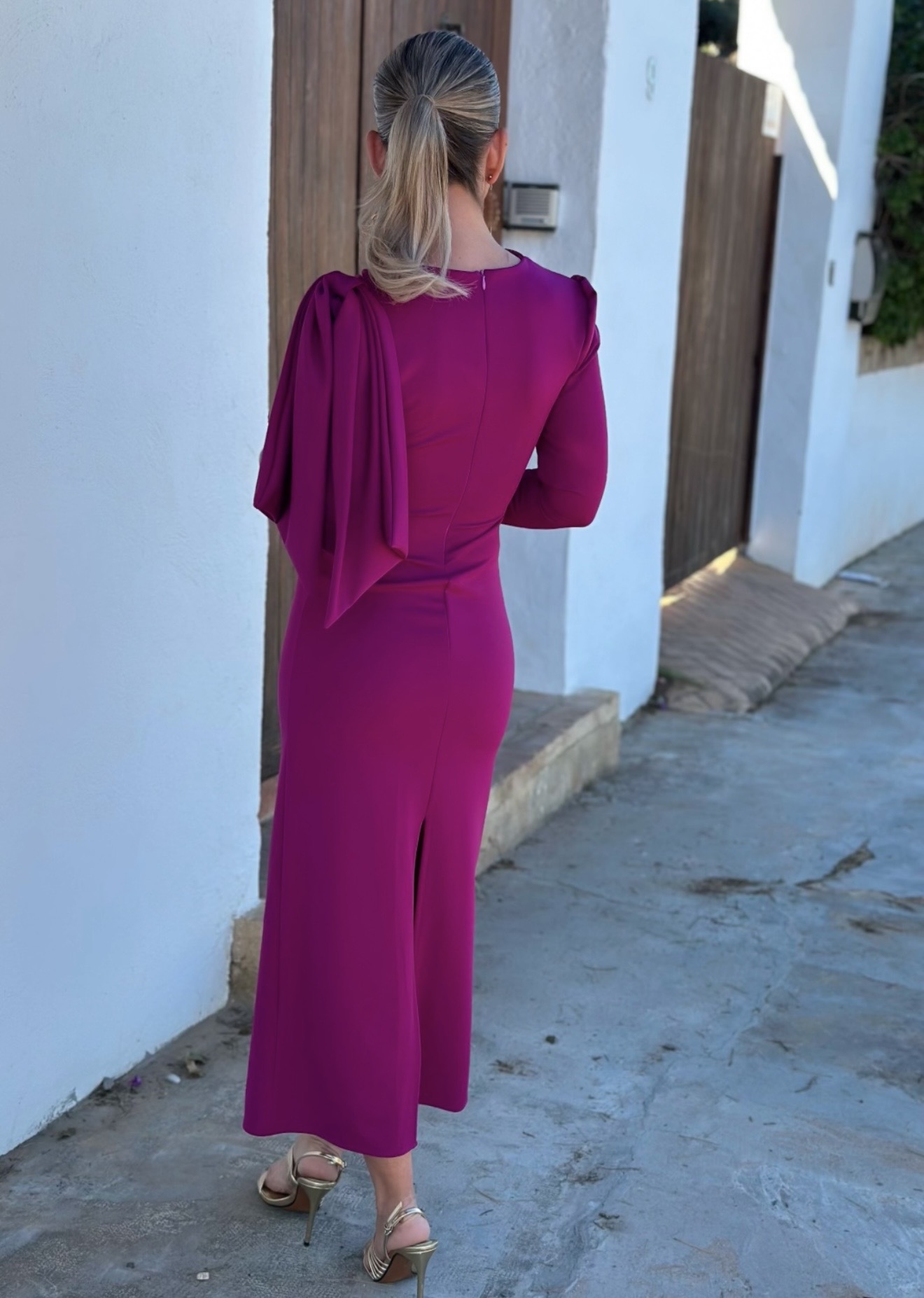 Vestido midi manga larga cuello redondo con corte y cremallera detrás, detalle lazada en hombro.