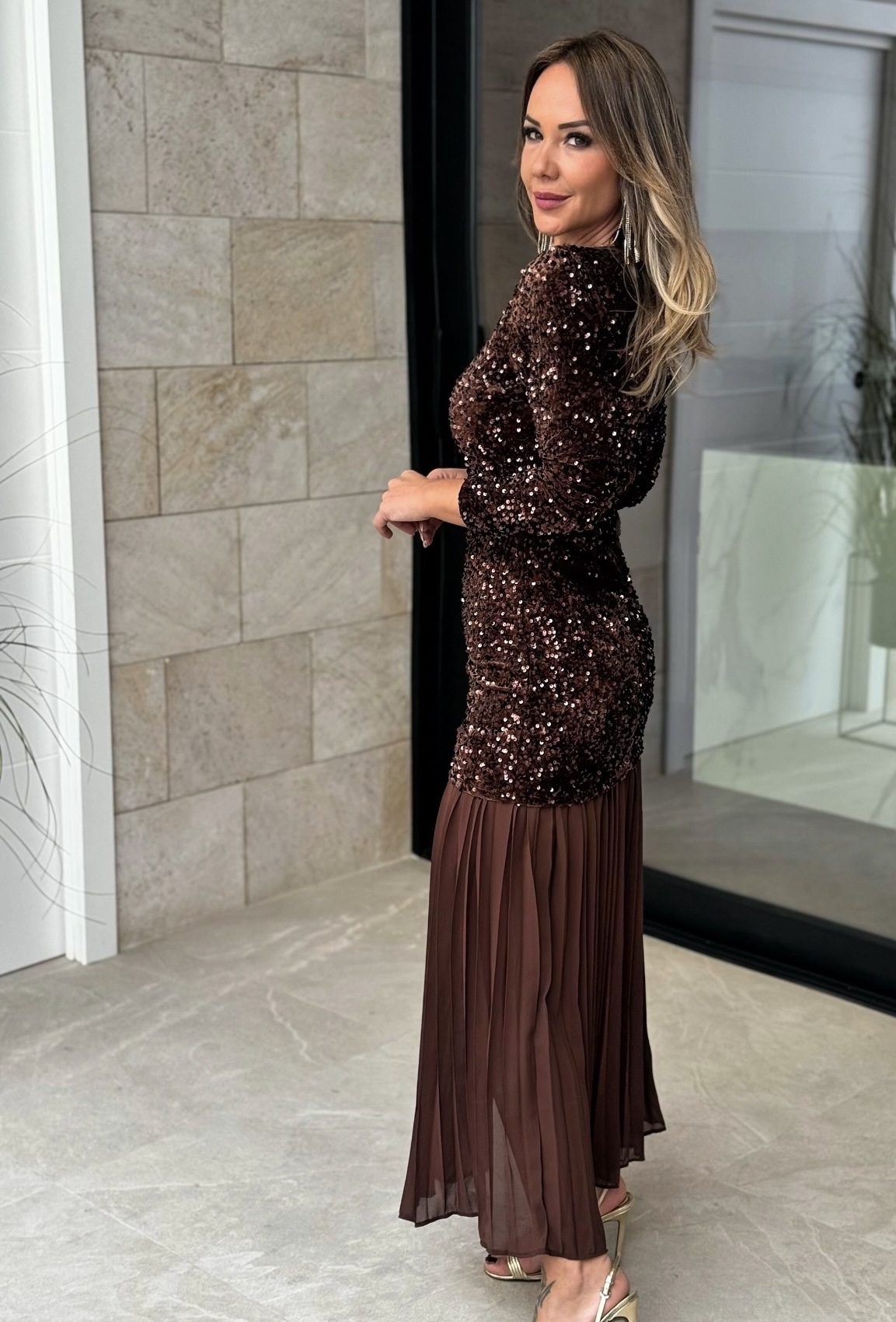 Vestido largo manga larga cuello redondo de lentejuela con forro y falda plisada gasa.