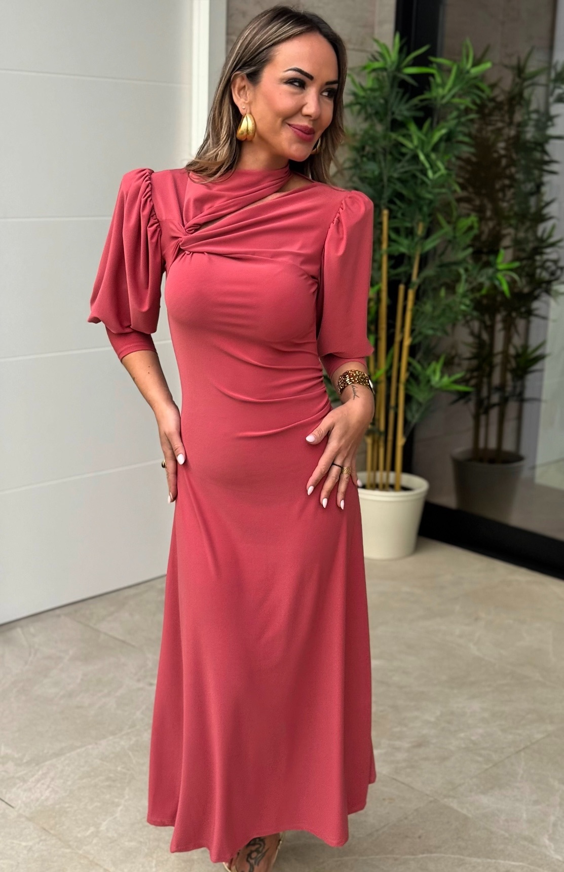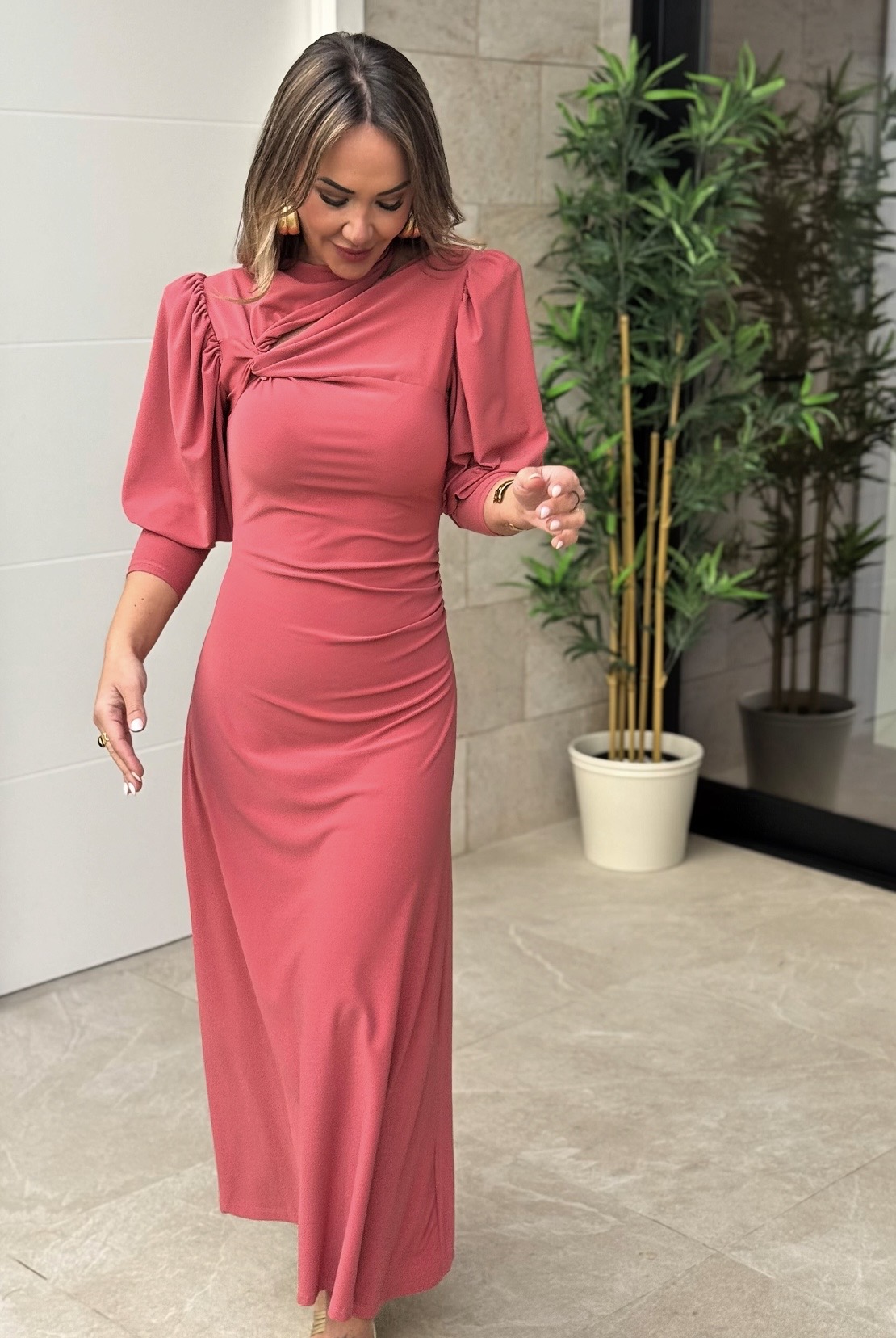 Vestido largo con detalle nudo en pecho y abertura, media manga con puño.
